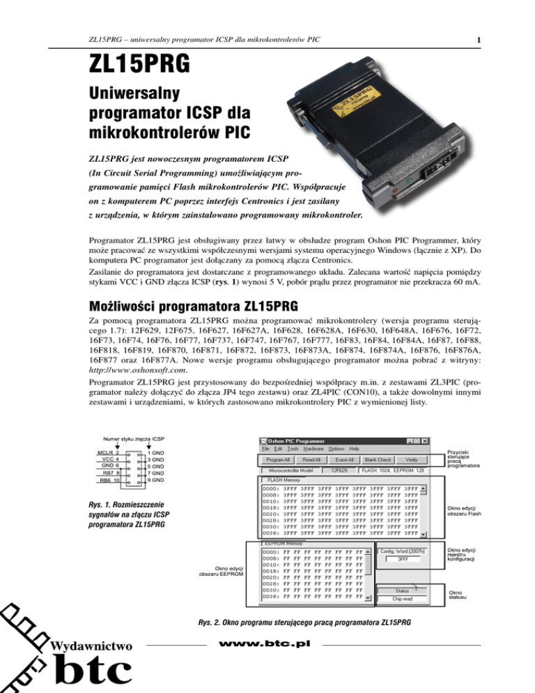 ZL15PRG – uniwersalny programator ICSP dla mikrokontrolerów PIC 1 ZL15PRG Uniwersalny programator ICSP dla mikrokontrolerów PIC ZL15PRG jest nowoczesnym programatorem ICSP (In Circuit Serial Programming) umożliwiającym programowanie pamięci Flash mikrokontrolerów PIC. Współpracuje on z komputerem PC poprzez interfejs Centronics i jest zasilany z urządzenia, w którym zainstalowano programowany mikrokontroler. Programator ZL15PRG jest obsługiwany przez łatwy w obsłudze program Oshon PIC Programmer, który może pracować ze wszystkimi współczesnymi wersjami systemu operacyjnego Windows (łącznie z XP). Do komputera PC programator jest dołączany za pomocą złącza Centronics. Zasilanie do programatora jest dostarczane z programowanego układu. Zalecana wartość napięcia pomiędzy stykami VCC i GND złącza ICSP (rys. 1) wynosi 5 V, pobór prądu przez programator nie przekracza 60 mA. Możliwości programatora ZL15PRG Za pomocą programatora ZL15PRG można programować mikrokontrolery (wersja programu sterującego 1.7): 12F629, 12F675, 16F627, 16F627A, 16F628, 16F628A, 16F630, 16F648A, 16F676, 16F72, 16F73, 16F74, 16F76, 16F77, 16F737, 16F747, 16F767, 16F777, 16F83, 16F84, 16F84A, 16F87, 16F88, 16F818, 16F819, 16F870, 16F871, 16F872, 16F873, 16F873A, 16F874, 16F874A, 16F876, 16F876A, 16F877 oraz 16F877A. Nowe wersje programu obsługującego programator można pobrać z witryny: http://www.oshonsoft.com. Programator ZL15PRG jest przystosowany do bezpośredniej współpracy m.in. z zestawami ZL3PIC (programator należy dołączyć do złącza JP4 tego zestawu) oraz ZL4PIC (CON10), a także dowolnymi innymi zestawami i urządzeniami, w których zastosowano mikrokontrolery PIC z wymienionej listy. Rys. 1. Rozmieszczenie sygnałów na złączu ICSP programatora ZL15PRG Rys. 2. Okno programu sterującego pracą programatora ZL15PRG www.btc.pl 2 ZL15PRG – uniwersalny programator ICSP dla mikrokontrolerów PIC Rys. 3. Wybór programowanego mikrokontrolera ułatwia lista wyświetlana po wybraniu w menu Options>Change Microcontroller Model Obsługa programatora Pracą ZL15PRG steruje freewareowy program, którego okno pokazano na rys. 2. Obsługa programu jest prosta i sprowadza się w praktyce do wybrania typu programowanego mikrokontrolera (w menu: Options>Change Microcontroller Model) z listy wyświetlanej przez program (rys. 3). Program umożliwia edycję komórek pamięci Flash i EEPROM, umożliwia także programowanie nieulotnego rejestru konfiguracji, przy czym jego zawartość musi być zawarta w pliku HEX (w którym znajduje się także opis zawartości pamięci programu). Wartość wpisywaną do rejestru konfiguracji można zmienić dwukrotnie klikając w miejsce, w którym jest wyświetlana jego aktualna zawartość. Sterowanie pracą programatora umożliwiają przyciski widoczne na rys. 2, można to także robić z poziomu opcji Tools>... menu. Na fot. 4 znajduje się widok tylnej części obudowy programatora, na której umieszczono – oprócz złącza ICPS – także dwie diody świecące. Dioda oznaczona VPP sygnalizuje obecność napięcia programującego na styku 2 (sygnał MCLR/VPP) złącza ICSP, natomiast dioda PWR sygnalizuje obecność napięcia zasilającego o prawidłowej wartości styku 4 złącza ICSP. Fot. 4. Rozmieszczenie i funkcje diod LED oraz umiejscowienie złącza ICSP BTC Korporacja 03-237 Warszawa ul. Inowłodzka 5 fax: (22) 814-13-02 e-mail: [email protected] http://www.btc.pl www.btc.pl