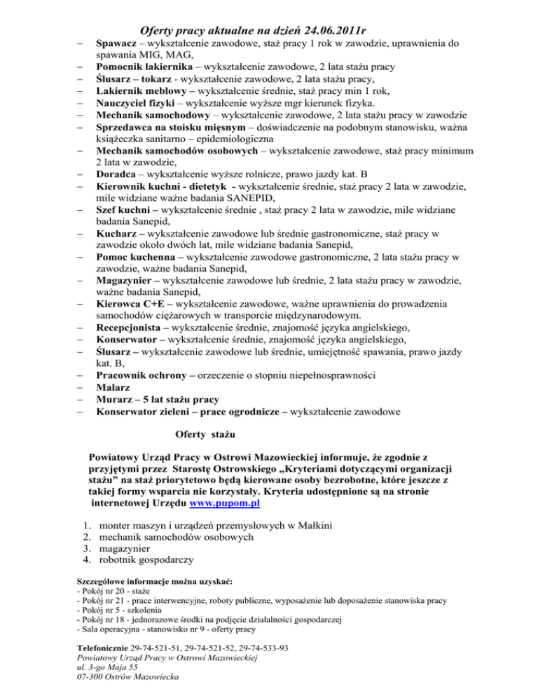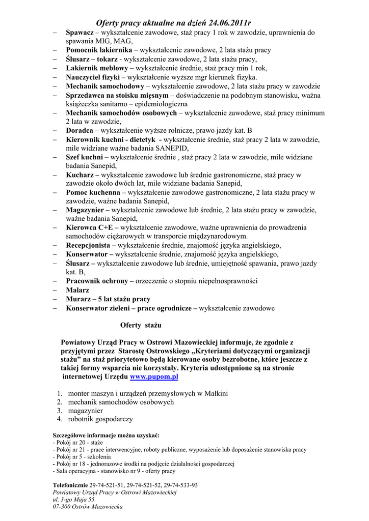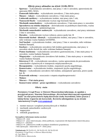 Oferty pracy aktualne na dzień 24.06.2011r − Spawacz – wykształcenie zawodowe, staż pracy 1 rok w zawodzie, uprawnienia do spawania MIG, MAG, Pomocnik lakiernika – wykształcenie zawodowe, 2 lata stażu pracy Ślusarz – tokarz - wykształcenie zawodowe, 2 lata stażu pracy, Lakiernik meblowy – wykształcenie średnie, staż pracy min 1 rok, Nauczyciel fizyki – wykształcenie wyższe mgr kierunek fizyka. Mechanik samochodowy – wykształcenie zawodowe, 2 lata stażu pracy w zawodzie Sprzedawca na stoisku mięsnym – doświadczenie na podobnym stanowisku, ważna książeczka sanitarno – epidemiologiczna Mechanik samochodów osobowych – wykształcenie zawodowe, staż pracy minimum 2 lata w zawodzie, Doradca – wykształcenie wyższe rolnicze, prawo jazdy kat. B Kierownik kuchni - dietetyk - wykształcenie średnie, staż pracy 2 lata w zawodzie, mile widziane ważne badania SANEPID, Szef kuchni – wykształcenie średnie , staż pracy 2 lata w zawodzie, mile widziane badania Sanepid, Kucharz – wykształcenie zawodowe lub średnie gastronomiczne, staż pracy w zawodzie około dwóch lat, mile widziane badania Sanepid, Pomoc kuchenna – wykształcenie zawodowe gastronomiczne, 2 lata stażu pracy w zawodzie, ważne badania Sanepid, Magazynier – wykształcenie zawodowe lub średnie, 2 lata stażu pracy w zawodzie, ważne badania Sanepid, Kierowca C+E – wykształcenie zawodowe, ważne uprawnienia do prowadzenia samochodów ciężarowych w transporcie międzynarodowym. Recepcjonista – wykształcenie średnie, znajomość języka angielskiego, Konserwator – wykształcenie średnie, znajomość języka angielskiego, Ślusarz – wykształcenie zawodowe lub średnie, umiejętność spawania, prawo jazdy kat. B, Pracownik ochrony – orzeczenie o stopniu niepełnosprawności Malarz Murarz – 5 lat stażu pracy Konserwator zieleni – prace ogrodnicze – wykształcenie zawodowe − − − − − − − − − − − − − − − − − − − − − Oferty stażu Powiatowy Urząd Pracy w Ostrowi Mazowieckiej informuje, że zgodnie z przyjętymi przez Starostę Ostrowskiego „Kryteriami dotyczącymi organizacji stażu” na staż priorytetowo będą kierowane osoby bezrobotne, które jeszcze z takiej formy wsparcia nie korzystały. Kryteria udostępnione są na stronie internetowej Urzędu www.pupom.pl 1. 2. 3. 4. monter maszyn i urządzeń przemysłowych w Małkini mechanik samochodów osobowych magazynier robotnik gospodarczy Szczegółowe informacje można uzyskać: - Pokój nr 20 - staże - Pokój nr 21 - prace interwencyjne, roboty publiczne, wyposażenie lub doposażenie stanowiska pracy - Pokój nr 5 - szkolenia - Pokój nr 18 - jednorazowe środki na podjęcie działalności gospodarczej - Sala operacyjna - stanowisko nr 9 - oferty pracy Telefonicznie 29-74-521-51, 29-74-521-52, 29-74-533-93 Powiatowy Urząd Pracy w Ostrowi Mazowieckiej ul. 3-go Maja 55 07-300 Ostrów Mazowiecka