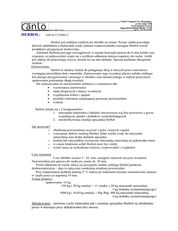 HERBOL: ASFALT CIEKŁY Herbol jest asfaltem ciekłym do obróbki na zimno. Postać ciekła powoduje łatwość nakładania a dodawanie wody zamiast rozpuszczalnika szereguje Herbol wśród produktów przyjaznych środowisku. Zaletami Herbolu jest jego rozciągliwość w rejonie krawędzi prawie do 0 oraz krótki czas wiązania, co jednocześnie wiąże się z szybkim oddaniem miejsca naprawy do ruchu. Asfalt jest zdatny do ponownego użycia, można też na nim układać. Sprosta każdemu obciążeniu ruchem. Zastosowanie: Herbol to idealny środek do pielęgnacji dróg w których prace remontowe wymagają niewielkiej ilości materiału. Zastosowanie tego wysokiej jakości asfaltu ciekłego bez dużego przygotowania i prostego w obróbce oraz dostarczonego w małym poręcznym opakowaniu gwarantuje długą trwałość. Ma zastosowanie na nawierzchnie asfaltowe i cementowe dla: wyrównania nierówności ramp drogowych i miejsc wyżartych wypełnienia kolein i spękań powłoki ochronnej zamykającej porowate powierzchnie wyboin Herbol składa się z 2 komponentów: 1. mieszanka mineralna o składzie utworzonym wg linii przesiewu z grysu, wypełniacza, piasku i dodatków uszlachetniających 2. zmodyfikowanej emulsji specjalnej Herbol Jak stosować? o obrabianą powierzchnię oczyścić z pyłu i luźnych cząstek o wstrząsnąć dobrze emulsją Herbol, dolać trochę wody do mieszanki mineralnej oraz dodać dodatek specjalny o kielnią lub mieszadłem wymieszać mieszankę mineralną na jednorodna masę o w czasie kładzenia asfalt Herbol musi być ciekły o wylać masę na uszkodzone miejsce, rozprowadzić i wygładzić Czas wiązania: Czas obróbki wynosi 5 –10 min, następnie materiał zaczyna twardnieć. Nawierzchnia jest gotowa do ruchu po czasie ok. 30 min. Przed oddaniem do ruchu zaleca się posypanie asfaltu ciekłego Herbol piaskiem drobnoziarnistym – daje to optycznie zamkniętą strukturę powierzchni. Przy temperaturze podłoża poniżej 5 C należy po nałożeniu trzymać remontowane miejsce w cieple przez co najmniej 10 min. Forma dostawy: opakowania: 16 kg 250 kg ( 30 kg emulsji + 11 wiader x 20 kg mieszanki mineralnej 1 kg dodatku uszlachetniającego) 1000 kg ( 4x30 kg emulsji + Big Bag: 880 kg mieszanki mineralnej 4 kg dodatku uszlachetniającego) Składowanie: zarówno cześć mineralna jak i emulsja specjalna Herbol są obrabialne przez 4 miesiące przy składowaniu bez mrozu.