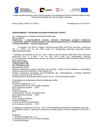 Projekt współfinansowany przez Unię Europejską z Europejskiego Funduszu Rozwoju Regionalnego Fundusze Europejskie dla rozwoju regionu łódzkiego Numer sprawy: IGKM. 271.8.2013 Poddębice dnia 07.05.2013 r. ZAWIADOMIENIE O WYBORZE NAJKORZYSTNIEJSZEJ OFERTY dot.: postępowania o udzielenie zamówienia publicznego. Nazwa zadania: Organizacja i przeprowadzenie imprezy masowej, obejmującej program artystyczny w wykonaniu artystów estrady polskiej i osób niepełnosprawnych pn. II Poddębickie Spotkania w Krainie Bez Barier – koncert integracyjny W związku z art. 94 ust. 3 ustawy z dnia 29 stycznia 2004 roku Prawo zamówień publicznych (Dz. U. z 2010 r. Nr 113, poz. 759 z późn. zm.) Zamawiający dokonuje ponownego wyboru najkorzystniejszej oferty. 1. Działając na podstawie art. 92 ust. 1 pkt 1 ustawy z dnia 29 stycznia 2004 roku Prawo zamówień publicznych (Dz. U. z 2010 r. Nr 113, poz. 759 z późn. zm.) Zamawiający informuje, że w prowadzonym postępowaniu wybrano do realizacji zamówienia najkorzystniejszą ofertę złożoną przez wykonawcę: Kamrat Konsulting ul. Mechaników 105, 65 -119 Zielona Góra Uzasadnienie wyboru: Wybrany Wykonawca uzyskał najwyższą ilość punktów i spełnił warunki określone w Specyfikacji Istotnych Warunków Zamówienia oraz ustawie Pzp. Wybrany wykonawca obowiązany jest skontaktować się z Zamawiającym w sprawie podpisania umowy w terminie do dnia 13.05.2013 r. Podstawą prawną dokonanego wyboru jest art. 91 ust. 1 Pzp oraz Kodeks Cywilny. W prowadzonym postępowaniu złożono następujące oferty: Oferta Nr 1 Prospects Publisher Sp. z o.o. ul. Nowogrodzka 50 lok. 515, 00-695 Warszawa ilość uzyskanych punktów - 78,23 Oferta Nr 3 Kamrat Konsulting ul. Mechaników 105, 65 -119 Zielona Góra ilość uzyskanych punktów - 90,09 Oferta Nr 4 Firma Usługowa Krogulec Ryszard Krogulecki ul. Złota 40, 98-220 Zduńska Wola ilość uzyskanych punktów - 73,67 2. Działając na podstawie art. 92 ust. 1 pkt. 4) Prawa zamówień publicznych zamawiający informuje, że podpisanie umowy z wyłonionym wykonawcą możliwe będzie w terminie zgodnym z art.94 ust. 2 pkt 3 Otrzymuje: 1. Prospects Publisher Sp. z o.o. ul. Nowogrodzka 50 lok. 515, 00-695 Warszawa 2. Kamrat Konsulting Projekt współfinansowany przez Unię Europejską z Europejskiego Funduszu Rozwoju Regionalnego Fundusze Europejskie dla rozwoju regionu łódzkiego ul. Mechaników 105, 65 -119 Zielona Góra 3. Firma Usługowa Krogulec Ryszard Krogulecki ul. Złota 40, 98-220 Zduńska Wola Burmistrz Poddębice (-) Piotr Sęczkowski