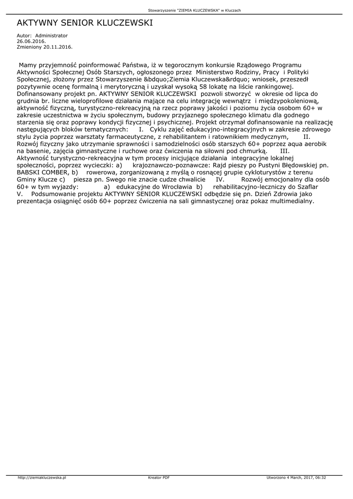 Stowarzyszenie "ZIEMIA KLUCZEWSKA" w Kluczach AKTYWNY SENIOR KLUCZEWSKI Autor: Administrator 26.06.2016. Zmieniony 20.11.2016. Mamy przyjemność poinformować Państwa, iż w tegorocznym konkursie Rządowego Programu Aktywności Społecznej Osób Starszych, ogłoszonego przez Ministerstwo Rodziny, Pracy i Polityki Społecznej, złożony przez Stowarzyszenie „Ziemia Kluczewska” wniosek, przeszedł pozytywnie ocenę formalną i merytoryczną i uzyskał wysoką 58 lokatę na liście rankingowej. Dofinansowany projekt pn. AKTYWNY SENIOR KLUCZEWSKI pozwoli stworzyć w okresie od lipca do grudnia br. liczne wieloprofilowe działania mające na celu integrację wewnątrz i międzypokoleniową, aktywność fizyczną, turystyczno-rekreacyjną na rzecz poprawy jakości i poziomu życia osobom 60+ w zakresie uczestnictwa w życiu społecznym, budowy przyjaznego społecznego klimatu dla godnego starzenia się oraz poprawy kondycji fizycznej i psychicznej. Projekt otrzymał dofinansowanie na realizację następujących bloków tematycznych: I. Cyklu zajęć edukacyjno-integracyjnych w zakresie zdrowego stylu życia poprzez warsztaty farmaceutyczne, z rehabilitantem i ratownikiem medycznym, II. Rozwój fizyczny jako utrzymanie sprawności i samodzielności osób starszych 60+ poprzez aqua aerobik na basenie, zajęcia gimnastyczne i ruchowe oraz ćwiczenia na siłowni pod chmurką. III. Aktywność turystyczno-rekreacyjna w tym procesy inicjujące działania integracyjne lokalnej społeczności, poprzez wycieczki: a) krajoznawczo-poznawcze: Rajd pieszy po Pustyni Błędowskiej pn. BABSKI COMBER, b) rowerowa, zorganizowaną z myślą o rosnącej grupie cykloturystów z terenu Gminy Klucze c) piesza pn. Swego nie znacie cudze chwalicie IV. Rozwój emocjonalny dla osób 60+ w tym wyjazdy: a) edukacyjne do Wrocławia b) rehabilitacyjno-leczniczy do Szaflar V. Podsumowanie projektu AKTYWNY SENIOR KLUCZEWSKI odbędzie się pn. Dzień Zdrowia jako prezentacja osiągnięć osób 60+ poprzez ćwiczenia na sali gimnastycznej oraz pokaz multimedialny. http://ziemiakluczewska.pl Kreator PDF Utworzono 4 March, 2017, 06:32