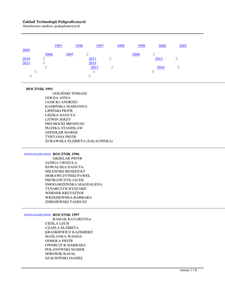 Zakład Technologii Poligraficznych Absolwenci studiów podyplomowych 1993 2005 2010 2013 2006 1996 2007 1997 2011 2014 2015 1998 1999 2008 2000 2012 2016 2002 ROCZNIK 1993 GOLIŃSKI TOMASZ GOŁDA ANNA JANICKI ANDRZEJ KAMIŃSKA MARIANNA LIPIŃSKI PIOTR LISZKA DANUTA LITWIN JERZY PIECHOCKI IRENEUSZ PŁOTKA STANISŁAW SZINDLER MAREK TYRTANIA PIOTR ŻURAWSKA ELŻBIETA (SAŁACIŃSKA) ROCZNIK 1996 GRZELAK PIOTR JANIGA URSZULA KOWALSKA DANUTA MILEWSKI BENEDYKT MORAWCZYŃSKI PAWEŁ PIETRAŃCZYK JACEK SMOGARZEWSKA MAGDALENA TYSARCZYK RYSZARD WERNER KRZYSZTOF WRZESIEWSKA BARBARA ZDROJEWSKI TADEUSZ powrót na górę strony ROCZNIK 1997 BASIAK KATARZYNA CIEŚLA LECH CZAPLA ELŻBIETA KRAŚKIEWICZ KAZIMIERZ MAŚLANKA WANDA OSMOŁA PIOTR OWERCZUK BARBARA POLANOWSKI MAREK SEROWIK RAFAŁ SZAŁWIŃSKI DANIEL powrót na górę strony strona 1 / 8 Zakład Technologii Poligraficznych Absolwenci studiów podyplomowych SZPUNAR MAREK ROCZNIK 1998 BARTŁOMIEJ BOSZKO DREJER RENATA KACZMARCZYK STEFAN KAZUBEK MAREK KOLASIŃSKI ANDRZEJ KUDEŁ ROBERT OLECHOWSKA KATARZYNA WESOŁOWSKA-DEJER ALEKSANDRA WŁODARZEWSKA BEATA powrót na górę strony ROCZNIK 1999 BRZOMIŃSKI ANDRZEJ BUCZYŃSKA ANNA GLIŃSKA-BRZEZICHA BARBARA KĘPSKA ALINA PAGACZ-BORYCZKA MARIA ROSIAK ERYK SIECZKA WIOLETTA WÓJCIK TOMASZ powrót na górę strony ROCZNIK 2000 BIELIŃSKA-WOSZCZAK IGA CHABROS KRZYSZTOF DĘBECKI MICHAŁ LESZCZYŃSKA EWA MUŻELAK JAN NAGLIK RAFAŁ REGINKA-WICHERSKA RENATA SADECKA MARZENA SKOCZEK MAŁGORZATA SOBIESZEWSKA MONIKA TERLECKI PAWEL TOPOLIŃSKA JADWIGA WILCZYŃSKI MARCIN WORZAŁA ANDRZEJ ZIENTALSKI WŁODZIMIERZ powrót na górę strony ROCZNIK 2002 BORCZYK DAMIAN CIEŚLICKI PAWEŁ ĆWIKLIŃSKA DANUTA GABOR ANDRZEJ GIZA GRAŻYNA GRABOWSKI SEBASTIAN powrót na górę strony strona 2 / 8 Zakład Technologii Poligraficznych Absolwenci studiów podyplomowych GRACZYK JAROSŁAW JAKÓBCZYK JAROSŁAW JASIEWICZ-STRZELECKA ANNA JÓŹWIAK WALDEMAR KEMPIŃSKI JERZY KILAR WOJCIECH KOZYRA KRZYSZTOF KRZEMKOWSKA MAŁGORZATA ŁUKASIEWICZ AGNIESZKA MARKOWSKI PIOTR NIESZPOREK ADAM NOWICKI MAREK OSTROWSKI PIOTR PRYT IWONA RAMOTOWSKI KRZYSZTOF SMORĄG ROBERT STAWICKI ADRIAN SZUMAŃSKI JAROSŁAW SZWEDA WALDEMAR WANTUCH ELŻBIETA WISZ MICHAŁ WIŚNIEWSKI TOMASZ WÓJCIK JAROSŁAW ZAJĄC ROBERT ZAWADZKA ALDONA ŻELAZNIAKOWICZ MICHAŁ ROCZNIK 2005 BARAŃSKI TOMASZ CAŁA MAŁGORZATA CIECHANOWICZ ADAM CZERWIŃSKA MAŁGORZATA DERĘGOWSKA-KUREK ALEKSANDRA MONIKA DOBRZYŃSKA MAŁGORZATA DUFAJ MAREK GOC MAGDALENA GRACZYK JOANNA HAJDUCZENIA MAREK KOWALSKA ALICJA KRUSIK MONIKA KUROWIAK KLAUDYNA LEŚNIAK DANIEL BERNARD MAKOMASKI JACEK MALICKA MARTA TERESA MSTOWSKI TOMASZ MUDRAK ANNA EWA NOWAK WALDEMAR PAWELEC JACEK PŁUCIENNIK RAFAŁ ROGALSKA MONIKA powrót na górę strony strona 3 / 8 Zakład Technologii Poligraficznych Absolwenci studiów podyplomowych RUTKOWSKA JOANNA SĘK ZBIGNIEW, JANUSZ SIEMIŃSKA AGNIESZKA SZOSTAK KRZYSZTOF SZYBAJ-PIĄTEK AGNIESZKA ŚLOSARCZYK MICHAŁ ŚWIŚ MAREK WIŚNIEWSKA-SZCZEPANIK ANETA WRÓBLEWSKI CEZARY WUSTINGER SYLWIA ROCZNIK 2006 CHWAŁEK TOMASZ DOMINICZAK JOANNA GAGATKO BOGUSŁAW GOCOLIŃSKI ADRIAN KARWAT MAREK WŁODZIMIERZ KOPEĆ KAMIL KOT MIROSŁAWA LECH SŁAWOMIR LIGĘZA-SALAMON ALEKSANDER MADEJ MARIA MAZUREK PIOTR MIĄCZ BARBARA MYSZAK ANNA OSTRZYCKI ROMAN PELCZAR ANNA PLENZLER EWA SIEKIERSKI TOMASZ SKIBIŃSKI ROBERT STĘPIEŃ WIKTOR WACHOWIAK AGNIESZKA WIECZOREK ROBERT powrót na górę strony ROCZNIK 2007 CIOSEK PAWEŁ GĄSIOROWSKA LILIANA KLEPACZ ZBIGNIEW KOKOT VEL KOKOCIŃSKA ANETA KUBIAK WIECZOREK ANETA KULESZA EWELINA ŁYKO WOJCIECH MISIURO DOROTA NERLEWSKI LESZEK RYBARCZYK URSZULA SOŃTA MICHAŁ ZBIGNIEW STANKIEWICZ MAREK STEGAWSKI MAREK STRZYGA JOANNA powrót na górę strony strona 4 / 8 Zakład Technologii Poligraficznych Absolwenci studiów podyplomowych ŚLIWONIK SYLWESTER WILCZEWSKA KATARZYNA ZAKRZEWSKA MAŁGORZATA powrót na górę strony ROCZNIK 2008 BIELSKA AGNIESZKA CHMIELIŃSKI SŁAWOMIR CZERSKA-KRYSIK AGNIESZKA DYDYCZ MARIUSZ GŁOWACKA KATARZYNA KACZMAREK LUCYNA KALIŃSKA DOMINIKA KUCHARSKI MARCIN LATEK ROBERT MAJEWSKA WIKTORIA MATUSZAK LIDIA MĄDRY ALICJA NOWAKOWSKA NINA OBARA KRZYSZTOF PANTER ALEKSANDER PIERZCHAŁA BARTOSZ POLAKOWSKI DARIUSZ PRZYBEK BARBARA RADAJ DARIUSZ ROZMIAREK TOMASZ SOĆKO KATARZYNA WRÓBEL MARCIN ZABIELSKA KATARZYNA powrót na górę strony ROCZNIK 2010 BANACH ALICJA BARAN TOMASZ BARGAŃSKI WALDEMAR BLISZCZYK JOANNA CHMIELECKA JOWITA CZERWIŃSKA ELŻBIETA DOBROŁĘCKI JULIUSZ DROZDOWSKI MICHAŁ GOCHNIO BEATA ANNA GÓRSKI JAKUB KOPEĆ RADOSŁAW KOWALSKA ALEKSANDRA KOZŁOWSKI GRZEGORZ LESIAK JOLANTA LIPIŃSKI SŁAWOMIR ŁOCHOWSKI MATEUSZ MAKOWSKA MONIKA strona 5 / 8 Zakład Technologii Poligraficznych Absolwenci studiów podyplomowych MAMOT PIOTR MARCINKOWSKI PIOTR MEISSNER ANDRZEJ PLACEK ŁUKASZ RUCHAŁOWSKA MARTA RUDALSKA ANETA SMOLEŃ ZOFIA WOJCIECHOWSKI MIROSŁAW WÓJCIK PAWEŁ ZAGROBELNA-MĘCINA MONIKA ZGLENICKA AGNIESZKA ZIMNY ANNA ŻOŁEK TERESA ROCZNIK 2011 BYKOWSKI ANDRZEJ CYBULSKI ADRIAN DĄBROWA ANNA DŁUGOŁĘCKA ANNA FONRATH JAROSŁAW SYLWESTER GDANIEC LIDIA MARIA GIZA ZBIGNIEW HYB HUBERT DANIEL KISZKAREWICZ RAFAŁ ARTUR KOSTRZEWA MICHAŁ JAN KOWALCZYK ROBERT LUZIŃSKA MAŁGORZATA KATARZYNA ŁUKASZEWICZ BARTOSZ ALEKSANDER MARCINKIEWICZ PIOTR MARZEC RAFAŁ SZCZEPAN PANTER DAMIAN PICH ELŻBIETA SOSNOWSKA MONIKA WĘCŁAWIAK ANETA WOJDAT ELŻBIETA ZIELECKA ROMANA powrót na górę strony ROCZNIK 2012 BŁASIAK TOMASZ GRZEGORZ CZARNECKI ADAM IYARE AGNIESZKA JEMIOŁOWSKA BEATA ANNA JEZNACH EDYTA RENATA KIEK PAWEŁ ŁUKASZ KOPECKA JUSTYNA MARIA KOWALSKI ARTUR KUNIK DANIEL KUŚNIERCZAK SŁAWOMIR BARTŁOMIEJ KWASS SEBASTIAN MIECZYSŁAW powrót na górę strony strona 6 / 8 Zakład Technologii Poligraficznych Absolwenci studiów podyplomowych ŁĘCZYCKA EMILIA ŁOŚ JĘDRZEJ JÓZEFAT MAJEWSKA KAMILA INGA MICHALCZUK KRYSTIAN KACPER MIKOŁAJCZAK ZENON ANTONI NIEMIEC JÓZEF OSTROWSKI WALDEMAR PARUS JUSTYNA IZABELA POKAROWSKA HANNA ZIENTARA SEBASTIAN powrót na górę strony 