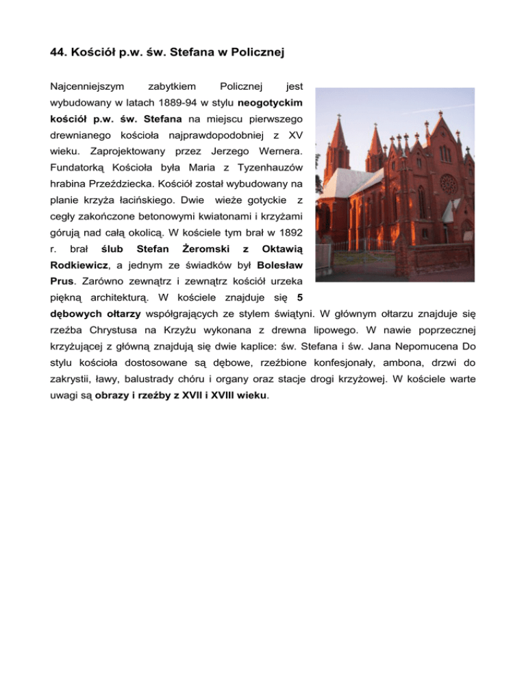 44. Kościół p.w. św. Stefana w Policznej Najcenniejszym zabytkiem Policznej jest wybudowany w latach 1889-94 w stylu neogotyckim kościół p.w. św. Stefana na miejscu pierwszego drewnianego kościoła najprawdopodobniej z XV wieku. Zaprojektowany przez Jerzego Wernera. Fundatorką Kościoła była Maria z Tyzenhauzów hrabina Przeździecka. Kościół został wybudowany na planie krzyża łacińskiego. Dwie wieże gotyckie z cegły zakończone betonowymi kwiatonami i krzyżami górują nad całą okolicą. W kościele tym brał w 1892 r. brał ślub Stefan Żeromski z Oktawią Rodkiewicz, a jednym ze świadków był Bolesław Prus. Zarówno zewnątrz i zewnątrz kościół urzeka piękną architekturą. W kościele znajduje się 5 dębowych ołtarzy współgrających ze stylem świątyni. W głównym ołtarzu znajduje się rzeźba Chrystusa na Krzyżu wykonana z drewna lipowego. W nawie poprzecznej krzyżującej z główną znajdują się dwie kaplice: św. Stefana i św. Jana Nepomucena Do stylu kościoła dostosowane są dębowe, rzeźbione konfesjonały, ambona, drzwi do zakrystii, ławy, balustrady chóru i organy oraz stacje drogi krzyżowej. W kościele warte uwagi są obrazy i rzeźby z XVII i XVIII wieku.
