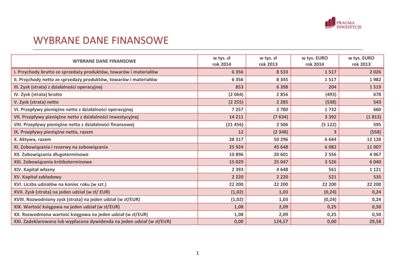 WYBRANE DANE FINANSOWE w tys. zł rok 2014 WYBRANE DANE FINANSOWE I. Przychody brutto ze sprzedaży produktów, towarów i materiałów II. Przychody netto ze sprzedaży produktów, towarów i materiałów III. Zysk (strata) z działalności operacyjnej IV. Zysk (strata) brutto V. Zysk (strata) netto VI. Przepływy pieniężne netto z działalności operacyjnej VII. Przepływy pieniężne netto z działalności inwestycyjnej VIII. Przepływy pieniężne netto z działalności finansowej IX. Przepływy pieniężne netto, razem X. Aktywa, razem XI. Zobowiązania i rezerwy na zobowiązania XII. Zobowiązania długoterminowe XIII. Zobowiązania krótkoterminowe XIV. Kapitał własny XV. Kapitał zakładowy XVI. Liczba udziałów na koniec roku (w szt.) XVII. Zysk (strata) na jeden udział (w zł/ EUR) XVIII. Rozwodniony zysk (strata) na jeden udział (w zł/EUR) XIX. Wartość księgowa na jeden udział (w zł/EUR) XX. Rozwodniona wartość księgowa na jeden udział (w zł/EUR) XXI. Zadeklarowana lub wypłacona dywidenda na jeden udział (w zł/EUR) 6 356 6 356 853 (2 064) (2 255) 7 257 14 211 (21 456) 12 28 317 25 924 10 896 15 029 2 393 2 220 22 200 (1,02) (1,02) 1,08 1,08 0,00 1 w tys. zł rok 2013 8 533 8 345 6 398 2 856 2 285 2 780 (7 634) 2 506 (2 348) 50 296 45 648 20 601 25 047 4 648 2 220 22 200 1,03 1,03 2,09 2,09 124,57 w tys. EURO rok 2014 1 517 1 517 204 (493) (538) 1 732 3 392 (5 122) 3 6 644 6 082 2 556 3 526 561 521 22 200 (0,24) (0,24) 0,25 0,25 0,00 w tys. EURO rok 2013 2 026 1 982 1 519 678 543 660 (1 813) 595 (558) 12 128 11 007 4 967 6 040 1 121 535 22 200 0,24 0,24 0,50 0,50 29,58 Podstawowe pozycje sprawozdania z sytuacji finansowej oraz całkowitych dochodów przeliczono na EURO według kursów średnich ustalonych przez Narodowy Bank Polski zgodnie ze wskazaną, obowiązującą zasadą przeliczenia: a) sprawozdanie z sytuacji finansowej według kursu obowiązującego na ostatni dzień odpowiedniego okresu: na dzień 31 grudnia 2014 średni kurs wyniósł: 4,2623; na dzień 31 grudnia 2013 średni kurs wyniósł: 4,1472; b) sprawozdanie z całkowitych dochodów według kursów średnich w odpowiednim okresie obliczonych jako średnia arytmetyczna kursów obowiązujących na ostatni dzień każdego miesiąca w danym okresie: średnia arytmetyczna w okresie od 1 stycznia do 31 grudnia 2014: 4,1893; średnia arytmetyczna w okresie od 1 stycznia do 31 grudnia 2013: 4,211; Przeliczenia dokonano poprzez podzielenie wartości wyrażonych w tysiącach złotych przez kurs wymiany. Z poważaniem, Zarząd Pragma Inwestycje Sp. z o.o. Jacek Obrocki - Prezes Zarządu Tomasz Boduszek - Członek Zarządu Katowice, 23 marca 2015 roku 2