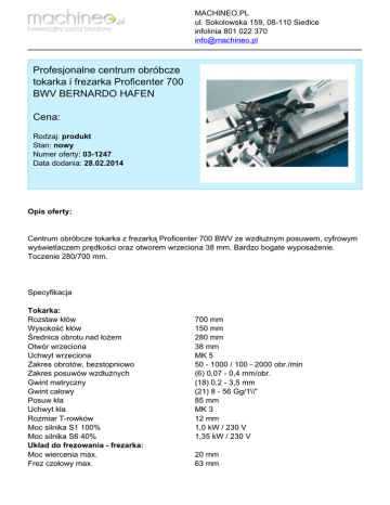 MACHINEO.PL ul. Sokolowska 159, 08-110 Siedlce infolinia 801 022 370 [email protected] Profesjonalne centrum obróbcze tokarka i frezarka Proficenter 700 BWV BERNARDO HAFEN Cena: Rodzaj: produkt Stan: nowy Numer oferty: 03-1247 Data dodania: 28.02.2014 Opis oferty: Centrum obróbcze tokarka z frezarką Proficenter 700 BWV ze wzdłużnym posuwem, cyfrowym wyświetlaczem prędkości oraz otworem wrzeciona 38 mm. Bardzo bogate wyposażenie. Toczenie 280/700 mm. Specyfikacja Tokarka: Rozstaw kłów Wysokość kłów Średnica obrotu nad łożem Otwór wrzeciona Uchwyt wrzeciona Zakres obrotów, bezstopniowo Zakres posuwów wzdłużnych Gwint metryczny Gwint calowy Posuw kła Uchwyt kła Rozmiar T-rowków Moc silnika S1 100% Moc silnika S6 40% Układ do frezowania - frezarka: Moc wiercenia max. Frez czołowy max. 700 mm 150 mm 280 mm 38 mm MK 5 50 - 1000 / 100 - 2000 obr./min (6) 0,07 - 0,4 mm/obr. (18) 0,2 - 3,5 mm (21) 8 - 56 Gg/1\\" 85 mm MK 3 12 mm 1,0 kW / 230 V 1,35 kW / 230 V 20 mm 63 mm MACHINEO.PL ul. Sokolowska 159, 08-110 Siedlce infolinia 801 022 370 [email protected] Frez trzpieniowy max. Odstęp trzpień / kolumna Liczba obrotów trzpienia Uchwyt trzpienia Odchylana głowica frezowa Regulacja wysokości głowicy frezowej Moc silnika S1 100% Moc silnika S6 40% Wymiary maszyny (S x G x W)* Waga całkowita ok. Firma oferująca: HAFEN Adres: ul. Artyleryjska 11 08-110 Siedlce tel.: 256440822 e-mail: [email protected] 20 mm 170 mm 50 - 2250 obr/min MK 2 -90° do +90° 260 mm 0,60 kW / 230 V 0,90 kW / 230 V 1380 x 640 x 1020 mm 278 kg