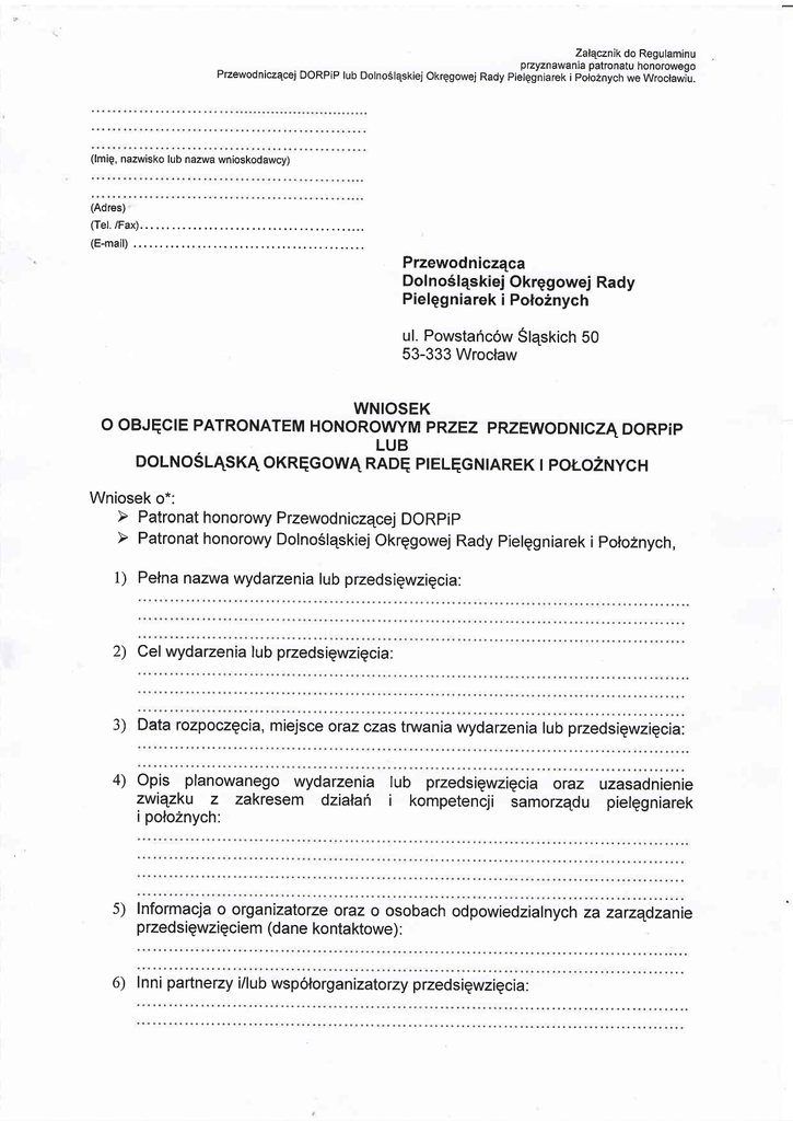 Zalqcznik do Re g u lami n u ptzyznawania patronatu honorowego Przewodniczqcej DORPiP lub DolnoSlqskiej Okrggowej Rady Pielgghiarek i poio2nych we Wroclawiu. (lmiq, nazwisko lub nazwa wnioskodawcy) (Adres) (Tel. /Fax). (E-mail) Przewodniczqca Dol no6lqskiej Okrggowej Rady Pielqgniarek i PoNo2nych ul. Powstaric6w Slqskich 50 53-333 Wroclaw WNIOSEK O OBJECIE PATRONATEM HONOROWYM PRZEZ PRZEWODNICZA DORPIP LUB DOLNOSLASKA OKREGOWA RADE PIELEGNIAREK I POLOzNYCH Wniosek o*: F Patronat honorowy Przewodniczqcej DORpip Patronat honorowy Dolno6lqskiej Okrqgowej Rady Pielqgniarek i Potoznych, ) 1) Petna nazwa wydarzenia lub przedsigwziqcia: 2) Cel wydarzenia lub przedsiqwziqcia: 3) Data rozpoczecia, miejsce orazczas tnarania wydarzenia lub przedsiqwziqcia: 4) Opis planowanego wydarzenia lub przedsiqwzigcia oraz zwiqzku z i poloznych: 5) 6) zakresem dzialah i uzasadnienie kompetencji samorzqdu pielggniarek Informacja o organizatorze oraz o osobach odpowiedzialnych za zarzqdzanie przedsiqwzigciem (dane kontaktowe): | nn i pa rtn e rzy illub wsp oto rg a nizatorzy p rzed s i gwzi gcia : Zalqcznik d o Reg u lam n u przyznawania patronatu honorowego Przewodniczqcej DORPiP lub DolnoSlqskiej Okrggowej Rady Pielggniarek i Poio2nych we Wroclawiu. i 7) Patroni medialni: 8) Dzialania promocyjne zwiqzane z organizaqq_wydarzenia lub przedsigwzigcia: 9) Przewidywana liczba uczestnik6w orazzaproszonych gosci: 10) Zasiqg wydarzenia lub przedsigwzigcia:* !tvtiqOzynarodowy !Ogolnopolski 11) !Regionalny !Lokalny Czy udziaN uczestnik6w w wydarzeniu lub przedsigwzigciu jest odplatny*: E tak (koszt uczestnictwa...... . .,...) n 12)Czy wnioskodawca planuje osiqgnigcie zysku finansowego lub przedsigwzigcia*: I rar I ruie z wydarzenia ruie 13)Czy wydarzenie lub przedsiqwziqcie ma charakter cykliczny*: E rar 14) ! ruie JeSli tak, czy byto juz obejmowane patronatem Przewodniczqcej DORPiP lub Dolno6lqskiej Okrqgowej Rady Pielqgniarek i poloznych*: ! rat 15) Inne informacje: I trtie 16)Wymagane zalqczniki do wniosku o objgcie patronatem honorowym przez Przewodniczqcq DoRPiP lub Dolnoslqskq okrqgowq Radg pielqgniarek i Potoznych a. szczeg6lowy program wydarzenia. b. lista patronow, patron6w medialnych, czlonk6w komitet6w honorowych lub organizacyjnych otaz lista innych os6b prawnych i fizycznych, ktorych nazwy (nazwiska) lub loga bedE publikowane w zwiqzku z przedsiqwziqciem. c. komunikat prasowy dotyczqcy wydarzenia lub przedsigwziqcia wraz z elementami graficznymi do zamieszczenia na stronie internetowej. (Data imiejsce) WNaSciwe podkreSli6. (Podpis wnioskodawcy)