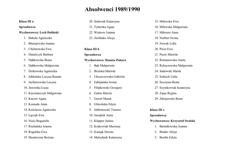Absolwenci 1989/1990 Klasa III a 20. Stańczak Katarzyna 15. Milewska Ewa Wychowawca: Lech Doliński 22. Wiatrow Joanna 17. Mikosza Anna Sprzedawca 1. Bakuła Agnieszka 2. Błażejewska Joanna 21. Tyberska Agata 23. Zielińska Alicja 3. Chełstowska Ewa Klasa III b 5. Dąbkowska Beata Wychowawca: Danuta Pokora 4. Danelczyk Barbara 6. Dąbkowska Małgorzata 7. Dzikowska Agnieszka 8. Jabłońska Lucyna Renata 9. Jachimowska Lucyna 10. Jaworska Łucja 11. Kaczmarczyk Małgorzata 12. Kaczor Agata 13. Komuda Anna 14. Kościesza Agnieszka 15. Łączak Ewa 16. Nisio Bogumiła 17. Rochalska Joanna 18. Rogalska Ewa 19. Skonieczna Bożena Sprzedawca 1. Bąk Małgorzata 2. Brzóska Mariola 3. Choszczewska Gabriela 4. Fabijańska Iwona 5. Filipkowski Grzegorz 6. Galon Marcin 7. Gaweł Marek 8. Gliścińska Edyta 16. Milewska Małgorzata 18. Norbert Iwona 19. Nowak Lidia 20. Picur Ewa 21. Puzio Mariola 22. Romanowska Aneta 23. Rykaczewska Małgorzata 24. Sadowski Marek 25. Sobiech Lidia 26. Szczęsna Beata 27. Szymkowiak Katarzyna 28. Zając Regina 29. Zdrojewska Beata 9. Jabłonowski Tomasz Klasa III c 11. Klapper Janina Wychowawca: Krzysztof Iwulski 10. Jarząbek Anna 12. Krakowiak Marzena 13. Kunigk Dorota 14. Maluchnik Katarzyna Sprzedawca 1. Bartnikowska Joanna 2. Binder Alicja 3. Bordin Edyta Absolwenci 1989/1990 4. Cwalińska Beata Klasa III d 20. Szypulska Elżbieta 6. Forszpaniak Dorota Wychowawca: Lilianna Myśliwiec 22. Wałdoch Gabriela 5. Domańska Małgorzata 7. Jakubas Anna 8. Jankowska Ewa 9. Jeżewska Katarzyna 10. Karpińska Małgorzata 11. Kaszewska Dorota 12. Kazimierczak Beata 13. Konopka Ewa 14. Korgul Izabella 15. Lechowicz Ewa 16. Marzoch Elżbieta 17. Obrębska Joanna 18. Olak Ewa 19. Skrzeczkowska Anna 20. Szyrejko Dorota 21. Szczupakowska Kamila 22. Tańska Halina 23. Wasilewska Małgorzata 24. Zatoka Beata Sprzedawca 1. Bartkowska Katarzyna 2. Bociańska Iwona 3. Chmarycz Halina 4. Dąbrowska Dorota 5. Góralczyk Edyta 21. Szypulska Wioletta 23. Wasilewska Agata 24. Waszkiewicz Joanna 25. Wesołowska Bogumiła 26. Żejmo Jolanta 6. Hadron Joanna Klasa III e 8. Kaszewska Barbara Wychowawca: Stefan Lisiecki 7. Kajdanowska Barbara 9. Kiełb Elżbieta 10. Klimaszewska Izabela 11. Kolenda Elżbieta 12. Kowynia Maria 13. Krupińska Beata 14. Kurowska Beata 15. Kwaśna Barbara 16. Mika Krystyna Anna 17. Perkowska Diana 18. Rzymkowska Anna 19. Szaffrin Edyta Sprzedawca 1. Banach Marzena 2. Czyżewska Jadwiga 3. Duch Marzena 4. Fiedosiuk Mariola 5. Jakubenas Katarzyna 6. Kacprzycka Małgorzata 7. Kondracka Barbara 8. Korczyńska Katarzyna 9. Krystoń Marzena 10. Kur Agnieszka 11. Lenda Marianna Absolwenci 1989/1990 12. Mroczkowska Ewa 7. Kowalczyk Jolanta Klasa III g 14. Podlipska Renata 9. Kummer Anna Wychowawca: Jan Kochanowicz 13. Piotrowska Bogusława 15. Puszko Izabella 16. Rosińska Jolanta 17. Rozicka Irena 18. Samul Marzena 19. Sawulis Anna 20. Sienkiewicz Katarzyna 21. Szymczyk Iwona 22. Woźniak Jolanta 23. Zarzycka Aneta Klasa III f Sprzedawca Wychowawca: Krystyna Żegis 1. Balcerzak Krystyna 2. Dębska Dorota 3. Dudzińska Małgorzata 4. Grądzka Jolanta 5. Jarosz Beata 6. Kowalewska Jolanta 8. Krzemieniewska Wioletta 10. Mierzejewska Anna 11. Naus Elżbieta 12. Pietrzyk Iwona 13. Racis Lilianna 14. Romulewicz Anna 15. Skutnik Monika 16. Stolarczyk-Świda Anna 17. Strzałkowska Anna 18. Szawdzianiec Ewa 19. Szymanowska Iza 20. Szkutnik Iza 21. Ścibor Marzena 22. Suray Agnieszka 23. Turowska Elżbieta 24. Zawiślińska Agnieszka 25. Zduniak Elżbieta Sprzedawca 1. Czajkowska Iwona 2. Jękot Adriana 3. Kaczor Małgorzata 4. Komorek Adriana 5. Kowalska Joanna 6. Kędzierska Elżbieta 7. Korecka Ewa 8. Król Wioletta 9. Luśnia Dorota 10. Małyska Krystyna 11. Oleksiak Małgorzata 12. Opalach Beata 13. Osnowska Dorota 14. Ronkiewicz Aneta 15. Rychlica Anna 16. Sadkiewicz Małgorzata 17. Stahl Joanna 18. Szymczak Dorota 19. Tańska Małgorzata Absolwenci 1989/1990 20. Wieśniak Marzena 13. Kowalewski Ireneusz 9. Krajewska Agnieszka 22. Wojciechowska Anna 15. Lach Krzysztof 11. Krowiak Barbara 21. Wagner Katarzyna 23. Wykowska Anna 24. Winiarska Renata 25. Zborowska Agnieszka Klasa III h Elektromechanik Wychowawca: Władysław Zdziarski 1. Birbach Paweł 14. Książek Mariusz 16. Łoński Radosław 17. Miller Tomasz 18. Osiński Dariusz 19. Pakuła Bogusław 20. Prószyński Piotr 21. Żukowski Andrzej 22. Pawlik Dorota 2. Brakowiecki Krzysztof Klasa III j 4. Czajka Jan Wychowawca: Kazimierz Czarnowicz 3. Chruśliński Bogdan 5. Dudaniec Aleksandra 6. Dzirzgowski Piotr 7. Filimonow Tomasz 8. Gil Karol 9. Grabowski Ryszard 10. Jankowski Cezary 11. Jeleniewski Jacek 12. Konopko Krzysztof Operator ruchowo-przewozowy kolei 1. Chełstowska Anna 10. Krakowska Dorota 12. Malag Anna 13. Mickiewicz Iwona 14. Nowosielska Anna 15. Nowosielska Lucyna Agnieszka 16. Osowska Danuta Agnieszka 17. Palmowska Hanna 18. Piórkowska Anna 19. Rzemek Wiesława 20. Sliwińska Bogusława 21. Skoczeń Małgorzata 22. Zalewska Wanda 2. Czamlet Anna Klasa III k 4. Hetman Elżbieta Wychowawca: Alicja Langowska 3. Chociej Barbara 5. Jachimczyk Małgorzata 6. Kacprzak Małgorzata 7. Knebel Teresa 8. Kokoszczyńska Beata Krawiec 1. Baryła Katarzyna 2. Choduń Grażyna 3. Czarneta Anna 4. Dmochowska Anna Absolwenci 1989/1990 5. Dołoszycka Iwona 27. Warmińska Małgorzata 14. Lewandowska Katarzyna 7. Gryczewska Elżbieta 29. Wojciechowska Sylwia 16. Maciorowska Małgorzata 6. Gut Danuta 8. Januszewska Katarzyna 9. Kłos Danuta 10. Keller Agnieszka 28. Warpechowska Bogumiła 30. Zalewska Jolanta 31. Żbikowska Anna 11. Konopka Elżbieta Klasa III n 13. Kwiatkowska Agnieszka Wychowawca: Krystyna Leonowicz 12. Kożuchowska Renata 14. Mielnicka Agnieszka 15. Mosakowska Mirosława 16. Napierska Józefa 17. Obrębska Joanna 18. Ozimek Julita 19. Pełka Anna 20. Pierzchała Milena 21. Pietrasiak Małgorzata 22. Pietnak Beata 23. Pniewska Lidia 24. Polidowska Danuta 25. Rydel Katarzyna 26. Tatarynowicz Joanna Fryz