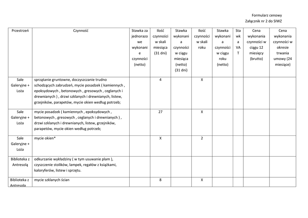 Formularz cenowy Załącznik nr 2 do SIWZ Przestrzeń Czynność Stawka za jednorazo we wykonani e czynności (netto) Ilość czynności w skali miesiąca (31 dni) Stawka wykonani a czynności w ciągu miesiąca (netto) (31 dni) Ilość czynności w skali roku Sale Galeryjne + Loża sprzątanie gruntowne, doczyszczanie trudno schodzących zabrudzeń, mycie posadzek ( kamiennych , epoksydowych , betonowych , gresowych , ceglanych i drewnianych ) , drzwi szklanych i drewnianych, listew, grzejników, parapetów, mycie okien według potrzeb; 4 X Sale Galeryjne + Loża mycie posadzek ( kamiennych , epoksydowych , betonowych , gresowych , ceglanych i drewnianych ) , drzwi szklanych i drewnianych, listew, grzejników, parapetów, mycie okien według potrzeb; 27 X Sale Galeryjne + Loża mycie okien* X 2 Biblioteka z Antresolą odkurzanie wykładziny ( w tym usuwanie plam ), czyszczenie stolików, lampek, regałów z książkami, kaloryferów, listew i sprzętu. Biblioteka z Antresolą mycie szklanych ścian 8 X Stawka wykonani a czynności w ciągu roku (netto) Sta wk a VA T Cena wykonania czynności w ciągu 12 miesięcy (brutto) Cena wykonania czynności w okresie trwania umowy (24 miesiące) Formularz cenowy Załącznik nr 2 do SIWZ Antresolą Biblioteka z Antresolą mycie okien X 2 Kino Lab odkurzanie wykładziny, czyszczenie foteli kinowych, drzwi, usuwanie plam i innych zabrudzeń 62 X Sala Edukacyjna + Baszta +Toalet odkurzanie, mycie podłogi, parapetów, listew, drzwi, usuwanie plam na ścianach, wyczyszczenie krzeseł, dokładne sprzątnięcie toalety 62 X Sala Edukacyjna + Baszta +Toalet mycie grzejników 4 X Sala Edukacyjna + Baszta +Toalet mycie okien X 2 Sala Konferencyj na odkurzanie, mycie podłogi, listew, parapetów i drzwi 31 X Sala Konferencyj na mycie okien X 2 Formularz cenowy Załącznik nr 2 do SIWZ M-2 mycie podłogi, cokołów, wycieranie kurzy, mycie umywalki, schodów na górę 31 X M-2 mycie zasuwanych drzwi do M-2. 2 X Klatki Schodowe klatka południowa i wschodnia - zamiatanie i mycie na mokro: posadzek, cokołów, kaloryferów, poręczy; 12 X Klatki Schodowe klatka północna- zamiatanie i mycie na mokro: posadzek, cokołów, kaloryferów, poręczy 31 X Klatki Schodowe czyszczenie krat na klatkach schodowych X 4 Klatki Schodowe mycie drzwi szklanych 2 X Klatki Schodowe mycie okien X 2 Korytarze mycie na mokro: posadzki, cokoły, parapety 124 X Korytarze czyszczenie drzwi drewnianych 4 X Holl Główny mycie na mokro : posadzki , cokoły , schodki , usuwanie plam ze ścian 124 X Holl Główny szklane drzwi , odkurzanie wykładziny , parapety 31 X Holl Główny mycie okien X 6 Formularz cenowy Załącznik nr 2 do SIWZ Cysterna* zamiatanie, mycie podłogi X 124 Pomieszcze nia sanitarne mycie i czyszczenie urządzeń sanitarnych, uzupełnianie środków higienicznych 62 X Pomieszcze nia sanitarne mycie glazury na ścianach 2 X Dziedziniec i Krużganki zamiatanie 31 X Dziedziniec i Krużganki mycie X 6 RAZEM: Mycie okien* - na potrzeby formularza cenowego przyjęto zapotrzebowanie dwa razy do roku. Cysterna* - na potrzeby formularza cenowego przyjęto zapotrzebowanie na zamiatanie i mycie podłogi 124 razy do roku. …………………………… (miejsce i data) ………………………………. (podpis osoby uprawnionej do występowania w imieniu firmy)
