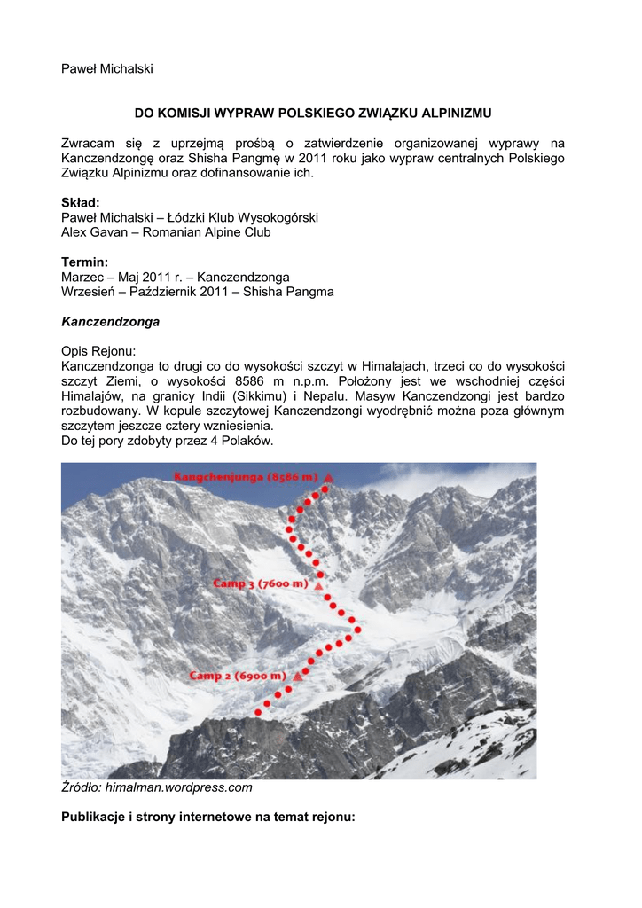 Paweł Michalski DO KOMISJI WYPRAW POLSKIEGO ZWIĄZKU ALPINIZMU Zwracam się z uprzejmą prośbą o zatwierdzenie organizowanej wyprawy na Kanczendzongę oraz Shisha Pangmę w 2011 roku jako wypraw centralnych Polskiego Związku Alpinizmu oraz dofinansowanie ich. Skład: Paweł Michalski – Łódzki Klub Wysokogórski Alex Gavan – Romanian Alpine Club Termin: Marzec – Maj 2011 r. – Kanczendzonga Wrzesień – Październik 2011 – Shisha Pangma Kanczendzonga Opis Rejonu: Kanczendzonga to drugi co do wysokości szczyt w Himalajach, trzeci co do wysokości szczyt Ziemi, o wysokości 8586 m n.p.m. Położony jest we wschodniej części Himalajów, na granicy Indii (Sikkimu) i Nepalu. Masyw Kanczendzongi jest bardzo rozbudowany. W kopule szczytowej Kanczendzongi wyodrębnić można poza głównym szczytem jeszcze cztery wzniesienia. Do tej pory zdobyty przez 4 Polaków. Źródło: himalman.wordpress.com Publikacje i strony internetowe na temat rejonu: Korona Himalajów – Richard Sale, John Cleare www.mounteverest.net http://www.8000ers.com/cms/kangchenjunga-general-info-193.html http://www.summitpost.org/kangchenjunga/150283 http://everestnews.com/ Nasze plany: Wyprawa planuje wspinaczkę na Kanczendzongę od strony południowo zachodniej, drogą pierwszych zdobywców – Brytyjczyków. Koszty: Przewidywany koszt wyjazdu dla jednej osoby to około 35 tys. PLN. Chciałbym prosić o rozpatrzenie dofinansowanie jednego członka wyprawy - mojej osoby w wysokości 10 tys. PLN Kosztorys: Bilety lotnicze Obsługa agencji i permit: Cargo, uzupełnienie sprzętu 4 000 28 000 3 000 ________ 35 000 PLN Zasady finansowania: Sponsor: 15 000 PLN Udział własny: 10 000 PLN PZA: 10 000. PLN Shisha Pangma Opis Rejonu: Najniższy z ośmiotysięczników – 8013 m n.p.m. (lub 8027, 8046 w różnych źródłach), szczyt na terytorium Tybetu w Himalajach Wysokich, ok. 120 km na północny zachód od grupy Mount Everestu Publikacje i strony internetowe na temat rejonu: 8000 meters to live for – Simone Moro Korona Himalajów – Richard Sale, John Cleare www.mounteverest.net http://www.8000ers.com/cms/shisha-pangma-general-info-198.html http://www.summitpost.org/shisha-pangma/150807 http://everestnews.com/ Nasze plany: Wyprawa planuje wspinaczkę na Shisha Pangmę od strony wschodniej do tej pory nie eksplorowanej. Zamierzamy wytyczyć nową drogę zgodnie z naniesioną czerwoną linią ciągłą na Zdjęciu 1 i 2. Na Zdjęciu 2, czerwonymi strzałkami oznaczona jest droga normalna z obozu 3 na szczyt – od strony północnej. Bazę Główną planujemy rozbić nad jeziorem lodowcowym u stóp ściany wschodniej Zdjęcie 2. Zdjęcie 1 Źródło: nieznane (Internet) Zdjęcie 2 Źródło: Google Earth Koszty: Przewidywany koszt wyjazdu dla jednej osoby to około 40 tys. PLN. Chciałbym prosić o rozpatrzenie dofinansowanie jednego członka wyprawy - mojej osoby w wysokości 15 tys. PLN Kosztorys: Bilety lotnicze Obsługa agencji i permit: Cargo, rekonesans lotniczy 4 000 33 000 3 000 ________ 40 000 PLN Zasady finansowania: Sponsor: 15 000 PLN Udział własny: 10 000 PLN PZA: 15 000. PLN PODSUMOWANIE Zdobycie obydwu gór planujemy bez użycia dodatkowego tlenu. Wiosną 2011 po wyprawie na Kanczendzongę zamierzamy przeprowadzić rekonesans lotniczy (w celu ewentualnej korekty planowanej drogi) w rejonie wschodniej ściany Shisha Pangmy. Dotychczasowe dofinansowania PZA: Nie korzystałem do tej pory z dofinansowania z PZA. Dziękuje za rozpatrzenie mojej prośby. Z taternickim pozdrowieniem, Paweł Michalski