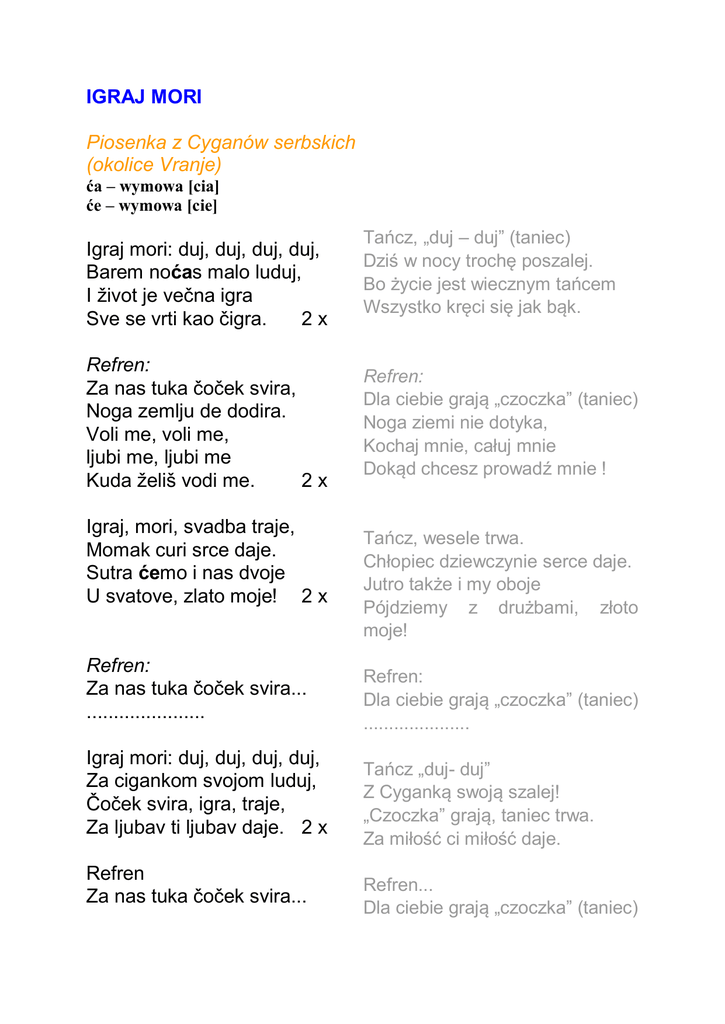 IGRAJ MORI Piosenka z Cyganów serbskich (okolice Vranje) ća – wymowa [cia] će – wymowa [cie] Igraj mori: duj, duj, duj, duj, Barem noćas malo luduj, I život je večna igra Sve se vrti kao čigra. 2x Refren: Za nas tuka čoček svira, Noga zemlju de dodira. Voli me, voli me, ljubi me, ljubi me Kuda želiš vodi me. 2x Igraj, mori, svadba traje, Momak curi srce daje. Sutra ćemo i nas dvoje U svatove, zlato moje! 2 x Refren: Za nas tuka čoček svira... ...................... Igraj mori: duj, duj, duj, duj, Za cigankom svojom luduj, Čoček svira, igra, traje, Za ljubav ti ljubav daje. 2 x Refren Za nas tuka čoček svira... Tańcz, „duj – duj” (taniec) Dziś w nocy trochę poszalej. Bo życie jest wiecznym tańcem Wszystko kręci się jak bąk. Refren: Dla ciebie grają „czoczka” (taniec) Noga ziemi nie dotyka, Kochaj mnie, całuj mnie Dokąd chcesz prowadź mnie ! Tańcz, wesele trwa. Chłopiec dziewczynie serce daje. Jutro także i my oboje Pójdziemy z drużbami, złoto moje! Refren: Dla ciebie grają „czoczka” (taniec) ..................... Tańcz „duj- duj” Z Cyganką swoją szalej! „Czoczka” grają, taniec trwa. Za miłość ci miłość daje. Refren... Dla ciebie grają „czoczka” (taniec)