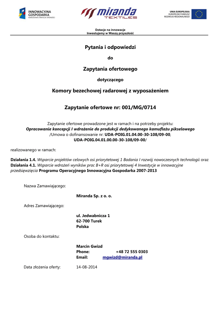 Dotacje na innowacje Inwestujemy w Waszą przyszłość Pytania i odpowiedzi do Zapytania ofertowego dotyczącego Komory bezechowej radarowej z wyposażeniem Zapytanie ofertowe nr: 001/MG/0714 Zapytanie ofertowe prowadzone jest w ramach i na potrzeby projektu: Opracowanie koncepcji I wdrożenie do produkcji dedykowanego kamuflażu pikselowego /Umowa o dofinansowanie nr: UDA-POIG.01.04.00-30-108/09-00, UDA-POIG.04.01.00.00-30-108/09-00/ realizowanego w ramach: Działania 1.4. Wsparcie projektów celowych osi priorytetowej 1 Badania I rozwój nowoczesnych technologii oraz Działania 4.1. Wsparcie wdrożeń wyników prac B+R osi priorytetowej 4 Inwestycje w innowacyjne przedsięwzięcia Programu Operacyjnego Innowacyjna Gospodarka 2007-2013 Nazwa Zamawiającego: Miranda Sp. z o. o. Adres Zamawiającego: ul. Jedwabnicza 1 62-700 Turek Polska Osoba do kontaktu: Marcin Gwizd Phone: +48 72 555 0303 Email: [email protected] Data złożenia oferty: 14-08-2014 Dotacje na innowacje Inwestujemy w Waszą przyszłość P1. W nawiązaniu do w/w zapytania ofertowego prosimy o wyjaśnienie różnicy między punktami: 1.1 Harmonogram postępowania oraz 2.3 Pytania. W punkcie 1.1 jest napisane, że etap pytania/odpowiedzi będzie trwał do 08.08.2014, natomiast w punkcie 2.3 podano, iż ewentualne pytania należy składać do 14.07.2014 przed 12.00. Odpowiedź: Po przeanalizowaniu harmonogramu ustalono, że ostateczny termin na zadawanie pytań zostaje ustalony na 06.08.2014 do godziny 12:00, natomiast odpowiedzi będą podane do 07.08.2014. P2. Punkt 2.8 Oferowana cena mówi, że oferowana cena powinna zawierać VAT. Oferent, który ma siedzibę zagranicą oferuje cenę netto. Odpowiedź: Punkt 2.8 mówi: „Cena zaproponowana przez Oferenta powinna obejmować podatek VAT, a także wszystkie inne podatki obciążające oferowany sprzęt". Jeżeli sprzedawca jest podmiotem zagranicznym, wtedy VAT nie ma zastosowania, a dla tych sprzedawców dopuszczalne jest podawanie w ofercie ceny netto P3. Czy ciężary naszych nowych absorberów są do zaakceptowania dla Spółki Miranda, czy też wymagane jest dostarczenie naszych starych absorberów? Zalecamy dostarczenie nowych absorberów, ponieważ ich właściwości elektromagnetyczne są identyczne lub lepsze w porównaniu do starych absorberów, natomiast ich ogólny wygląd jest lepszy. Odpowiedź: Proszę odnieść się do Załącznika 1 do zapytania ofertowego. Po szczegółowej analizie, specyfikacje wymagań absorbera zostały zmienione. Dotacje na innowacje Inwestujemy w Waszą przyszłość P4. Czy Spółka Miranda wyraża zgodę na dostarczenie naszych (marka usunięta) płaskich absorberów na pokrycie narożników komory bezechowej, czy też należy dostarczyć, zamiast płaskich absorberów z pianki, małe piankowe absorbery piramidowe w celu uzyskania - 30 dB odbicia w narożnikach komory? Zdecydowanie zalecamy, aby używać płaskich absorberów (marka usunięta), ponieważ zostało udowodnione wielokrotnie, że działają doskonale. Odpowiedź: Proszę odnieść się do Załącznika 1 do zapytania ofertowego. Po szczegółowej analizie, specyfikacje wymagań absorbera zostały zmienione. P5. Prosimy o określenie który absorber piramidowy (1 czy 2) ma zostać ułożony na ścianach komory, a który na podłodze? Odpowiedź: Zamierzamy pokryć całą ścianę komory przeciwległą do anteny nadawczej (ściana za cichą strefą) oraz krytyczne obszary na obu ścianach bocznych, suficie i podłodze używając: absorbera 1. wymagana szacunkowa ilość 370 szt. Ścianę emitującą (ściana za anteną nadawczą) a także mniej krytyczne obszary ścian bocznych, sufitu i podłogi planuje się pokryć: absorberem 2. wymagana szacunkowa ilość 335 szt. Wszystkie narożniki komory zostaną pokryte: absorberem 3. wymagana szacunkowa ilość 200 szt. Dotacje na innowacje Inwestujemy w Waszą przyszłość P6. Prosimy o określenie jakim złączem (typ oraz płeć) ma być zakończony każdy z wymaganych przewodów. Odpowiedź: Połączenie będzie między antenami i analizatorem dla każdego z kabli. Prosimy o odpowiednie dopasowanie zakończeń. P7. Prosimy o określenie jakie ma być maksymalne tłumienie zaoferowanych przewodów (dB/m). Odpowiedź: Prosimy o przedstawienie preferowanego typu przewodu oraz jego możliwości. Przewód zostanie wybrany na podstawie specyfikacji oraz ceny. P8. Czy Zamawiający wymaga aby zaoferowane przewody były elastyczne? Jeżeli tak, prosimy o określenie minimalnego promienia gięcia kabla. Odpowiedź: Tak, kable powinny być elastyczne. Minimalny promień gięcia nie powinien być mniejszy niż 10krotność średnicy kabla. P9. Prosimy o określenie czy wymagane jest przedstawienie parametrów teoretycznych absorberów, czy zmierzonych? Dotacje na innowacje Inwestujemy w Waszą przyszłość Odpowiedź: Wymagane są zmierzone (gwarantowane) wyniki. Prosimy o zawarcie zmierzonych wyników w ofercie P10. Czy Zamawiający wymaga zaoferowania konwertera fal milimetrowych 75 – 110 GHz posiadającego możliwość pomiaru pełnej macierzy rozproszenia S? Odpowiedź: Pomiary będą wykonywane „in cross and co-polarizations” odbicia, transmisji i rozproszenia. Konwerter fal milimetrowych powinien być zgodny z tymi pomiarami. P11. Czy Zamawiający dopuszcza zaoferowanie analizatora obwodów, który posiada parametry techniczne zgodne z Tabelą nr 1? Tabela nr 1 Nr Parametr Parametr oferowany Konfiguracja: - urządzenie czteroportowe 1 Konfiguracja - dwa wbudowane generatory - możliwość podłączenia konwerterów 75-110GHz bez potrzeby modyfikacji analizatora 2 Zakres częstotliwości 10MHz - 50GHz Dotacje na innowacje Inwestujemy w Waszą przyszłość 3 Rozdzielczość częstotliwości ≤1Hz 4 Pasmo pomiaru 1Hz ÷ 1MHz Od -30dBm do: 10MHz do 50MHz: +12dBm 50MHz do 16GHz: +13dBm 16GHz do 26,5GHz: +13dBm Regulowany poziom wyjścia (na 5 wszystkich portach z zainstalowaną opcją bezpośredniego dostępu do generator