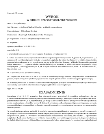 Sygn. akt I C 109/11 WYROK W IMIENIU RZECZYPOSPOLITEJ POLSKIEJ Dnia 21 listopada 2013r. Sąd Okręgowy w Siedlcach Wydział I Cywilny w składzie następującym: Przewodniczący- SSO Jolanta Hryciuk Protokolant – st.sekr.sąd. Barbara Karwowska- Wierzejska po rozpoznaniu w dniu 21 listopada 2013r. w Siedlcach na rozprawie sprawy z powództwa W. S. i H. S. (1) przeciwko S. D. o ustalenie nieważności umowy i zobowiązanie do złożenia oświadczenia woli I. ustala nieważność umowy sprzedaży nieruchomości położonych w miejscowości J., gmina H., województwo (...) oznaczonych w ewidencji gruntów nr (...) o powierzchni 0,2481 ha, dla której Sąd Rejonowy w Mińsku Mazowieckim prowadzi księgę wieczystą nr (...) o powierzchni 0,2500 ha dla której Sąd Rejonowy w Mińsku Mazowieckim prowadzi księgę wieczystą nr (...) o powierzchni 0,1500 ha dla której Sąd Rejonowy w Mińsku Mazowieckim prowadzi księgę wieczystą nr (...) zawartej pomiędzy W. S., H. S. (2) D. w dniu 20 października 2010r. przed J. S. notariuszem w W., Repertorium (...); II. w pozostałej części powództwo oddala; III. zasądza od S. D. na rzecz W. S. i H. S. (1) kwotę 10 200 (dziesięć tysięcy dwieście) złotych tytułem zwrotu kosztów procesu, w tym kwotę 7200 (siedem tysięcy dwieście) złotych tytułem zwrotu kosztów zastępstwa procesowego; IV. nakazuje pobrać od S. D. na rzecz Skarbu Państwa kwotę 73 966,49 złotych (siedemdziesiąt trzy tysiące dziewięćset sześćdziesiąt sześć złotych czterdzieści dziewięć groszy) tytułem kosztów sądowych. Sygn. akt I C 109/11 UZASADNIENIE Powodowie W. S. i H. S. (1) w pozwie z dnia 26 stycznia 2011r., przeciwko S. D. wnieśli na podstawie art. 189 kpc o stwierdzenie nieważności umowy sprzedaży nieruchomości zawartej z pozwanym w dniu 20 października 2010r. przed notariuszem w W., J. S., repertorium (...) z uwagi na oświadczenie złożone przez powodów w dniu 3 listopada 2010r. o uchyleniu się od skutków prawnych złożonych oświadczeń woli, wskazujące, iż powodowie podczas zawarcia umowy działali pod wpływem błędu co do treści czynności prawnej oraz o zasądzenie od pozwanego na rzecz powodów kosztów procesu. W uzasadnieniu powodowie podnieśli, iż w związku z prowadzoną działalnością gospodarczą poznali pozwanego S. D., który wykazał duże zainteresowanie prowadzonymi przez powodów inwestycjami w branży hotelarskiej na terenie miejscowości J., gmina H.. Powodowie byli właścicielami nieruchomości oznaczonej jako działka (...) o powierzchni 0,2481 ha w J., dla której Sąd Rejonowy w Mińsku Mazowieckim prowadzi księgę wieczystą nr (...) o powierzchni 0,25 ha dla której Sąd Rejonowy w Mińsku Mazowieckim prowadzi księgę wieczystą nr (...) o powierzchni 0,15 ha dla której Sąd Rejonowy w Mińsku Mazowieckim prowadzi księgę wieczystą nr (...). Na tych nieruchomościach posadowiony jest pomocniczy budynek mieszkalny o powierzchni użytkowej 600 m.kw., dwa budynki o funkcji hotelowo-usługowej o powierzchni 7600 m.kw.(w trakcie budowy, stan zaawansowania ok. 40% stanu finalnego) oraz o powierzchni 1800 m.kw. (w trakcie budowy , stan zaawansowania prac ok. 85% stanu finalnego). Łączna powierzchnia użytkowa obiektów wynosi 10 000 m.kw. Wartość tego majątku wynosi ok. 28 000 000 złotych, zaś po dokończeniu inwestycji wzrośnie do ponad 50 000 000 złotych. Pozwany zaproponował dofinansowanie prowadzonych inwestycji w ramach ewentualnego rozpoczęcia współpracy gospodarczej lub w ramach udzielenia powodom pożyczki. W celu udzielenia pożyczki strony umówiły się u notariusza J. S.. W. S. dostarczył do notariusza operat szacunkowy nieruchomości. Spotkanie miało miejsce w dniu 20 października 2010r., na krótko przed zamknięciem kancelarii. Notariusz odczytał jedynie informacje, kto staje do aktu i jaką kwotę miał na rzecz powodów przekazać S. D.. Pozwany przekazał pieniądze gotówką. Powód, pozwany i obecny W. K. dokonywali przeliczenia gotówki, zaś notariusz w tym czasie czytał wskazane fragmenty aktu notarialnego. Następnie poproszono powodów o złożenie podpisów pod umową pożyczki. Notariusz poinformował, iż odpis aktu będą mogli uzyskać za 2-3dni. Taki odpis otrzymali w dniu 27 października 2010r. i stwierdzili, iż wydany dokument nosi tytuł umowa sprzedaży. W dniu 3 listopada 2010r. powodowie złożyli oświadczenie o uchyleniu się przez nich od skutków prawnych złożonych oświadczeń woli, wskazujące, iż podczas zawarcia umowy działali pod wpływem błędu co do treści czynności prawnej. Powodowie podnieśli, iż działali oni w przeświadczeniu, że zawierana ze S. D. umowa jest umową pożyczki kwoty 1 400 000 złotych, której zabezpieczeniem miało być zobowiązanie do przeniesienia własności nieruchomości S. D., a nie ich definitywna sprzedaż. Wskazali, iż kwota 1 400 000 złotych nie odpowiada wartości rynkowej nieruchomości, która została określona na kwotę 27 938 000 złotych przez rzeczoznawcę majątkowego P. T.. W odpowiedzi na pozew pozwany S. D. wniósł o oddalenie powództwa. Pozwany zaprzeczył twierdzeniom powodów dotyczącym okoliczności zawarcia przez strony umowy w dniu 20 października 2010r. Wskazał, iż umowa została zawarta z zachowaniem wszelkich zasad sporządzania aktu notarialnego. W szczególności notariusz J. S. odczytał akt stronom umowy oraz wyjaśnił skutki dokonywanej przez nich czynności notarialnej, czego świadkami byli M. O. i W. K.. Pozwany zaprzeczył, aby przed datą zawarcia umowy otrzymał operat szacunkowy, z którego wynikałaby wartość nieruchomości około 28 mln złotych. W treści aktu również brakuje wzmianki o tym operacie, co uzasadnia wniosek, iż notariusz J. S. także nie otrzymał tego operatu. Podniósł, iż operat dotyczył działek o numerach (...) stanowiących zorganizowaną jednostkę gospodarczą w trakcie realizacji inwestycji, a umowa obejmowała 
