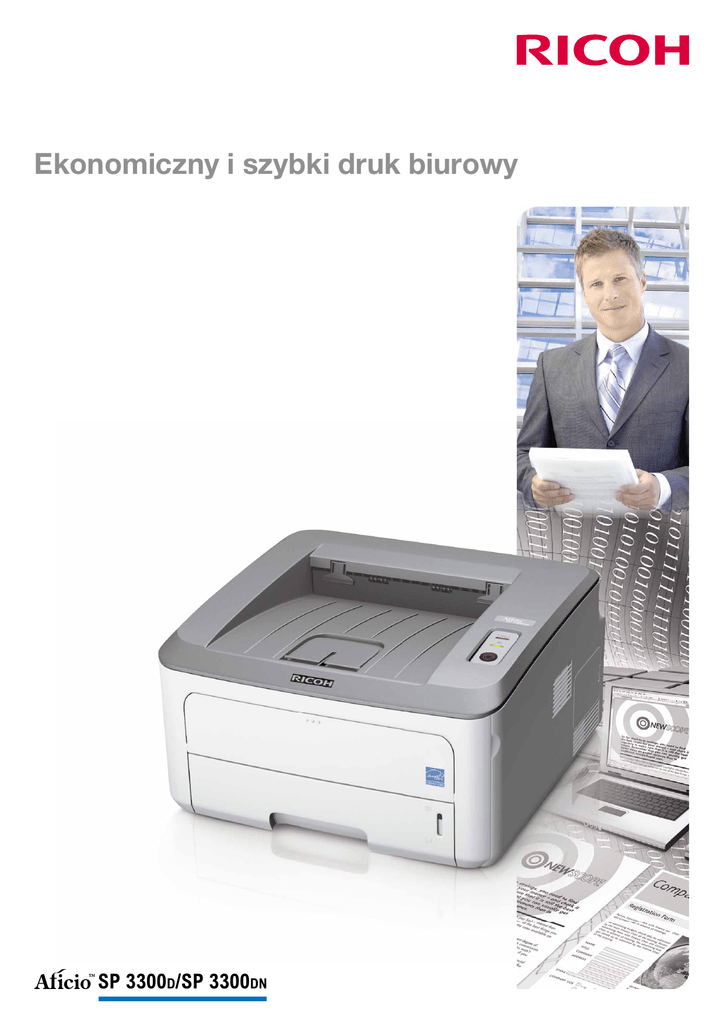 Ekonomiczny i szybki druk biurowy SP 3300D/SP 3300DN Wyjątkowe zalety i wysoka wydajność Efektywny druk na każdą kieszeń The Aficio™SP 3300D/SP 3300DN to para doskonałych małych i ekonomicznych drukarek idealne do biura domowego, małej lub średniej grupy roboczej. Tanie i kompaktowe, czarno białe drukarki laserowe formatu A4 sprawdzą się w codziennej pracy biurowej. Sprawdzone rozwiązania gwarantują: wysoką prędkość druku, ponadprzeciętną jakość, druk dwustronny w standardzie, intuicyjność w obsłudze. Aficio™SP 3300D/SP 3300DN posiadają wszystko czego oczekujesz od małej drukarki. • Wysoka wydajność : 28 wydruków na minutę. • Rozdzielczość do 1200 x 1200 dpi. • Wbudowany automatyczny dupleks. • Zaawansowane rozwiązania sieciowe (SP 3300DN). • Emulacja PostScript® 3, PCL6. Przyspiesz swoją pracę • 22 sekundowy czas nagrzewania a pierwszy wydruk już po 8,5 sek. 8.5 sec • Szybki procesor 400 MHz. • Prędkość druku ciągłego do 28 stron na minutę. • Oszczędność papieru dzięki możliwości druku kilku stron na jednym arkuszu. • Formularze oraz papier firmowy mogą być drukowane na zwykłym papierze. 28 ppm Obniżanie kosztów Aficio™SP 3300D/SP 3300DN zostały skonstruowane głównie pod kątem obniżenia całkowitego kosztu posiadania (TCO): • Rozszerzona funkcjonalność za przystępną cenę. • Niski koszt pojedynczego wydruku dzięki wysokiej wydajności materiałów eksploatacyjnych. • Ograniczony pobór mocy dzięki funkcji oszczędzania prądu. • Miesięczny cykl duty sięgający 50000 stron zapewnia wysoką produktywność. • Tryb TonerSave™ podwyższa wydajność tonera i pomaga zmniejszyć TCO. Zrób doskonałe wrażenie Gwarantujemy bezbłędne wydruki o jakości do 1200 dpi, dzięki czemu możesz tworzyć dokumenty o profesjonalnym wyglądzie na miejscu w firmie. Indywidualnie regulowane znaki wodne sprawią, że Twoje dokumenty będą wyróżniać się delikatnymi znakami wodnymi na każdej stronie, np. „Osobiste” lub „Poufne”. Co więcej, z użyciem Poster Print możesz powiększyć dokument i wydrukować go na wielu stronach. Potem wystarczy połączyć strony ze sobą, by zrobić prawdziwie ogromne wrażenie. Szeroki profil obsługiwanego papieru Pomimo swych małych rozmiarów drukarki Aficio™SP 3300D/ SP 3300DN oferują obsługę szerokiej gamy nośników: A4 > A5 Etykiety • Standardowa oraz opcjonalna kaseta na papier mieszczące 250 arkuszy podają papier w rozmiarach od A4 do A5. • Duży wybór opcji: podajnik ręczny na nagłówki, koperty, etykiety przeźrocza, pocztówki i gruby papier do 163 g/m2. • Prosta ścieżka papieru z podajnika ręcznego do tylnej kasety odbiorczej minimalizuje ryzyko zacięcia papieru. Oszczędzaj miejsce Idealne do małego biura domowego lub małej grupy roboczej, Aficio™SP 3300D/SP 3300DN zostały zaprojektowane z myślą o małych gabarytach w ograniczonym miejscu w biurze. Mała waga urządzenia pozwala na łatwe przenoszenie. Prostota obsługi i konserwacji Aficio™SP 3300D/SP 3300DN oferują niezrównanie prostą oraz intuicyjną obsługę. Status urządzenia jest cały czas wyświetlany na panelu operacyjnym. Toner w postaci kasety wymienia się w kilka sekund pozwalając Tobie na szybki powrót do pracy. Praca w sieci Obie drukarki oferują prostą łączność z Twoim komputerem: • Standardowe USB 2.0. • Druk z sieci (Aficio™SP 3300DN): karta Ethernet 10 base-T/100 base-TX. Ekologia Nasze dążenie do najwyższej jakości objawia się w każdej dziedzinie. Niski pobór mocy oraz wykorzystanie materiałów nietoksycznych oszczędzają w bardzo dużym stopniu środowisko naturalne. SP 3300D/SP 3300DN SPECYFIKACJA OGÓLNIE OBSŁUGA PAPIERU Technologia: Dioda laserowa, drukowanie elektrofotograficzne Prędkość druku ciągłego: 28 stron na minutę Czas nagrzewania: Mniej niż 22 sek. Pierwszy wydruk: Mniej niż 8,5 sek. Pojemność wejściowa papieru: Standard: Maksimum: Pojemność wyjściowa papieru: Standard: Wymiary (Szer. x Gł. x Wys.): 364 x 369 x 209.6 mm Waga: 8,8 kg Zasilanie: 220 - 240 V, 50/60 Hz Pobór mocy: Maksimum: Tryb oszczędzania energii: Cykl duty: 50.000 stron miesięcznie Mniej niż 750 W Mniej niż 11 W Kasety: Podajnik ręczny: Pamięć: Standard: Maksimum: Sterowniki: Windows® 2000/XP/Vista / Server 2003 Emulacja®PostScript 3: Windows® 2000/XP/ Vista /Server 2003 Macintosh 8.6 - 9.2.x (OS X Classic) Macintosh X v10.1 - 10.5 Gramatura: Simpleks: Dupleks: Podajnik ręczny: Nośniki: Zwykły papier, papier z recyklingu, przeźrocza, etykiety, koperty MATERIAŁY EKSPLOATACYJNE Kartridż: Czarny: 5000 arkuszy1 Aficio™SP 3300D/SP 3300DN dostarczane są z tonerami startowymi. 32 MB 160 MB PCL6: OPCJE Opcje wewnętrzne: 128 MB SDRAM DIMM Opcje zewnętrzne: 1 x 250-sheet paper tray 1 Wartość zadruku zgodna z normą ISO/IEC19752. Dostępność urządzeń, opcji oraz oprogramowania prosimy skonsultować z najbliższym dostawcą Ricoh. SIEĆ Wspierane środowiska: A4 – A5 A4 – A6 60 - 105 g/m2 75 - 90 g/m2 60 - 163 g/m2 400 MHz Język drukarki/rozdzielczość: PCL6: 600 x 600 dpi/1200 x 1200 dpi Emulacja®PostScript 3: 600 x 600 dpi/ 1200 x 1200 dpi Protokoły sieciowe: 150 arkuszy Rozmiar papieru: KONTROLER Procesor: Kaseta na 250 arkuszy Podajnik ręczny na 1 arkusz 501 arkuszt TCP/IP, EtherTalk, SNMP, HTTP1.1 Windows® 2000/XP/Vista /Server 2003 Macintosh 8.6 - 9.2.x (OS X Classic) Macintosh X v10.1 - 10.5 USB 2.0 Ethernet 10 base-T/100 base-TX (Aficio™SP 3300DN) Certyfikat ISO9001: 2000 Certyfikat ISO14001 Niniejsze produkty zostały zaprojektowane aby spełniać wymogi dotyczące wydajności energetycznej EC ENERGY STAR. Ricoh wierzy w zachowanie cennych naturalnych zasobów Ziemi. Niniejsza broszura została wydrukowana na papierze przyjaznym dla środowiska naturalnego: 50% włókien z odzysku, 50% wybielana bezchlorkowo pulpa papierowa. Wszystkie marki i/lub produkty są nazwami handlowymi ic