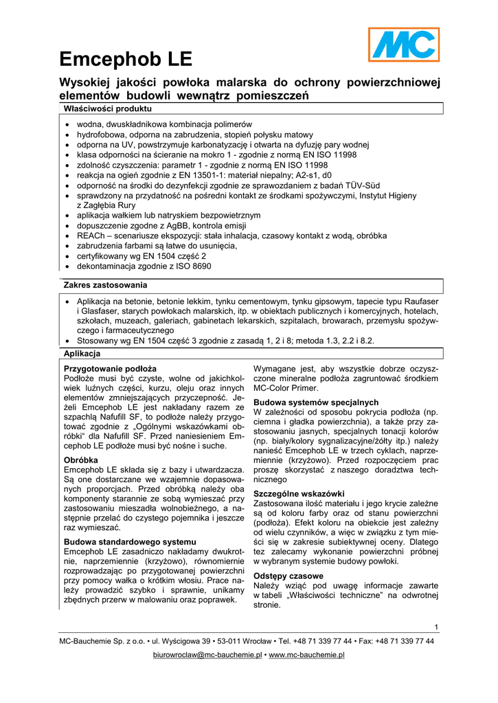 Emcephob LE Wysokiej jakości powłoka malarska do ochrony powierzchniowej elementów budowli wewnątrz pomieszczeń Właściwości produktu wodna, dwuskładnikowa kombinacja polimerów hydrofobowa, odporna na zabrudzenia, stopień połysku matowy odporna na UV, powstrzymuje karbonatyzację i otwarta na dyfuzję pary wodnej klasa odporności na ścieranie na mokro 1 - zgodnie z normą EN ISO 11998 zdolność czyszczenia: parametr 1 - zgodnie z normą EN ISO 11998 reakcja na ogień zgodnie z EN 13501-1: materiał niepalny; A2-s1, d0 odporność na środki do dezynfekcji zgodnie ze sprawozdaniem z badań TÜV-Süd sprawdzony na przydatność na pośredni kontakt ze środkami spożywczymi, Instytut Higieny z Zagłębia Rury aplikacja wałkiem lub natryskiem bezpowietrznym dopuszczenie zgodne z AgBB, kontrola emisji REACh – scenariusze ekspozycji: stała inhalacja, czasowy kontakt z wodą, obróbka zabrudzenia farbami są łatwe do usunięcia, certyfikowany wg EN 1504 część 2 dekontaminacja zgodnie z ISO 8690 Zakres zastosowania Aplikacja na betonie, betonie lekkim, tynku cementowym, tynku gipsowym, tapecie typu Raufaser i Glasfaser, starych powłokach malarskich, itp. w obiektach publicznych i komercyjnych, hotelach, szkołach, muzeach, galeriach, gabinetach lekarskich, szpitalach, browarach, przemysłu spożywczego i farmaceutycznego Stosowany wg EN 1504 część 3 zgodnie z zasadą 1, 2 i 8; metoda 1.3, 2.2 i 8.2. Aplikacja Przygotowanie podłoża Podłoże musi być czyste, wolne od jakichkolwiek luźnych części, kurzu, oleju oraz innych elementów zmniejszających przyczepność. Jeżeli Emcephob LE jest nakładany razem ze szpachlą Nafufill SF, to podłoże należy przygotować zgodnie z „Ogólnymi wskazówkami obróbki“ dla Nafufill SF. Przed naniesieniem Emcephob LE podłoże musi być nośne i suche. Obróbka Emcephob LE składa się z bazy i utwardzacza. Są one dostarczane we wzajemnie dopasowanych proporcjach. Przed obróbką należy oba komponenty starannie ze sobą wymieszać przy zastosowaniu mieszadła wolnobieżnego, a następnie przelać do czystego pojemnika i jeszcze raz wymieszać. Budowa standardowego systemu Emcephob LE zasadniczo nakładamy dwukrotnie, naprzemiennie (krzyżowo), równomiernie rozprowadzając po przygotowanej powierzchni przy pomocy wałka o krótkim włosiu. Prace należy prowadzić szybko i sprawnie, unikamy zbędnych przerw w malowaniu oraz poprawek. Wymagane jest, aby wszystkie dobrze oczyszczone mineralne podłoża zagruntować środkiem MC-Color Primer. Budowa systemów specjalnych W zależności od sposobu pokrycia podłoża (np. ciemna i gładka powierzchnia), a także przy zastosowaniu jasnych, specjalnych tonacji kolorów (np. biały/kolory sygnalizacyjne/żółty itp.) należy nanieść Emcephob LE w trzech cyklach, naprzemiennie (krzyżowo). Przed rozpoczęciem prac proszę skorzystać z naszego doradztwa technicznego Szczególne wskazówki Zastosowana ilość materiału i jego krycie zależne są od koloru farby oraz od stanu powierzchni (podłoża). Efekt koloru na obiekcie jest zależny od wielu czynników, a więc w związku z tym mieści się w zakresie subiektywnej oceny. Dlatego tez zalecamy wykonanie powierzchni próbnej w wybranym systemie budowy powłoki. Odstępy czasowe Należy wziąć pod uwagę informacje zawarte w tabeli „Właściwości techniczne” na odwrotnej stronie. 1 MC-Bauchemie Sp. z o.o. • ul. Wyścigowa 39 • 53-011 Wrocław • Tel. +48 71 339 77 44 • Fax: +48 71 339 77 44 [email protected] • www.mc-bauchemie.pl Właściwości techniczne Emcephob LE Parametr Jednostka Wartość* Uwagi Gęstość kg / dm³ 1,29 - Zawartość części stałych obj. % 46 Proporcje mieszania wagowo 10 : 1 Czas obróbki godzina 1 Czas schnięcia godzina dni 1,5 7 Standardowa budowa Zużycie** g/m² 2 x 140÷200 Odstępy czasowe pomiędzy nakładaniem kolejnych warstw godzina min. 1,5 maks. 72 min. 1 maks. 24 min. 2 Emcephob LE na Emcephob LE (przy +23°C) Emcephob LE na Emcephob LE (przy +30°C) MC-Color Primer / Emcephob LE (przy +23°C / +30°C) Warunki obróbki °C °C % K ≥ 8 - ≤ 30 ≥ 15 - ≤ 25 ≤ 80 3 temperatura powietrza i podłoża Emcephob LE Temperatura materiału Względna wilgotność powietrza Ponad temp. punktu rosy Baza : Utwardzacz suchość dotykowa odporność na obciążenie Charakterystyka produktu Emcephob LE Dostawa 10 kg pary pojemników Składowanie Okres przechowywania w fabrycznie zamkniętych opak. min. 12 m-cy. Przechowywać w pomieszczeniach chłodnych i suchych, chronić przed mrozem. Utylizacja Należy dokładnie opróżniać pojemniki przestrzegając w tym względzie informacji w sprawie opakowań. Na życzenie wysyłamy informacje pt. „Koncepcja firmy MC w sprawie utylizacji całkowicie opróżnionych opakowań transportowych i handlowych”. GISCODE: PU40 Regulacja EU 2004/42 RL2004/42/EG AII/J (140 g/l) < 15 g/l VOC * Wszystkie parametry techniczne są wartościami laboratoryjnymi i zostały otrzymane przy temp. + 23°C i 50% względnej wilgotności powietrza. Temperatura materiału mieściła się w przedziale pomiędzy +15°C, a +25°C. ** Ilości zużycia są uzależnione od stopnia szorstkości i temperatury podłoża, jak również sposobu przechowywania i temperatury obróbki. W celu ustalenia rzeczywistego zużycia w danych warunkach zalecamy wykonanie powierzchni próbnych. Uwaga: Dane zamieszczone w niniejszej informacji bazują na naszych doświadczeniach i najlepszej wiedzy, nie są one jednakże wiążące. Należy zawsze dostosować je do danego obiektu budowlanego, rodzaju zastosowania i specyficznych dla danego miejsca wymagań. Nasze informacje odnoszą się do ogólnie uznanych zasad technicznych, których należy przestrzegać w trakcie obróbki materiału. W ramach tych założeń ponosimy odpowiedzialność za prawidłowość powyższych informacji w ramach naszych Ogólnych Warunków Sprzedaży i Dostawy. Zalecenia podane przez naszych pracowników 