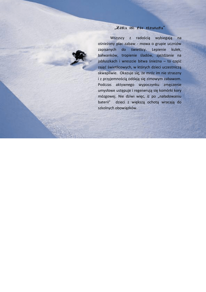 „Zima im nie straszna” Wszyscy z radością wybiegają na ośnieżony plac zabaw - mowa o grupie uczniów zapisanych do świetlicy. Lepienie kulek, bałwanków, tropienie śladów, zjeżdżanie na jabłuszkach i wreszcie bitwa śnieżna – to część zajęć świetlicowych, w których dzieci uczestniczą skwapliwie. Okazuje się, że mróz im nie straszny i z przyjemnością oddają się zimowym zabawom. Podczas aktywnego wypoczynku zmęczenie umysłowe ustępuje i regenerują się komórki kory mózgowej. Nie dziwi więc, iż po „naładowaniu baterii” dzieci z większą ochotą wracają do szkolnych obowiązków.