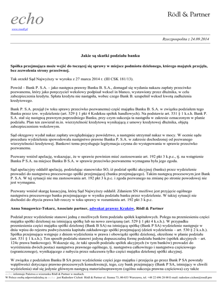 echo www.roedl.pl Rzeczpospolita z 24.09.2014 Jakie są skutki podziału banku Spółka przejmująca może wejść do toczącej się sprawy w miejsce podmiotu dzielonego, którego majątek przejęła, bez zezwolenia strony przeciwnej. Tak orzekł Sąd Najwyższy w wyroku z 27 marca 2014 r. (III CSK 181/13). Powód – Bank P. S.A. – jako następca prawny Banku B. S.A., domagał się wydania nakazu zapłaty przeciwko pozwanemu, który jako poręczyciel wekslowy podpisał weksel in blanco, wystawiony przez dłużnika, w celu zabezpieczenia kredytu. Spłata kredytu nie nastąpiła, wobec czego Bank B. uzupełnił weksel kwotą zadłużenia kredytowego. Bank P. S.A. przejął (w toku sprawy przeciwko pozwanemu) część majątku Banku B. S.A. w związku podziałem tego Banku przez tzw. wydzielenie (art. 529 § 1 pkt 4 Kodeksu spółek handlowych). Na podstawie art. 531 § 1 k.s.h. Bank P. S.A. stał się następcą prawnym poprzedniego Banku, przy czym sukcesja ta nastąpiła w zakresie oznaczonym w planie podziału. Plan ten zawierał m.in. wierzytelność kredytową wynikającą z umowy kredytowej dłużnika, objętą zabezpieczeniem wekslowym. Sąd okręgowy wydał nakaz zapłaty uwzględniający powództwo, a następnie utrzymał nakaz w mocy. W ocenie sądu procedura wydzielenia spowodowała następstwo prawne Banku P. S.A. w zakresie dochodzonej od pozwanego wierzytelności kredytowej. Bankowi temu przysługuje legitymacja czynna do występowania w sprawie przeciwko pozwanemu. Pozwany wniósł apelację, wskazując, że w sprawie powinien mieć zastosowanie art. 192 pkt 3 k.p.c., tj. na wstąpienie Banku P S.A. na miejsce Banku B S.A. w sprawie przeciwko pozwanemu wymagana była jego zgoda. Sąd apelacyjny oddalił apelację, podzielając stanowisko SO, iż podział spółki akcyjnej (banku) przez wydzielenie prowadzi do następstwa procesowego spółki przejmującej (banku przejmującego). Takim następcą procesowym jest Bank P. S.A. W tej sytuacji nie ma zastosowania art. 192 pkt 3 k.p.c. i zgoda pozwanego na zmianę po stronie powodowej nie jest wymagana. Pozwany wniósł skargę kasacyjną, którą Sąd Najwyższy oddalił. Zdaniem SN możliwe jest przyjęcie ogólnego następstwa procesowego banku przejmującego w wyniku podziału banku przez wydzielenie. W takiej sytuacji nie dochodzi do zbycia prawa lub rzeczy w toku sprawy w rozumieniu art. 192 pkt 3 k.p.c. Anna Smagowicz-Tokarz, Associate partner, adwokat prawny Kraków, Rödl & Partner Podział przez wydzielenie stanowi jedną z możliwych form podziału spółek kapitałowych. Polega na przeniesieniu części majątku spółki dzielonej na istniejącą spółkę lub na nowo zawiązaną (art. 529 § 1 pkt 4 k.s.h.). W przypadku przeniesienia części majątku spółki dzielonej (Bank B SA) na istniejącą spółkę (Bank P SA) wydzielenie następuje w dniu wpisu do rejestru podwyższenia kapitału zakładowego spółki przejmującej (dzień wydzielenia – art. 530 § 2 k.s.h.). Spółka przejmująca wstępuje z dniem wydzielenia w prawa i obowiązki spółki dzielonej, określone w planie podziału (art. 531 § 1 k.s.h.). Ten sposób podziału stanowi jedyną dopuszczalną formę podziału banków (spółek akcyjnych – art. 124c prawa bankowego). Wskazuje się, że taki sposób podziału spółek akcyjnych (w tym banków) prowadzi do wyróżnienia dwóch postaci następstwa prawnego ogólnego, tj. następstwa całkowitego i następstwa częściowego (ograniczonego), wynikającego z nabycia przez sukcesora tylko części majątku dzielonej spółki akcyjnej. W związku z podziałem Banku B SA przez wydzielenie części jego majątku i przejęcia go przez Bank P SA powstały wątpliwości dotyczące prawno-procesowych konsekwencji, tego, czy bank przejmujący (Bank P SA, istniejący w chwili wydzielenia) stał się jedynie głównym następcą materialnoprawnym (ogólna sukcesja prawna częściowa) czy także echo informuje Państwa o wizerunku Rödl & Partner w mediach. W Polsce osobą odpowiedzialną za echo jest Radosław Cichoń Rödl & Partner ul. Sienna 73, 00-833 Warszawa, tel. +48 22 696 28 00 E-mail: [email protected] ogólnym następcą procesowym w zakresie roszczeń (wierzytelności) dochodzonych przez bank dzielony przez wydzielenie (Bank B SA), a przypadających mu na podstawie planu podziału. W orzecznictwie prezentowane są dwa odmienne poglądy dotyczące procesowych skutków podziału spółki akcyjnej (banku) przez wydzielenie. Zgodnie z pierwszym podział taki prowadzi jedynie do następstwa ogólnego o charakterze materialnoprawnym, natomiast z racji autonomicznego charakteru instytucji prawa procesowego (i następstwa procesowego) brak podstaw do przyjęcia ogólnego następstwa procesowego z mocy prawa spółki przejmującej (wyrok SN z 8 kwietnia 2008 r., V CSK 410/08; postanowienie SN z 18 lutego 2009 r., I CZ 7/09). Według drugiego stanowiska ogólne następstwo procesowe może nastąpić także jako prawna konsekwencja podziału spółki akcyjnej (banku) przez wydzielenie. W tej sytuacji spółka przejmująca może wejść do toczącej się już sprawy z udziałem spółki objętej podziałem w miejsce spółki dzielonej (jako ogólny następca procesowy) bez koniecznego zezwolenia strony przeciwnej (postanowienie SN z 25 kwietnia 2012 r., II CSK 356/11). Oznacza to, że bank przejmujący zachowuje legitymację czynną, jeżeli stał się ogólnym sukcesorem prawnym wierzytelności objętych pozwem (i planem podziału). SN przychylił się do drugiego stanowiska. Uznał, że nie znajdzie zastosowania art. 192 pkt 3 k.p.c., zgodnie z którym z chwilą doręczenia pozwu zbycie w toku sprawy rzeczy lub prawa objętych sporem nie ma wpływu na bieg sprawy; nabywca może wejść na miejsce zbywcy za zezwoleniem strony przeciwnej. Z takim stanowiskiem należy się zgodzić. Nie jest zasadne przyjęcie, że podział banku (powoda), polegający na wydzieleniu części jego majątku i przejęciu go prz