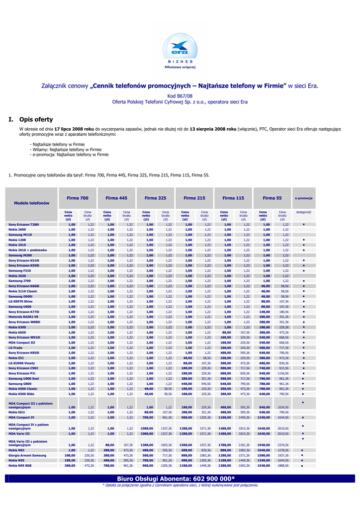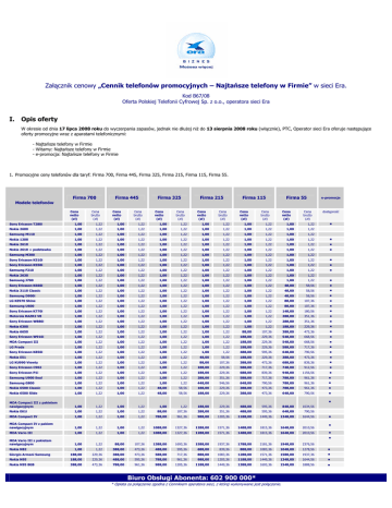 Załącznik cenowy „Cennik telefonów promocyjnych – Najtańsze telefony w Firmie” w sieci Era. Kod B67/08 Oferta Polskiej Telefonii Cyfrowej Sp. z o.o., operatora sieci Era I. Opis oferty W okresie od dnia 17 lipca 2008 roku do wyczerpania zapasów, jednak nie dłużej niż do 13 sierpnia 2008 roku (włącznie), PTC, Operator sieci Era oferuje następujące oferty promocyjne wraz z aparatami telefonicznymi: - Najtańsze telefony w Firmie - Witamy: Najtańsze telefony w Firmie - e-promocja: Najtańsze telefony w Firmie 1. Promocyjne ceny telefonów dla taryf: Firma 700, Firma 445, Firma 325, Firma 215, Firma 115, Firma 55. Firma 700 Firma 445 Firma 325 Firma 215 Firma 115 Firma 55 e-promocje Modele telefonów Cena netto (zł) Cena brutto (zł) Cena netto (zł) Cena brutto (zł) Cena netto (zł) Cena brutto (zł) Cena netto (zł) Cena brutto (zł) Cena netto (zł) Cena brutto (zł) Cena netto (zł) Cena brutto (zł) dostępność ■ Sony Ericsson T280i 1,00 1,22 1,00 1,22 1,00 1,22 1,00 1,22 1,00 1,22 1,00 1,22 Nokia 2600 1,00 1,22 1,00 1,22 1,00 1,22 1,00 1,22 1,00 1,22 1,00 1,22 Samsung M110 1,00 1,22 1,00 1,22 1,00 1,22 1,00 1,22 1,00 1,22 1,00 1,22 Nokia 1208 1,00 1,22 1,00 1,22 1,00 1,22 1,00 1,22 1,00 1,22 1,00 1,22 ■ Nokia 2610 1,00 1,22 1,00 1,22 1,00 1,22 1,00 1,22 1,00 1,22 1,00 1,22 ■ Nokia 2610 + podstawka 1,00 1,22 1,00 1,22 1,00 1,22 1,00 1,22 1,00 1,22 1,00 1,22 ■ Samsung M300 1,00 1,22 1,00 1,22 1,00 1,22 1,00 1,22 1,00 1,22 1,00 1,22 Sony Ericsson K510i 1,00 1,22 1,00 1,22 1,00 1,22 1,00 1,22 1,00 1,22 1,00 1,22 ■ Sony Ericsson K550i 1,00 1,22 1,00 1,22 1,00 1,22 1,00 1,22 1,00 1,22 1,00 1,22 ■ Samsung F210 1,00 1,22 1,00 1,22 1,00 1,22 1,00 1,22 1,00 1,22 1,00 1,22 ■ Nokia 2630 1,00 1,22 1,00 1,22 1,00 1,22 1,00 1,22 1,00 1,22 1,00 1,22 Samsung J700 1,00 1,22 1,00 1,22 1,00 1,22 1,00 1,22 1,00 1,22 1,00 1,22 ■ Sony Ericsson K660i 1,00 1,22 1,00 1,22 1,00 1,22 1,00 1,22 1,00 1,22 48,00 58,56 ■ Nokia 3110 Classic 1,00 1,22 1,00 1,22 1,00 1,22 1,00 1,22 1,00 1,22 48,00 58,56 ■ Samsung D900i 1,00 1,22 1,00 1,22 1,00 1,22 1,00 1,22 1,00 1,22 48,00 58,56 ■ LG KE970 Shine 1,00 1,22 1,00 1,22 1,00 1,22 1,00 1,22 1,00 1,22 88,00 107,36 ■ Samsung U600 1,00 1,22 1,00 1,22 1,00 1,22 1,00 1,22 1,00 1,22 88,00 107,36 ■ Sony Ericsson K770i 1,00 1,22 1,00 1,22 1,00 1,22 1,00 1,22 1,00 1,22 148,00 180,56 ■ Motorola RAZR2 V8 1,00 1,22 1,00 1,22 1,00 1,22 1,00 1,22 1,00 1,22 288,00 351,36 ■ Sony Ericsson W880i 1,00 1,22 1,00 1,22 1,00 1,22 1,00 1,22 1,00 1,22 288,00 351,36 ■ Nokia 6300 1,00 1,22 1,00 1,22 1,00 1,22 1,00 1,22 1,00 1,22 188,00 229,36 ■ Nokia 6650 1,00 1,22 1,00 1,22 1,00 1,22 1,00 1,22 88,00 107,36 388,00 473,36 ■ Sony Ericsson W910i 1,00 1,22 1,00 1,22 1,00 1,22 1,00 1,22 188,00 229,36 548,00 668,56 ■ MDA Compact III 1,00 1,22 1,00 1,22 1,00 1,22 1,00 1,22 188,00 229,36 548,00 668,56 ■ LG Prada 1,00 1,22 1,00 1,22 1,00 1,22 1,00 1,22 188,00 229,36 588,00 717,36 ■ Sony Ericsson K850i 1,00 1,22 1,00 1,22 1,00 1,22 1,00 1,22 488,00 595,36 648,00 790,56 ■ Nokia E51 1,00 1,22 1,00 1,22 1,00 1,22 48,00 58,56 188,00 229,36 388,00 473,36 ■ LG KU990 Viewty 1,00 1,22 1,00 1,22 1,00 1,22 88,00 107,36 388,00 473,36 688,00 839,36 ■ Sony Ericsson C902 1,00 1,22 1,00 1,22 1,00 1,22 188,00 229,36 588,00 717,36 748,00 912,56 ■ Sony Ericsson P1i 1,00 1,22 1,00 1,22 1,00 1,22 188,00 229,36 688,00 839,36 948,00 1156,56 ■ Samsung U900 Soul 1,00 1,22 1,00 1,22 1,00 1,22 288,00 351,36 588,00 717,36 788,00 961,36 ■ Samsung G800 1,00 1,22 1,00 1,22 1,00 1,22 448,00 546,56 648,00 790,56 788,00 961,36 ■ Nokia 6500 Classic 1,00 1,22 1,00 1,22 48,00 58,56 188,00 229,36 388,00 473,36 788,00 961,36 ■ Nokia 6500 Slide 1,00 1,22 1,00 1,22 48,00 58,56 188,00 229,36 388,00 473,36 648,00 790,56 ■ MDA Compact III z pakietem nawigacyjnym 1,00 1,22 1,00 1,22 1,00 1,22 188,00 229,36 488,00 595,36 848,00 1034,56 Nokia E61i 1,00 1,22 1,00 1,22 88,00 107,36 288,00 351,36 488,00 595,36 648,00 790,56 MDA Compact IV 1,00 1,22 1,00 1,22 788,00 961,36 988,00 1205,36 1188,00 1449,36 1348,00 1644,56 MDA Compact IV z pakiem nawigacyjnym 1,00 1,22 1,00 1,22 1088,00 1327,36 1288,00 1571,36 1488,00 1815,36 1648,00 2010,56 MDA Vario III 1,00 1,22 1,00 1,22 1088,00 1327,36 1288,00 1571,36 1488,00 1815,36 1648,00 2010,56 MDA Vario III z pakietem nawigacyjnym 1,00 1,22 88,00 107,36 1388,00 1693,36 1588,00 1937,36 1788,00 2181,36 1948,00 2376,56 ■ ■ ■ ■ ■ 1,00 1,22 388,00 473,36 488,00 595,36 688,00 839,36 888,00 1083,36 1048,00 1278,56 ■ Giorgio Armani Samsung 188,00 229,36 388,00 473,36 588,00 717,36 888,00 1083,36 1288,00 1571,36 1588,00 1937,36 ■ Nokia N95 188,00 229,36 488,00 595,36 788,00 961,36 988,00 1205,36 1188,00 1449,36 1348,00 1644,56 ■ Nokia N95 8GB 388,00 473,36 788,00 961,36 988,00 1205,36 1188,00 1449,36 1388,00 1693,36 1548,00 1888,56 ■ Nokia N82 Biuro Obsługi Abonenta: 602 900 000* * Opłata za połączenie zgodna z Cennikiem operatora sieci, z której wykonywane jest połączenie. Nokia 8600 Luna 1088,00 1327,36 1488,00 1815,36 1888,00 2303,36 2048,00 2498,56 2148,00 2620,56 2248,00 2742,56 Opłata za telefony podana jest w złotych i nie uwzględnia opłaty za przyłączenie do sieci Era 2. Promocyjne ceny telefonów dla taryf: Firma 700, Firma 445, Firma 325, Firma 215, Firma 115, Firma 55 (modele o ograniczonej dostępności): Modele telefonów Firma 700 Cena netto (zł) Firma 445 Cena brutto (zł) Cena netto (zł) Cena brutto (zł) Firma 325 Cena netto (zł) Firma 215 Cena brutto (zł) Cena netto (zł) Cena brutto (zł) Firma 115 Cena netto (zł) Cena brutto (zł) Firma 55 Cena netto (zł) Cena brutto (zł) Motorola F3 1,00 1,22 1,00 1,22 1,00 1,22 1,00 1,22 1,00 1,22 1,00 1,22 Siemens SK65 1,00 1,22 1,00 1,22 1,00 1,22 1,00 1,22 1,00 1,22 1,00 1,22 LG B2050 1,00 1,22 1,00 1,22 1,00 1,22 1,00 1,22 1,00 1,22 1,00 1,22 Siemens C75 1,00 1,22 1,00 1,22 1,00 1,22 1,00 1,22 1,00 1,22 1,00 1,22 Nokia 6030 1,00 1,22 1,00 1,22 1,00 1,