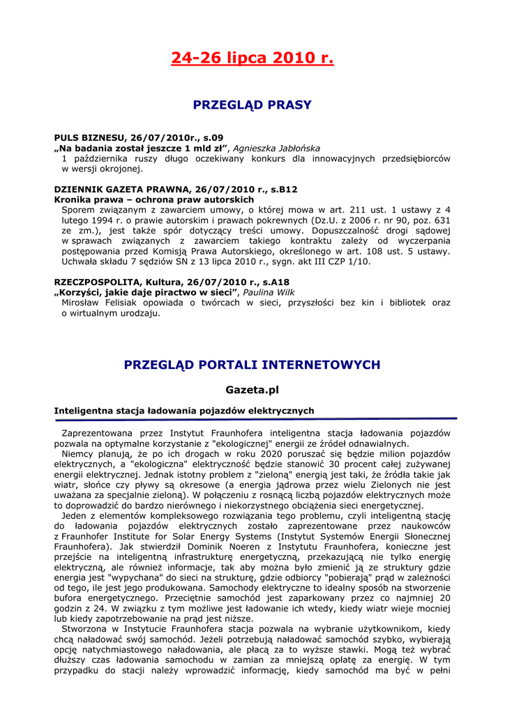 24-26 lipca 2010 r. PRZEGLĄD PRASY PULS BIZNESU, 26/07/2010r., s.09 „Na badania został jeszcze 1 mld zł”, Agnieszka Jabłońska 1 października ruszy długo oczekiwany konkurs dla innowacyjnych przedsiębiorców w wersji okrojonej. DZIENNIK GAZETA PRAWNA, 26/07/2010 r., s.B12 Kronika prawa – ochrona praw autorskich Sporem związanym z zawarciem umowy, o której mowa w art. 211 ust. 1 ustawy z 4 lutego 1994 r. o prawie autorskim i prawach pokrewnych (Dz.U. z 2006 r. nr 90, poz. 631 ze zm.), jest także spór dotyczący treści umowy. Dopuszczalność drogi sądowej w sprawach związanych z zawarciem takiego kontraktu zależy od wyczerpania postępowania przed Komisją Prawa Autorskiego, określonego w art. 108 ust. 5 ustawy. Uchwała składu 7 sędziów SN z 13 lipca 2010 r., sygn. akt III CZP 1/10. RZECZPOSPOLITA, Kultura, 26/07/2010 r., s.A18 „Korzyści, jakie daje piractwo w sieci”, Paulina Wilk Mirosław Felisiak opowiada o twórcach w sieci, przyszłości bez kin i bibliotek oraz o wirtualnym urodzaju. PRZEGLĄD PORTALI INTERNETOWYCH Gazeta.pl Inteligentna stacja ładowania pojazdów elektrycznych Zaprezentowana przez Instytut Fraunhofera inteligentna stacja ładowania pojazdów pozwala na optymalne korzystanie z "ekologicznej" energii ze źródeł odnawialnych. Niemcy planują, że po ich drogach w roku 2020 poruszać się będzie milion pojazdów elektrycznych, a "ekologiczna" elektryczność będzie stanowić 30 procent całej zużywanej energii elektrycznej. Jednak istotny problem z "zieloną" energią jest taki, że źródła takie jak wiatr, słońce czy pływy są okresowe (a energia jądrowa przez wielu Zielonych nie jest uważana za specjalnie zieloną). W połączeniu z rosnącą liczbą pojazdów elektrycznych może to doprowadzić do bardzo nierównego i niekorzystnego obciążenia sieci energetycznej. Jeden z elementów kompleksowego rozwiązania tego problemu, czyli inteligentną stację do ładowania pojazdów elektrycznych zostało zaprezentowane przez naukowców z Fraunhofer Institute for Solar Energy Systems (Instytut Systemów Energii Słonecznej Fraunhofera). Jak stwierdził Dominik Noeren z Instytutu Fraunhofera, konieczne jest przejście na inteligentną infrastrukturę energetyczną, przekazującą nie tylko energię elektryczną, ale również informacje, tak aby można było zmienić ją ze struktury gdzie energia jest "wypychana" do sieci na strukturę, gdzie odbiorcy "pobierają" prąd w zależności od tego, ile jest jego produkowana. Samochody elektryczne to idealny sposób na stworzenie bufora energetycznego. Przeciętnie samochód jest zaparkowany przez co najmniej 20 godzin z 24. W związku z tym możliwe jest ładowanie ich wtedy, kiedy wiatr wieje mocniej lub kiedy zapotrzebowanie na prąd jest niższe. Stworzona w Instytucie Fraunhofera stacja pozwala na wybranie użytkownikom, kiedy chcą naładować swój samochód. Jeżeli potrzebują naładować samochód szybko, wybierają opcję natychmiastowego naładowania, ale płacą za to wyższe stawki. Mogą też wybrać dłuższy czas ładowania samochodu w zamian za mniejszą opłatę za energię. W tym przypadku do stacji należy wprowadzić informację, kiedy samochód ma być w pełni naładowany. Stacja dobiera odpowiednią porę ładowania, tak aby zminimalizować koszt, ale jednocześnie zapewnić naładowanie samochodu do pory wyjazdu. Użytkownik na wyświetlaczu może śledzić postęp ładowania, poniesione koszty i ilość zużytej energii. Tego typu urządzenia wydają się niezbędnym elementem przyszłej struktury energetycznej przy powszechnym stosowaniu energii wiatru i słońca i powszechnym stosowaniu samochodów elektrycznych. Możliwe nawet, że właściciele samochodów będą mogli zarabiać pieniądze wykorzystując swoje pojazdy jako element wyrównawczy sieci jeżeli nie będzie kogoś w domu przez tydzień, może pozwolić sieci na pobieranie prądu z ogniw zaparkowanego samochodu kiedy stawki są wysokie i ładować go z powrotem kiedy są niskie. Jednak cała ta wizja ma jeden problematyczny element - wymaga wprowadzenia zmian w całej sieci energetycznej w kraju. Nie jestem więc specjalnie optymistyczny jeżeli chodzi o perspektywy czasowe wprowadzenia inteligentnych sieci przesyłowej w Polsce... Naprawianie uszkodzonych serc komórkami macierzystymi Naukowcom udało się uzyskać komórki macierzyste z kawałków żył, które pozostały po wykonaniu operacji pomostowania tętnicy wieńcowej (popularnie zwanych bypassami), i sprawdzić że stymulują one odrastanie nowych naczyń krwionośnych. Badania przeprowadzone na Uniwersytecie Bristolu przez zespół pod kierownictwem prof. Paolo Madeddu zostały opublikowane w czasopiśmie "Circulation" (Krążenie). Badacze wykorzystali resztki pobieranej z nogi pacjenta żyły, której większa część została wykorzystana do wykonania pomostu naczyniowego, do uzyskania komórek macierzystych, które następnie wstrzyknięto myszom. Okazało się, że u myszy komórki te stymulowały rozrost nowych naczyń krwionośnych w uszkodzonych mięśniach serca. Teraz zespół bada, czy komórki te mogą też pomóc sercu w wyleczeniu się po zawale. Cytując profesora Petera Webssberga, dyrektora medycznego British Heart Foundation (Brytyjskiej Fundacji Serca), która finansowała badania zespołu prof. Maddeddu: Naprawa uszkodzonego serca to święty Graal dla pacjentów z problemami kardiologicznymi. Odkrycie, że komórki pobrane z własnych naczyń krwionośnych pacjenta mogą stymulować odrastanie nowych naczyń krwionośnych w uszkodzonych tkankach jest bardzo obiecującym i ważnym osiągnięciem. Przybliża o krok możliwość 'terapii komórkowej' dla uszkodzonych serc, i co ważniejsze, jeżeli uda nam się zidentyfikować komunikaty chemiczne produkowane przez te komórki, możliwe jest że uda się wytworzyć leki mające taki sam efekt. Od czasu pierwszej operacji pomostowania na świecie, wykonanej w roku