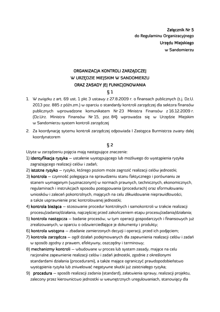 Załącznik Nr 5 do Regulaminu Organizacyjnego Urzędu Miejskiego w Sandomierzu ORGANIZACJA KONTROLI ZARZĄDCZEJ W URZĘDZIE MIEJSKIM W SANDOMIERZU ORAZ ZASADY JEJ FUNKCJONOWANIA §1 1. W związku z art. 69 ust. 1 pkt 3 ustawy z 27.8.2009 r. o finansach publicznych (t.j. Dz.U. 2013 poz. 885 z późn.zm.) w oparciu o standardy kontroli zarządczej dla sektora finansów publicznych wprowadzone komunikatem Nr 23 Ministra Finansów z 16.12.2009 r. (Dz.Urz. Ministra Finansów Nr 15, poz. 84)) wprowadza się w Urzędzie Miejskim w Sandomierzu system kontroli zarządczej 2. Za koordynację sytemu kontroli zarządczej odpowiada I Zastępca Burmistrza zwany dalej koordynatorem §2 Użyte w zarządzeniu pojęcia mają następujące znaczenie: 1) identyfikacja ryzyka – ustalenie występującego lub możliwego do wystąpienia ryzyka zagrażającego realizacji celów i zadań; 2) istotne ryzyko – ryzyko, którego poziom może zagrozić realizacji celów jednostki; 3) kontrola – czynność polegająca na sprawdzeniu stanu faktycznego i porównaniu ze stanem wymaganym (wyznaczonym) w normach prawnych, technicznych, ekonomicznych, regulaminach i instrukcjach sposobu postępowania (procedurach) oraz sformułowaniu wniosków i zaleceń pokontrolnych, mających na celu zlikwidowanie nieprawidłowości, a także usprawnienie prac kontrolowanej jednostki; 4) kontrola bieżąca – stosowanie procedur kontrolnych i samokontroli w trakcie realizacji procesu/zadania/działania, najczęściej przed zakończeniem etapu procesu/zadania/działania; 5) kontrola następcza – badanie procesów, w tym operacji gospodarczych i finansowych już zrealizowanych, w oparciu o odzwierciedlające je dokumenty i produkty; 6) kontrola wstępna – zbadanie zamierzonych decyzji i operacji, przed ich podjęciem; 7) kontrola zarządcza – ogół działań podejmowanych dla zapewnienia realizacji celów i zadań w sposób zgodny z prawem, efektywny, oszczędny i terminowy; 8) mechanizmy kontroli – wbudowane w proces lub system zasady, mające na celu racjonalne zapewnienie realizacji celów i zadań jednostki, zgodnie z określonymi standardami działania (procedurami), a także mające ograniczyć prawdopodobieństwo wystąpienia ryzyka lub zniwelować negatywne skutki już zaistniałego ryzyka; 9) procedura – sposób realizacji zadania (standard), załatwienia sprawy, realizacji projektu, zalecony przez kierownictwo jednostki w wewnętrznych uregulowaniach, stanowiący dla pracowników wymagany sposób postępowania; 10) ryzyko – prawdopodobieństwo wystąpienia zdarzeń, które mogą mieć wpływ na osiągnięcie zamierzonych celów lub powodują odchylenia od oczekiwanych rezultatów; 11) zarządzanie ryzykiem – projektowanie wewnętrznych uregulowań, zawierających mechanizmy kontroli ograniczające prawdopodobieństwo wystąpienia ryzyka lub jego skutki; 12) zasada rzetelności – wykonywanie obowiązków w sposób najbardziej prawidłowy i sumienny oraz terminowy przy posiadanych zasobach i istniejących uwarunkowaniach. §3 Jednostka i jej komórki organizacyjne działają tak, aby: 1) osiągać swoje cele w sposób oszczędny i efektywny; 2) realizować zadania zgodnie z przepisami prawa oraz procedurami wewnętrznymi; 3) chronić zasoby rzeczowe i informacyjne; 4) zapobiegać i ograniczać błędy i nieprawidłowości, w oparciu o proces zarządzania ryzykiem oraz sprawny system przepływu informacji; 5) terminowo i rzetelnie wykonywać zadania, w tym sporządzać sprawozdania. §4 1. Kontrola zarządcza realizowana jest w ramach wszystkich działań jednostki, w formie: 1) kontroli wstępnej; 2) kontroli bieżącej; 3) kontroli następczej. 2. Kontrola wstępna ma na celu zapewnienie, że wszelkie działania, w tym operacje gospodarcze i finansowe, dotyczą ustalonych celów i będą realizowane w wysokościach określonych w planie finansowym, a przedstawiona dokumentacja spełnia kryteria kompletności i rzetelności. Kontroli wstępnej podlegają m.in.: 1) projekty planów i przedsięwzięć; 2) wnioski o wszczęcie postępowań o zamówienia publiczne; 3) projekty umów; 4) inne dokumenty wykazujące powstanie zobowiązań lub należności; 5) dokumentacja kosztorysowa; 6) inne dokumenty mające wpływ na działalność jednostki. 3. Kontrola bieżąca ma na celu zapewnienie: 1) identyfikacji i eliminacji zjawisk, mogących negatywnie wpłynąć na realizację celów jednostki; 2) uzyskiwania najlepszych efektów z danych nakładów; 3) optymalnego doboru metod i środków, służących osiągnięciu założonych celów; 4) terminowej realizacji zadań; 5) realizacji wydatków tylko w wysokości i terminach wynikających z wcześniej zaciągniętych zobowiązań. 4. Kontrola następcza ma na celu zweryfikowanie procesu/działania/zadania po jego zakończeniu, w celu oceny działalności jednostki i eliminacji stwierdzonych nieprawidłowości w przyszłości lub podjęcia działań zmierzających do ograniczenia ich negatywnych skutków. §5 1. W ramach form kontroli zarządczej, wymienionych w § 3 pkt. 1, kontrola zarządcza występuje w postaci: 1) samokontroli, samokontroli polegającej na bieżącym kontrolowaniu przez każdego pracownika prawidłowości wykonywania własnej pracy oraz obowiązków wynikających z posiadanego zakresu czynności; 2) kontroli funkcjonalnej, funkcjonalnej polegającej na stosowaniu przez pracowników i kadrę zarządzającą zaprojektowanych mechanizmów kontroli, w ramach realizacji zadań, operacji; 3) kontroli instytucjonalnej, instytucjonalnej sprawowanej przez komórkę kontroli wewnętrznej, organ nadzorujący, NIK i inne instytucje kontrolne. §6 1. Za kontrolę zarządczą odpowiedzialni są: 1) kierownik jednostki; 2) skarbnik (główny księgowy); 3) kierownicy komórek organii zacyjnych, w zakresie swoich kompetencji i w odniesieniu do komórek, którymi zarządzają; 4) pracownicy zajmujący samodzielne stanowiska pracy w zakresie swoich kompetencji; 5)