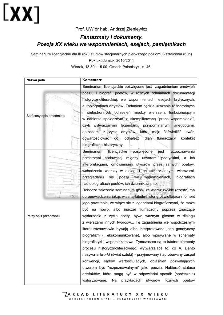 Prof. UW dr hab. Andrzej Zieniewicz Fantazmaty i dokumenty. Poezja XX wieku we wspomnieniach, esejach, pamiętnikach Seminarium licencjackie dla III roku studiów stacjonarnych pierwszego poziomu kształcenia (60h) Rok akademicki 2010/2011 Wtorek, 13.30 - 15.00, Gmach Polonistyki, s. 46. Nazwa pola Komentarz Seminarium licencjackie poświęcone jest zagadnieniom omówień poezji, i biografii poetów, w różnych odmianach dokumentacji historycznoliterackiej, we wspomnieniach, esejach krytycznych, autobiografiach artystów. Zadaniem będzie ukazanie różnorodnych Skrócony opis przedmiotu i wielostronnych odniesień między wierszem, funkcjonującym w odbiorze społecznym, a skomplikowaną "pracą wspomnienia", czyli wytwarzanymi epizodami z legendami, życia dowartościować artystów, go, przypominanymi które odnaleźć mają dlań anegdotami, "oświetlić" tłumaczący utwór, kontekst biograficzno-historyczny. Seminarium przestrzeni licencjackie badawczej poświęcone między jest utworami rozpoznawaniu poetyckimi, a ich interpretacjami, omówieniami utworów przez samych poetów, wchodzeniu wierszy w dialogi i polemiki z innymi wierszami, przeglądaniu się poezji we wspomnieniach, biografiach i autobiografiach poetów, ich dziennikach, itp. Robocze założenie seminarium głosi, że wiersz zwykle (często) ma do opowiedzenia jakąś własną fabułę-historię oświetlającą moment jego powstania, że wiąże się z legendami biograficznymi, że może być na nowo, albo inaczej tłumaczony poprzez znaczące Pełny opis przedmiotu wydarzenia z życia poety, bywa ważnym głosem w dialogu z wierszami innych twórców... Te zagadnienia we współczesnym literaturoznawstwie bywają albo interpretowane jako genetyczny biografizm (i ekskomunikowane), albo wpisywane w schematy biografistyki i wspominkarstwa. Tymczasem są to istotne elementy procesu historycznoliterackiego, wytwarzające to, co A. Danto nazywa artworld (świat sztuki) - przyjmowany i aprobowany zespół konwencji, sądów wartościujących, objaśnień pozwalających utworom być "rozpoznawalnymi" jako poezja. Nabierać statusu artefaktów, które mogą być w odpowiedni sposób (społecznie) waloryzowane. Na przykładach utworów licznych poetów współczesnych – T. Peipera, J. Iwaszkiewicza, J. Tuwima, K.I. Gałczyńskiego, Cz. Miłosza,, Zb. Herberta, T. Różewicza i innych – rozważać będziemy różnorodne relacje i związki między utworami a "materią życia" ich autorów. Wymagania Student powinien mieć zaliczone przedmioty historycznoliterackie formalne i poetykę opisową z II roku studiów. Zakładamy, że są to zajęcia dla osób interesujących się poezją – Wymagania wstępne Założenia wstępne z obszaru całego XX wieku, ale i najnowszą. Wymagane będą umiejętności, i pasje, interpretacyjne. Mile widziane są także zainteresowania biografistyką, memuarystyką i archiwaliami literackimi. Po ukończeniu seminarium licencjackiego student będzie w stanie wygłosić, i obronić własną prezentację przygotowaną na egzamin licencjacki. Efekty uczenia się Student zyska także znaczne umiejętności interpretacyjne, i doświadczenie w rozpoznawaniu szkół, stylów, programów literackich i głównych tradycji poetyckich XX wieku. Student posiądzie także szeroką orientację w metodologiach historyczno- i krytycznoliterackiego badania poezji ostatniego stulecia. Punkty ECTS 10 Praca studenta oceniana jest na podstawie jego obecności i aktywności na seminarium. Ma też wygłosić (oceniany) co najmniej jeden szkic interpretacyjny (referat), w formie samodzielnej wypowiedzi historycznoliterackiej, oraz przygotować wyczerpującą prezentację na egzamin licencjacki, i omówić tę Metody i kryteria oceniania prezentację podczas seminarium. Każda nieobecność powyżej dwóch w semestrze wymaga odbycia (ocenianej) konsultacji z przeczytanych lektur. Szczegóły: ocena ciągła (bieżące przygotowanie do zajęć i aktywność) – 30 %, kontrola obecności – 40 %, inne – 30 %. Sposób zaliczenia Sposób realizacji przedmiotu Język wykładowy Zaliczenie na ocenę Przedmiot jest realizowany w trybie krótkich wykładów, dyskusji i referatów (studiów interpretacyjnych) w sali dydaktycznej. Język polski. 1. Spotkanie wprowadzające w problematykę licencjackiego Zakres tematów Kłopoty z estetyką Awangardy Krakowskiej 2. T. Peiper niezrozumiany – brakujące ogniwo T. Peiper, Wybór z BN seminarium 3. Poezja na luźnych kartkach A. Lam, Instynkt i ład. Manifesty i protesty J. Stempowski, Chimera jako zwierze pociągowe [w:] Eseje dla Kassandry 4. W. Gombrowicz, Przeciw poetom Cz. Miłosz, Kłamstwo dzisiejszej poezji Cz. Miłosz, O milczeniu 5. Te okropne wiersze wojenne A. Ważyka i L. Szenwalda, czyli co się działo przed socrealizmem. A. Ważyk i L. Szenwald – wybory wierszy, A. Ważyk, Dziwna przygoda awangardy A. Wat, Mój wiek. Pamiętnik mówiony Przyjaźnie i animozje Skamandrytów 6. J. Iwaszkiewicz, Dionizje J. Kwiatkowski, Eleuter 7. J. Iwaszkiewicz, Książka moich wspomnień, Aleja przyjaciół 8. M. Shore, Kawior i popiół 9. J. Tuwim, Jarmark rymów P. Matywiecki, Twarz Tuwima 10. K.I. Gałczyński – wiersze z Prosto z mostu J. Tuwim, Utwory nieznane Druga Awangarda, i co dalej? 11. Kołysanki Czechowicza – Kołysanka Miłosza 11. Cz. Miłosz, Traktat poetycki – czyli autoryzowanie historii 12. J. Czechowicz, Proza J. Czechowicz, Wyobraźnia stwarzająca 13. Wierzyński i Lechoń na emigracji J. Lechoń, Dziennik K. Wierzyński, Kufer na plecach 14 – 15. Zajęcia powtórzeniowe i poświęcane organizacjom prezentacji licencjackich. 16. Wł. Broniewski – dzieje kilku wierszy M. Janion, W żołnierskich szmatach Wł. Broniewski, Pamiętnik 17. T. Borowski, Gdziekolwiek ziemia Cz. Miłosz, Zniewolony umysł, r. Beta, czyli nieszczęśliwy kochanek 18. Niedyskrecje wokół wierszy Borowskiego Niedyskrecje pocztowe. Korespondencja Tadeusza Borowskiego, z