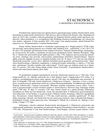 www.formanowicz.pl [start] © Mariusz Formanowicz, 2015-2016 STACHOWSCY Z GRODZISKA WIELKOPOLSKIEGO Przedstawione opracowanie jest opisem drzewa genealogicznego rodziny Stachowskich, które prezentuję na mojej stronie internetowej. Opis dotyczy najwcześniejszych dziejów rodu, obejmujących okres do 1815 roku. Z punktu widzenia genealogii ten fragment historii rodziny budzi najwięcej wątpliwości. Okres późniejszy, a w szczególności lata Wielkiego Księstwa Poznańskiego, nie wnoszą już tylu znaków zapytania. Z kolei przełom XIX i XX wieku i lata międzywojenne, opisał Edward Formanowicz we „Wspomnieniach o rodzinie Stachowskich”. Dzieje rodziny Stachowskich w Grodzisku rozpoczynają się w drugiej połowie XVIII wieku. Ich nazwisko najwcześniej pojawia się w księdze rady miejskiej (tzw. „radzieckiej”) z lat 1763-1770. W roku 1765 grodziski sąd burmistrzowski rozpatrywał pozew Andrzeja Stachowskiego, dochodzącego zwrotu kwoty 80 tynfów z odsetkami od mieszczan grodziskich Józefa i Barbary Poraskich1. Dług ten A. Stachowski potwierdził przed sądem pismem z roku 1758, będącym umową pożyczki udzielonej przez zmarłego ojca powoda, mieszczanina opalenickiego Stanisława Stachowskiego2. Sprawa spłaty pożyczki ciągnęła się przez co najmniej kolejne sześć lat. W marcu 1771 roku ten sam Andrzej Stachowski ponownie wzywa Jana i Barbarę Poraskich przed grodziski sąd burmistrzowski3. Stanisława Stachowskiego z Opalenicy znajdujemy w tamtejszej księdze radzieckiej, w zapisie z 1730 roku, jako „młodszego” ławnika (członka rady wójtowskiej)4. Z kolei jego syn Andrzej ożenił się w Opalenicy 18 czerwca 1764 roku. Panną młodą została Teresa Nawrocka5. O pochodzeniu Stachowskich z miasta nad rzeką Samicą napiszę nieco dalej. * * * W grodziskich księgach metrykalnych nazwisko Stachowski pojawia się w 1768 roku. Choć księgi parafii pw. św. Jadwigi zachowały się w dość dobrym stanie i sięgają końca XVI wieku, to w żadnym z przeglądniętych przeze mnie zapisów sprzed 1768 roku, nie napotkałem tego nazwiska. W dniu 14 listopada 1768 roku Antoni Stachowski z Doktorowa (Famatus – sławetny, a więc o stosunkowo wysokiej pozycji społecznej) ożenił się z panną Marianną Kuklinską. Świadkami tego ślubu byli Walenty Sobierowski i Andrzej Leszczyński. Marianna urodziła Antoniemu czworo dzieci. Troje z nich (a przypuszczalnie czwarte również) zmarło w niemowlęctwie. Pierwsza żona Antoniego zmarła około 1780 roku. W dniu 21 września 1782 roku Antoni ożenił się z panną Rozalią Tabernacką. Świadkiem na ślubie był Jan Stachowski. Tenże Jan mieszkał także w Doktorowie pod Grodziskiem. Niewykluczone, że był bratem, a na pewno kimś z bliskiej rodziny Antoniego. Obaj byli ogrodnikami (łac. Hortulanus). Antoni Stachowski w 1770 roku został nazwany „młodym ogrodowym”. W dniu ślubu Antoniego i Rozalii, Jan Stachowski był już mężczyzną żonatym. Jego wybranką była Regina z Kuklińskich (czyżby siostra pierwszej żony Antoniego?). Pobrali się w kościele św. Jadwigi w Grodzisku 3 lutego 1777 roku. Informację o dwóch rodzinach Stachowskich mieszkających w Doktorowie potwierdza spis rodzin parafii grodziskiej, sporządzony na polecenie Regencji Poznańskiej (władz Pruskich) 1 stycznia 1795 roku. Wymieniono w nim Jana Stachowskiego z żoną Reginą i dwoma synami (Janem i Anto1 Tynf (tymf) – potoczna nazwa polskich srebrnych złotówek, bitych w latach 1663-1666, początkowo w mennicach bydgoskiej i krakowskiej, później również lwowskiej. Deklarowany nominał tej monety wynosił 30 groszy. 2 Prothocollon proconsulare Grodziscen[sis 1763-1770], Zakład Narodowy im. Ossolińskich, Sygnatura 1523/II, s. 257. 3 Akta radzieckie m. Grodziska z lat 1771-1780, Zakład Narodowy im. Ossolińskich, Sygnatura 1525/II, s. 7v. 4 Arch. Państwowe w Poznaniu (APP), Akta miasta Opalenica, sygn. I 4, s. 103. 5 Arch. Archidiecezjalne w Poznaniu (AAP), Opalenica: LC 1763-1792, s. 180. 1 www.formanowicz.pl [start] © Mariusz Formanowicz, 2015-2016 nim) oraz na innej stronie Antoniego Stachowskiego z Rozalią6. Ci ostatni dochowali się trojga dzieci: Jana Bogusława, Marii Magdaleny i Marcina. Najstarszy zmarł w dzieciństwie, co do losów najmłodszego nie mam żadnych informacji. Maria Magdalena w 1808 roku wyszła za Jana Promińskiego. Małżonkowie mieszkali w Grodzisku. Urodziło im się dziewięcioro dzieci. Jan i Regina z Kuklińskich Stachowscy doczekali się urodzin dziewięciorga dzieci. Według moich badań czworo z nich (Jan, Wojciech, Zuzanna i Marianna) założyło rodziny i mieszkało później w Grodzisku. Szczególnie warte omówienia są dzieje Jana (Jana Ignacego), według moich analiz pierworodnego syna Jana i Reginy Stachowskich. Urodził się w Doktorowie. Nie znamy dokładnej daty jego urodzenia. Został ochrzczony w kościele pw. św. Jadwigi w Grodzisku w dniu 9 lipca 1777 roku. Ponieważ nowonarodzone dziecki przynoszono do kościoła najpóźniej kilka dni po urodzeniu (czasem nawet tego samego dnia), można przyjąć z dużą dokładnością, że 9 lipca 1777 roku był dniem urodzenia Jana Ignacego Stachowskiego. W tym miejscu należy podkreślić upodobanie Stachowskich do nadawania męskim potomkom imienia Jan i Antoni. Dotyczy to w szczególności dzieci Jana i Reginy z Kuklińskich. Czterej ich synowie mieli po dwa imiona, z których jako pierwsze w aktach chrztu zapisano Jan. W ten sposób mamy Jana Ignacego, Jana Antoniego, Jana Piotra i Jana Wojciecha. Według moich analiz tylko pierworodny w dorosłym życiu posługiwał się imieniem ojca. Kolejny zmarł jako Antoni (†1829). Jego zgon zgłosił brat Jan, a potwierdzała to ich matka Regina (zmarła trzy miesiące później). Najmłodszy z wymienionych używał imienia Wojciech. Co do losów Jana Piotra nie mam informacji. Najistotniejsze dane dotyczące życia Jana Stachowskiego juniora podano w „Dzienniku Poznańskim