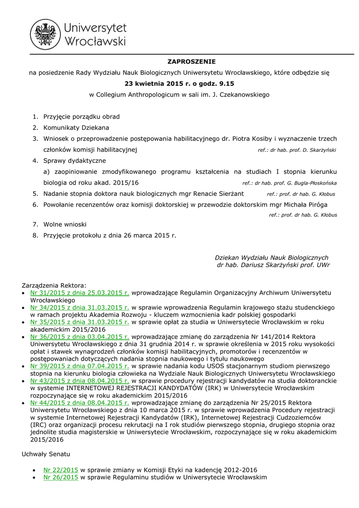 ZAPROSZENIE na posiedzenie Rady Wydziału Nauk Biologicznych Uniwersytetu Wrocławskiego, które odbędzie się 23 kwietnia 2015 r. o godz. 9.15 w Collegium Anthropologicum w sali im. J. Czekanowskiego 1. Przyjęcie porządku obrad 2. Komunikaty Dziekana 3. Wniosek o przeprowadzenie postępowania habilitacyjnego dr. Piotra Kosiby i wyznaczenie trzech członków komisji habilitacyjnej ref.: dr hab. prof. D. Skarżyński 4. Sprawy dydaktyczne a) zaopiniowanie zmodyfikowanego programu kształcenia na studiach I stopnia kierunku biologia od roku akad. 2015/16 ref.: dr hab. prof. G. Bugla-Płoskońska 5. Nadanie stopnia doktora nauk biologicznych mgr Renacie Sierżant ref.: prof. dr hab. G. Kłobus 6. Powołanie recenzentów oraz komisji doktorskiej w przewodzie doktorskim mgr Michała Piróga ref.: prof. dr hab. G. Kłobus 7. Wolne wnioski 8. Przyjęcie protokołu z dnia 26 marca 2015 r. Dziekan Wydziału Nauk Biologicznych dr hab. Dariusz Skarżyński prof. UWr Zarządzenia Rektora: Nr 31/2015 z dnia 25.03.2015 r. wprowadzające Regulamin Organizacyjny Archiwum Uniwersytetu Wrocławskiego Nr 34/2015 z dnia 31.03.2015 r. w sprawie wprowadzenia Regulamin krajowego stażu studenckiego w ramach projektu Akademia Rozwoju - kluczem wzmocnienia kadr polskiej gospodarki Nr 35/2015 z dnia 31.03.2015 r. w sprawie opłat za studia w Uniwersytecie Wrocławskim w roku akademickim 2015/2016 Nr 36/2015 z dnia 03.04.2015 r. wprowadzające zmianę do zarządzenia Nr 141/2014 Rektora Uniwersytetu Wrocławskiego z dnia 31 grudnia 2014 r. w sprawie określenia w 2015 roku wysokości opłat i stawek wynagrodzeń członków komisji habilitacyjnych, promotorów i recenzentów w postępowaniach dotyczących nadania stopnia naukowego i tytułu naukowego Nr 39/2015 z dnia 07.04.2015 r. w sprawie nadania kodu USOS stacjonarnym studiom pierwszego stopnia na kierunku biologia człowieka na Wydziale Nauk Biologicznych Uniwersytetu Wrocławskiego Nr 43/2015 z dnia 08.04.2015 r. w sprawie procedury rejestracji kandydatów na studia doktoranckie w systemie INTERNETOWEJ REJESTRACJI KANDYDATÓW (IRK) w Uniwersytecie Wrocławskim rozpoczynające się w roku akademickim 2015/2016 Nr 44/2015 z dnia 08.04.2015 r. wprowadzające zmianę do zarządzenia Nr 25/2015 Rektora Uniwersytetu Wrocławskiego z dnia 10 marca 2015 r. w sprawie wprowadzenia Procedury rejestracji w systemie Internetowej Rejestracji Kandydatów (IRK), Internetowej Rejestracji Cudzoziemców (IRC) oraz organizacji procesu rekrutacji na I rok studiów pierwszego stopnia, drugiego stopnia oraz jednolite studia magisterskie w Uniwersytecie Wrocławskim, rozpoczynające się w roku akademickim 2015/2016 Uchwały Senatu Nr 22/2015 w sprawie zmiany w Komisji Etyki na kadencję 2012-2016 Nr 26/2015 w sprawie Regulaminu studiów w Uniwersytecie Wrocławskim Nr 31/2015 w sprawie utworzenia kierunku biologia człowieka - studia pierwszego stopnia Nr 32/2015 w sprawie zasad rekrutacji na kierunek biologia człowieka - studia pierwszego stopnia rozpoczynające się w roku akademickim 2015/2016 Nr 41/2015 zmieniająca uchwałę w sprawie zasad i trybu rekrutacji na I rok studiów w Uniwersytecie Wrocławskim rozpoczynających się w roku akademickim 2015/2016 Nr 42/2015 zmieniająca uchwałę w sprawie szczegółowych zasad przyjmowania laureatów i finalistów olimpiad stopnia centralnego oraz laureatów konkursów ogólnopolskich na studia w Uniwersytecie Wrocławskim rozpoczynające się w roku akademickim 2015/2016, 2016/2017, 2017/2018, 2018/2019 Nr 43/2015 zmieniająca uchwałę w sprawie zasad rekrutacji na studia rozpoczynające się w roku akademickim 2015/2016 dla obywateli państw członkowskich Unii Europejskiej oraz cudzoziemców, którzy mają inny ustawowy tytuł do podjęcia i odbycia kształcenia na terytorium Rzeczypospolitej Polskiej, legitymujących się świadectwem dojrzałości lub dyplomem wydanym poza granicami Polski Nr 44/2015 w sprawie limitów przyjęć na I rok studiów w Uniwersytecie Wrocławskim w roku akademickim 2015/2016 Nr 45/2015 w sprawie zasad rekrutacji na studia doktoranckie w Uniwersytecie Wrocławskim rozpoczynające się w roku akademickim 2015/2016 Nr 46/2015 w sprawie Regulaminu potwierdzania efektów uczenia się w Uniwersytecie Wrocławskim Nr 47/2015 zmieniająca uchwałę w sprawie wzorów umów o warunkach odpłatności za świadczone usługi edukacyjne w Uniwersytecie Wrocławskim Komunikaty Rektora z dnia 09.04.2015 r. w sprawie użytkowania w Uniwersytecie Wrocławskim fluorowanych gazów cieplarnianych z dnia 15.04.2015 r. w sprawie powołania Zespołu ds. wdrożenia zaleceń pokontrolnych Narodowego Centrum Badań i Rozwoju