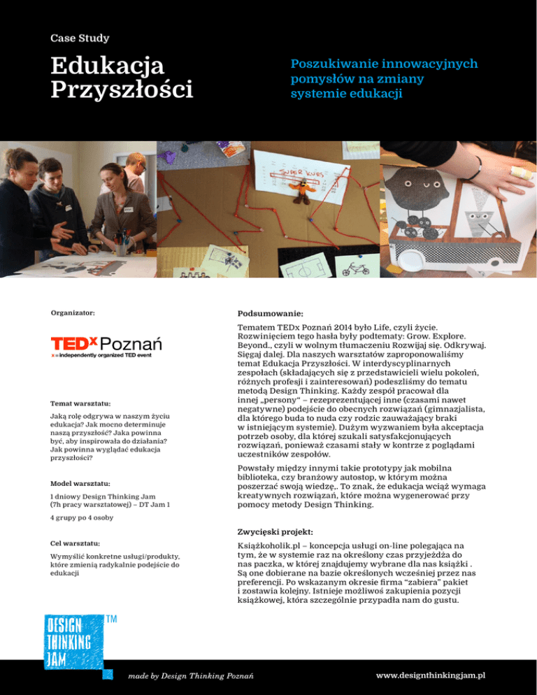 Case Study Edukacja Przyszłości Organizator: Temat warsztatu: Jaką rolę odgrywa w naszym życiu edukacja? Jak mocno determinuje naszą przyszłość? Jaka powinna być, aby inspirowała do działania? Jak powinna wyglądać edukacja przyszłości? Model warsztatu: 1 dniowy Design Thinking Jam (7h pracy warsztatowej) – DT Jam 1 Poszukiwanie innowacyjnych pomysłów na zmiany systemie edukacji Podsumowanie: Tematem TEDx Poznań 2014 było Life, czyli życie. Rozwinięciem tego hasła były podtematy: Grow. Explore. Beyond., czyli w wolnym tłumaczeniu Rozwijaj się. Odkrywaj. Sięgaj dalej. Dla naszych warsztatów zaproponowaliśmy temat Edukacja Przyszłości. W interdyscyplinarnych zespołach (składających się z przedstawicieli wielu pokoleń, różnych profesji i zainteresowań) podeszliśmy do tematu metodą Design Thinking. Każdy zespół pracował dla innej „persony“ – rezeprezentującej inne (czasami nawet negatywne) podejście do obecnych rozwiązań (gimnazjalista, dla którego buda to nuda czy rodzic zauważający braki w istniejącym systemie). Dużym wyzwaniem była akceptacja potrzeb osoby, dla której szukali satysfakcjonujących rozwiązań, ponieważ czasami stały w kontrze z poglądami uczestników zespołów. Powstały między innymi takie prototypy jak mobilna biblioteka, czy branżowy autostop, w którym można poszerzać swoją wiedzę,. To znak, że edukacja wciąż wymaga kreatywnych rozwiązań, które można wygenerować przy pomocy metody Design Thinking. 4 grupy po 4 osoby Zwycięski projekt: Cel warsztatu: Wymyślić konkretne usługi/produkty, które zmienią radykalnie podejście do edukacji Książkoholik.pl – koncepcja usługi on-line polegająca na tym, że w systemie raz na określony czas przyjeżdża do nas paczka, w której znajdujemy wybrane dla nas książki . Są one dobierane na bazie określonych wcześniej przez nas preferencji. Po wskazanym okresie firma “zabiera” pakiet i zostawia kolejny. Istnieje możliwoś zakupienia pozycji książkowej, która szczególnie przypadła nam do gustu. www.designthinkingjam.pl