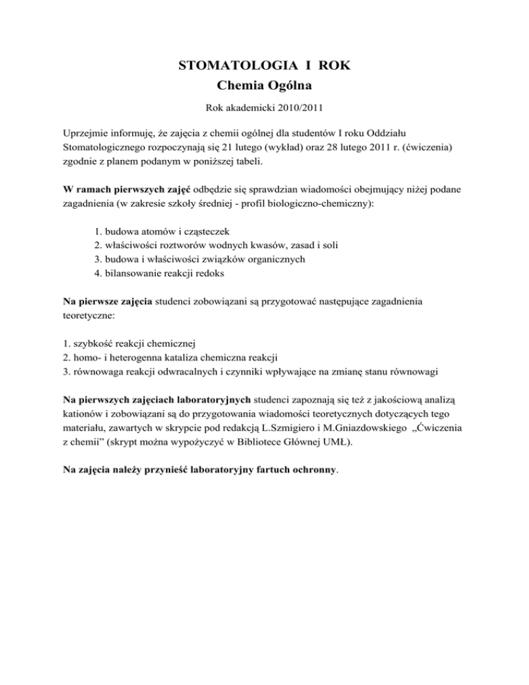 STOMATOLOGIA I ROK Chemia Ogólna Rok akademicki 2010/2011 Uprzejmie informuję, że zajęcia z chemii ogólnej dla studentów I roku Oddziału Stomatologicznego rozpoczynają się 21 lutego (wykład) oraz 28 lutego 2011 r. (ćwiczenia) zgodnie z planem podanym w poniższej tabeli. W ramach pierwszych zajęć odbędzie się sprawdzian wiadomości obejmujący niżej podane zagadnienia (w zakresie szkoły średniej - profil biologiczno-chemiczny): 1. budowa atomów i cząsteczek 2. właściwości roztworów wodnych kwasów, zasad i soli 3. budowa i właściwości związków organicznych 4. bilansowanie reakcji redoks Na pierwsze zajęcia studenci zobowiązani są przygotować następujące zagadnienia teoretyczne: 1. szybkość reakcji chemicznej 2. homo- i heterogenna kataliza chemiczna reakcji 3. równowaga reakcji odwracalnych i czynniki wpływające na zmianę stanu równowagi Na pierwszych zajęciach laboratoryjnych studenci zapoznają się też z jakościową analizą kationów i zobowiązani są do przygotowania wiadomości teoretycznych dotyczących tego materiału, zawartych w skrypcie pod redakcją L.Szmigiero i M.Gniazdowskiego „Ćwiczenia z chemii” (skrypt można wypożyczyć w Bibliotece Głównej UMŁ). Na zajęcia należy przynieść laboratoryjny fartuch ochronny. STOMATOLOGIA I ROK Chemia Ogólna Plan ćwiczeń Nr grupy Dzień i godzina Data pierwszych zajęć 5-9 Poniedziałki, 1400 – 1900 28 lutego 2011 1-4 Piątki, 800 – 1300 4 marca 2011 ZAJĘCIA DLA STUDENTÓW STOMATOLOGII ODBYWAJĄ SIĘ W SALACH ĆWICZENIOWYCH PRZY UL. KOPCIŃSKIEGO 20 Plan wykładów Wykłady będą się odbywać w poniedziałki w godzinach 800 – 930 w sali nr 353 przy ul. Pomorskiej 251 Daty wykładów: Luty Marzec Kwiecień 21 7 4 28 14 21 28 29 TESTOWY SPRAWDZIAN WIADOMOŚCI Odbędzie się na ostatnim zajęciu laboratoryjnym Zakres wymaganych wiadomości wymaganych na teście zostanie podany wraz ze szczegółowym programem zajęć na pierwszych ćwiczeniach.