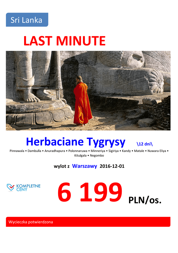 Sri Lanka LAST MINUTE Herbaciane Tygrysy \12 dni\ Pinnawala • Dambulla • Anuradhapura • Polonnaruwa • Minneriya • Sigiriya • Kandy • Matale • Nuwara Eliya • Kitulgala • Negombo wylot z Warszawy, 2016-12-01 6 199 PLN/os. Wycieczka potwierdzona CENA ZAWIERA: przelot, zakwaterowanie, wyżywienie zgodnie z programem, opłatę lotniskową, dopłatę transportową, opiekę pilota, ubezpieczenie KL i NW. CENA NIE ZAWIERA: dopłaty za wylot z wybranego portu, opłat na miejscu, biletów wstępu, lokalnych przewodników. Szczegóły na www.itaka.pl. Prezentowane oferty i informacje nie stanowią oferty w rozumieniu przepisów Kodeksu Cywilnego. Ich dostępnoŚć oraz warunki mogą ulec zmianie.