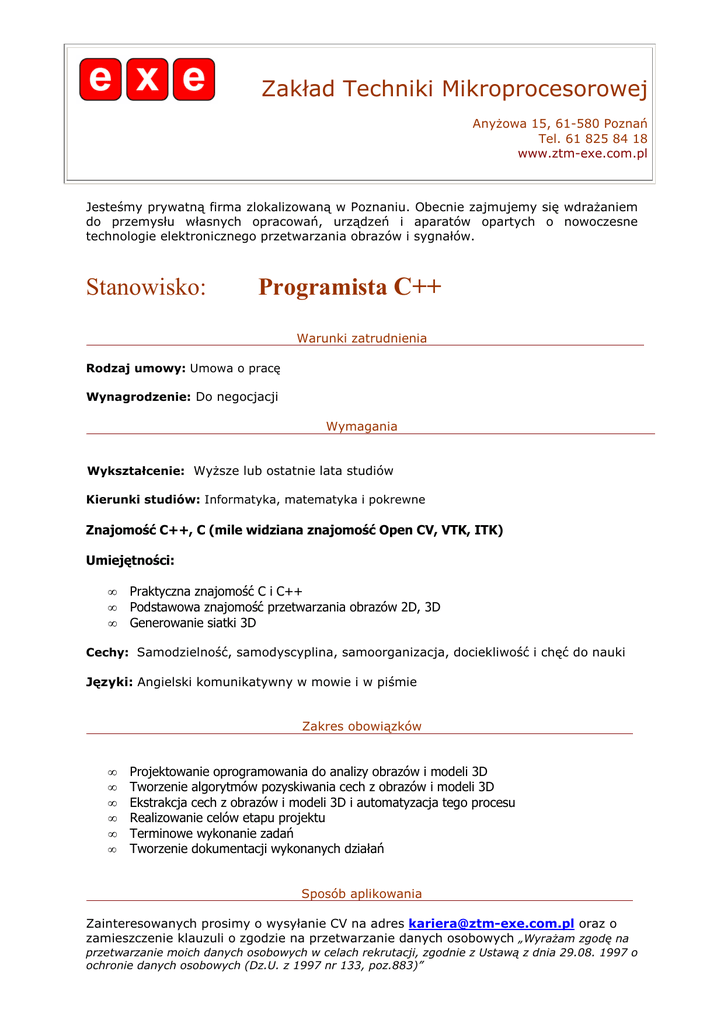 Zakład Techniki Mikroprocesorowej AnyŜowa 15, 61-580 Poznań Tel. 61 825 84 18 www.ztm-exe.com.pl Jesteśmy prywatną firma zlokalizowaną w Poznaniu. Obecnie zajmujemy się wdraŜaniem do przemysłu własnych opracowań, urządzeń i aparatów opartych o nowoczesne technologie elektronicznego przetwarzania obrazów i sygnałów. Stanowisko: Programista C++ Warunki zatrudnienia Rodzaj umowy: Umowa o pracę Wynagrodzenie: Do negocjacji Wymagania Wykształcenie: WyŜsze lub ostatnie lata studiów Kierunki studiów: Informatyka, matematyka i pokrewne Znajomość C++, C (mile widziana znajomość Open CV, VTK, ITK) Umiejętności: • • • Praktyczna znajomość C i C++ Podstawowa znajomość przetwarzania obrazów 2D, 3D Generowanie siatki 3D Cechy: Samodzielność, samodyscyplina, samoorganizacja, dociekliwość i chęć do nauki Języki: Angielski komunikatywny w mowie i w piśmie Zakres obowiązków • • • • • • Projektowanie oprogramowania do analizy obrazów i modeli 3D Tworzenie algorytmów pozyskiwania cech z obrazów i modeli 3D Ekstrakcja cech z obrazów i modeli 3D i automatyzacja tego procesu Realizowanie celów etapu projektu Terminowe wykonanie zadań Tworzenie dokumentacji wykonanych działań Sposób aplikowania Zainteresowanych prosimy o wysyłanie CV na adres [email protected] oraz o zamieszczenie klauzuli o zgodzie na przetwarzanie danych osobowych „WyraŜam zgodę na przetwarzanie moich danych osobowych w celach rekrutacji, zgodnie z Ustawą z dnia 29.08. 1997 o ochronie danych osobowych (Dz.U. z 1997 nr 133, poz.883)”