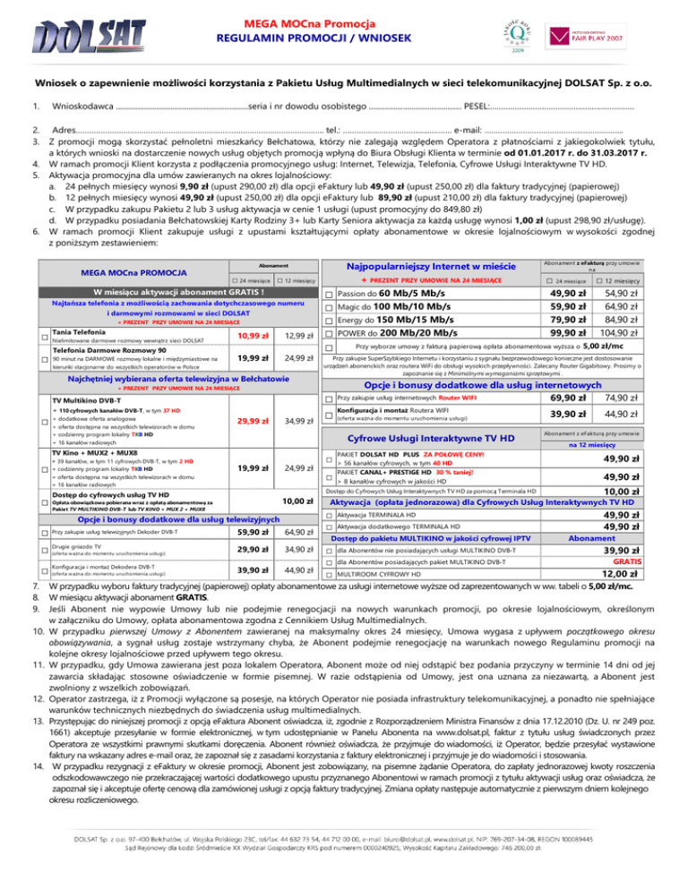 MEGA MOCna Promocja REGULAMIN PROMOCJI / WNIOSEK Wniosek o zapewnienie możliwości korzystania z Pakietu Usług Multimedialnych w sieci telekomunikacyjnej DOLSAT Sp. z o.o. 1. Wnioskodawca ..................................................................seria i nr dowodu osobistego .............................................. PESEL:………………………………………………………. 2. 3. Adres……………………………………………………………………………………………….. tel.: ……………………………......………. e-mail: ……………………………………..……………... Z promocji mogą skorzystać pełnoletni mieszkańcy Bełchatowa, którzy nie zalegają względem Operatora z płatnościami z jakiegokolwiek tytułu, a których wnioski na dostarczenie nowych usług objętych promocją wpłyną do Biura Obsługi Klienta w terminie od 01.01.2017 r. do 31.03.2017 r. W ramach promocji Klient korzysta z podłączenia promocyjnego usług: Internet, Telewizja, Telefonia, Cyfrowe Usługi Interaktywne TV HD. Aktywacja promocyjna dla umów zawieranych na okres lojalnościowy: a. 24 pełnych miesięcy wynosi 9,90 zł (upust 290,00 zł) dla opcji eFaktury lub 49,90 zł (upust 250,00 zł) dla faktury tradycyjnej (papierowej) b. 12 pełnych miesięcy wynosi 49,90 zł (upust 250,00 zł) dla opcji eFaktury lub 89,90 zł (upust 210,00 zł) dla faktury tradycyjnej (papierowej) c. W przypadku zakupu Pakietu 2 lub 3 usług aktywacja w cenie 1 usługi (upust promocyjny do 849,80 zł) d. W przypadku posiadania Bełchatowskiej Karty Rodziny 3+ lub Karty Seniora aktywacja za każdą usługę wynosi 1,00 zł (upust 298,90 zł/usługę). W ramach promocji Klient zakupuje usługi z upustami kształtującymi opłaty abonamentowe w okresie lojalnościowym w wysokości zgodnej z poniższym zestawieniem: 4. 5. 6. MEGA MOCna PROMOCJA Abonament □ 24 miesiące □ 12 miesięcy W miesiącu aktywacji abonament GRATIS ! Najtańsza telefonia z możliwością zachowania dotychczasowego numeru i darmowymi rozmowami w sieci DOLSAT + PREZENT PRZY UMOWIE NA 24 MIESIĄCE □ □ Tania Telefonia Nielimitowane darmowe rozmowy wewnątrz sieci DOLSAT Telefonia Darmowe Rozmowy 90 90 minut na DARMOWE rozmowy lokalne i międzymiastowe na kierunki stacjonarne do wszystkich operatorów w Polsce 10,99 zł 12,99 zł 19,99 zł 24,99 zł Najchętniej wybierana oferta telewizyjna w Bełchatowie + PREZENT PRZY UMOWIE NA 24 MIESIĄCE □ dodatkowa oferta analogowa oferta dostępna na wszystkich telewizorach w domu codzienny program lokalny TKB HD 16 kanałów radiowych 29,99 zł 34,99 zł + 39 kanałów, w tym 11 cyfrowych DVB-T, w tym 2 HD 19,99 zł 24,99 zł + oferta dostępna na wszystkich telewizorach w domu + 16 kanałów radiowych □ 10,00 zł Opłata obowiązkowa pobierana wraz z opłatą abonamentową za Pakiet TV MULTIKINO DVB-T lub TV KINO + MUX 2 + MUX8 Opcje i bonusy dodatkowe dla usług telewizyjnych □ Przy zakupie usług telewizyjnych Dekoder DVB-T 59,90 zł 64,90 zł □ (oferta ważna do momentu uruchomienia usługi) 29,90 zł 34,90 zł i montaż Dekodera DVB-T □ Konfiguracja (oferta ważna do momentu uruchomienia usługi) 7. 8. 9. 10. 11. 12. 13. 14. Energy do 150 Mb/15 Mb/s POWER do 200 Mb/20 Mb/s □ 24 miesiące 49,90 zł 59,90 zł 79,90 zł 99,90 zł Przy wyborze umowy z fakturą papierową opłata abonamentowa wyższa o □ 12 miesięcy 54,90 zł 64,90 zł 84,90 zł 104,90 zł 5,00 zł/mc Przy zakupie SuperSzybkiego Internetu i korzystaniu z sygnału bezprzewodowego konieczne jest dostosowanie urządzeń abonenckich oraz routera WiFi do obsługi wysokich przepływności. Zalecany Router Gigabitowy. Prosimy o zapoznanie się z Minimalnymi wymaganiami sprzętowymi . Opcje i bonusy dodatkowe dla usług internetowych 69,90 zł 74,90 zł □ i montaż Routera WIFI □ Konfiguracja (oferta ważna do momentu uruchomienia usługi) □ □ PAKIET DOLSAT HD PLUS ZA POŁOWĘ CENY! > 56 kanałów cyfrowych, w tym 40 HD PAKIET CANAL+ PRESTIGE HD 30 % taniej! > 8 kanałów cyfrowych w jakości HD Dostęp do Cyfrowych Usług Interaktywnych TV HD za pomocą Terminala HD Dostęp do cyfrowych usług TV HD Drugie gniazdo TV Magic do 100 Mb/10 Mb/s Cyfrowe Usługi Interaktywne TV HD TV Kino + MUX2 + MUX8 □ + codzienny program lokalny TKB HD Passion do 60 Mb/5 Mb/s Abonament z eFakturą przy umowie na Przy zakupie usług internetowych Router WIFI TV Multikino DVB-T + 110 cyfrowych kanałów DVB-T, w tym 37 HD + + + + □ □ □ □ □ Najpopularniejszy Internet w mieście + PREZENT PRZY UMOWIE NA 24 MIESIĄCE 39,90 zł 44,90 zł 39,90 zł 44,90 zł Abonament z eFakturą przy umowie na 12 miesięcy 49,90 zł 49,90 zł 10,00 zł Aktywacja (opłata jednorazowa) dla Cyfrowych Usług Interaktywnych TV HD □ □ Aktywacja TERMINALA HD Aktywacja dodatkowego TERMINALA HD Dostęp do pakietu MULTIKINO w jakości cyfrowej IPTV □ □ □ dla Abonentów nie posiadających usługi MULTIKINO DVB-T dla Abonentów posiadających pakiet MULTIKINO DVB-T MULTIROOM CYFROWY HD 49,90 zł 49,90 zł Abonament 39,90 zł GRATIS 12,00 zł W przypadku wyboru faktury tradycyjnej (papierowej) opłaty abonamentowe za usługi internetowe wyższe od zaprezentowanych w ww. tabeli o 5,00 zł/mc. W miesiącu aktywacji abonament GRATIS. Jeśli Abonent nie wypowie Umowy lub nie podejmie renegocjacji na nowych warunkach promocji, po okresie lojalnościowym, określonym w załączniku do Umowy, opłata abonamentowa zgodna z Cennikiem Usług Multimedialnych. W przypadku pierwszej Umowy z Abonentem zawieranej na maksymalny okres 24 miesięcy, Umowa wygasa z upływem początkowego okresu obowiązywania, a sygnał usług zostaje wstrzymany chyba, że Abonent podejmie renegocjację na warunkach nowego Regulaminu promocji na kolejne okresy lojalnościowe przed upływem tego okresu. W przypadku, gdy Umowa zawierana jest poza lokalem Operatora, Abonent może od niej odstąpić bez podania przyczyny w term