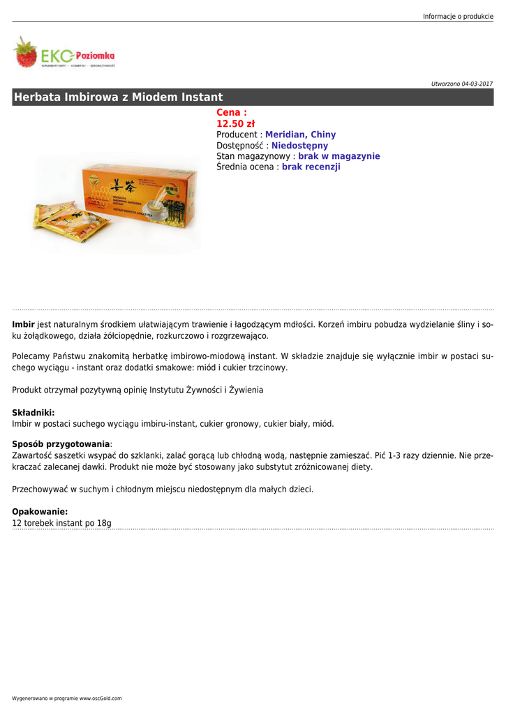 Informacje o produkcie Utworzono 04-03-2017 Herbata Imbirowa z Miodem Instant Cena : 12.50 zł Producent : Meridian, Chiny Dostępność : Niedostępny Stan magazynowy : brak w magazynie Średnia ocena : brak recenzji Imbir jest naturalnym środkiem ułatwiającym trawienie i łagodzącym mdłości. Korzeń imbiru pobudza wydzielanie śliny i soku żołądkowego, działa żółciopędnie, rozkurczowo i rozgrzewająco. Polecamy Państwu znakomitą herbatkę imbirowo-miodową instant. W składzie znajduje się wyłącznie imbir w postaci suchego wyciągu - instant oraz dodatki smakowe: miód i cukier trzcinowy. Produkt otrzymał pozytywną opinię Instytutu Żywności i Żywienia Składniki: Imbir w postaci suchego wyciągu imbiru-instant, cukier gronowy, cukier biały, miód. Sposób przygotowania: Zawartość saszetki wsypać do szklanki, zalać gorącą lub chłodną wodą, następnie zamieszać. Pić 1-3 razy dziennie. Nie przekraczać zalecanej dawki. Produkt nie może być stosowany jako substytut zróżnicowanej diety. Przechowywać w suchym i chłodnym miejscu niedostępnym dla małych dzieci. Opakowanie: 12 torebek instant po 18g Wygenerowano w programie www.oscGold.com