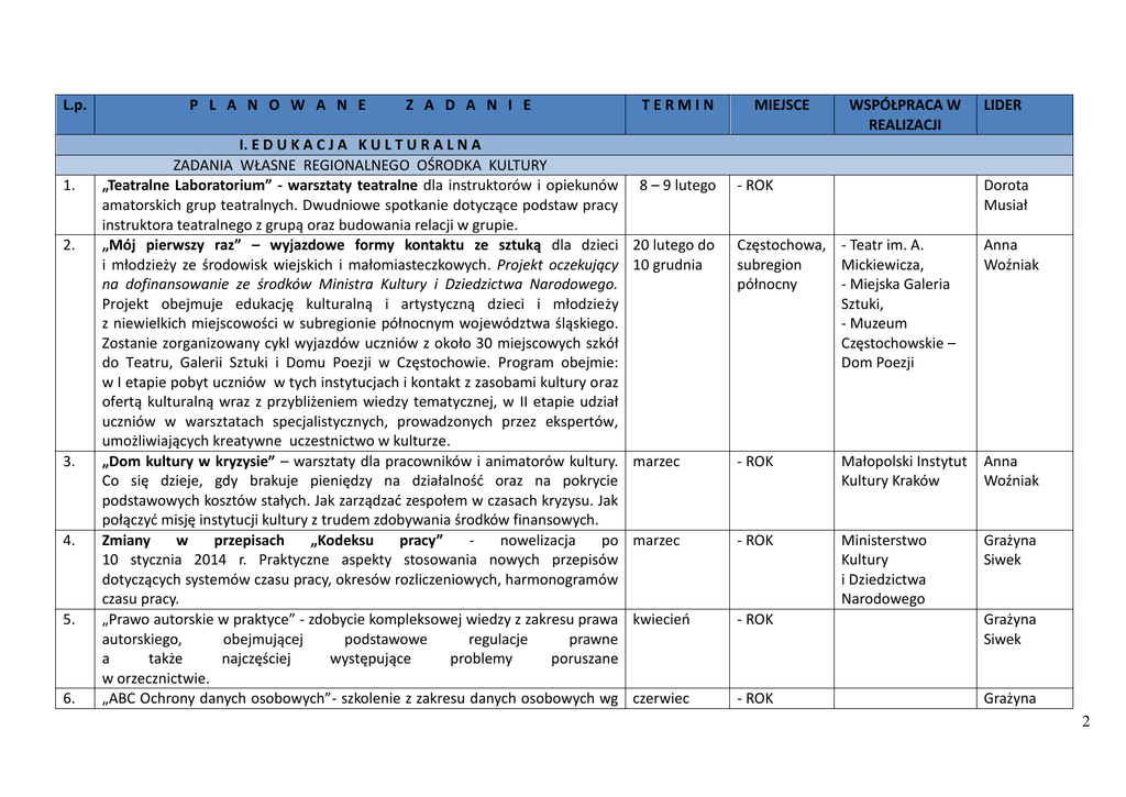 L.p. 1. 2. 3. 4. 5. 6. P L A N O W A N E Z A D A N I E I. E D U K A C J A K U L T U R A L N A ZADANIA WŁASNE REGIONALNEGO OŚRODKA KULTURY „Teatralne Laboratorium” - warsztaty teatralne dla instruktorów i opiekunów amatorskich grup teatralnych. Dwudniowe spotkanie dotyczące podstaw pracy instruktora teatralnego z grupą oraz budowania relacji w grupie. „Mój pierwszy raz” – wyjazdowe formy kontaktu ze sztuką dla dzieci i młodzieży ze środowisk wiejskich i małomiasteczkowych. Projekt oczekujący na dofinansowanie ze środków Ministra Kultury i Dziedzictwa Narodowego. Projekt obejmuje edukację kulturalną i artystyczną dzieci i młodzieży z niewielkich miejscowości w subregionie północnym województwa śląskiego. Zostanie zorganizowany cykl wyjazdów uczniów z około 30 miejscowych szkół do Teatru, Galerii Sztuki i Domu Poezji w Częstochowie. Program obejmie: w I etapie pobyt uczniów w tych instytucjach i kontakt z zasobami kultury oraz ofertą kulturalną wraz z przybliżeniem wiedzy tematycznej, w II etapie udział uczniów w warsztatach specjalistycznych, prowadzonych przez ekspertów, umożliwiających kreatywne uczestnictwo w kulturze. „Dom kultury w kryzysie” – warsztaty dla pracowników i animatorów kultury. Co się dzieje, gdy brakuje pieniędzy na działalność oraz na pokrycie podstawowych kosztów stałych. Jak zarządzać zespołem w czasach kryzysu. Jak połączyć misję instytucji kultury z trudem zdobywania środków finansowych. Zmiany w przepisach „Kodeksu pracy” nowelizacja po 10 stycznia 2014 r. Praktyczne aspekty stosowania nowych przepisów dotyczących systemów czasu pracy, okresów rozliczeniowych, harmonogramów czasu pracy. „Prawo autorskie w praktyce” - zdobycie kompleksowej wiedzy z zakresu prawa autorskiego, obejmującej podstawowe regulacje prawne a także najczęściej występujące problemy poruszane w orzecznictwie. „ABC Ochrony danych osobowych”- szkolenie z zakresu danych osobowych wg TERMIN 8 – 9 lutego MIEJSCE WSPÓŁPRACA W REALIZACJI LIDER - ROK Dorota Musiał 20 lutego do 10 grudnia Częstochowa, - Teatr im. A. subregion Mickiewicza, północny - Miejska Galeria Sztuki, - Muzeum Częstochowskie – Dom Poezji Anna Woźniak marzec - ROK Małopolski Instytut Kultury Kraków Anna Woźniak marzec - ROK Ministerstwo Kultury i Dziedzictwa Narodowego Grażyna Siwek kwiecień - ROK Grażyna Siwek czerwiec - ROK Grażyna 2 7. 8. 9. 10. 11. 12. 13. 14. ustawy o ochronie danych osobowych. Szkolenie adresowane jest do osób zatrudnionych na stanowiskach związanych z przetwarzaniem danych osobowych i osób przygotowujących się do zajmowania funkcji administratora bezpieczeństwa informacji w instytucji. Warsztaty plenerowe „ALBANIA 2014”. Kontynuacja cyklu promującego 4 do 13 lipca fotografie podróżniczą oraz doskonalenie warsztatu artystycznego uczestników. Warsztaty „Za i przed obiektywem” – cykl spotkań i wykładów dla cały rok mieszkańców miejscowości w powiecie częstochowskim. Cele: zainteresowanie sztuką przekazu fotograficznego, rozbudzanie wrażliwości, doskonalenie umiejętności interpretacji obrazu fotograficznego, zapoznanie uczestników ze współczesnym sprzętem foto-filmowym. Plener fotograficzny w Wilnie oraz wystawa prac fotografików z powiatu wrzesień częstochowskiego w Wilnie na Litwie. Warsztaty dla dyrygentów i kapelmistrzów orkiestr dętych. Powstawanie do ustalenia nowych orkiestr na terenie subregionu potwierdza zapotrzebowanie na tego rodzaju zajęcia. Cykl warsztatów „Jarmark akustyczny” – pokazy i wykłady, porady praktyczne. do ustalenia Warsztaty „Siała baba mak” adresowane do instruktorów, opiekunów i osób 8 – 9 marca zainteresowanych folklorem dziecięcym. Projekt oczekujący na dofinansowanie ze środków Ministra Kultury i Dziedzictwa Narodowego. Cele: pobudzanie zainteresowania folklorem własnego regionu poprzez zabawy i tańce dziecięce, wzbogacanie wiedzy uczestników o regionie. Warsztat pracy pokazany będzie na dziecięcej grupie Zespołu Pieśni i Tańca „Koziegłowy”. Warsztaty „Jej okrągłość pisanka”. Projekt oczekujący na dofinansowanie ze 4 kwietnia środków Ministra Kultury i Dziedzictwa Narodowego. Miejsce realizacji związane jest z silnymi ciągle tradycjami robienia pisanek. Warsztaty poprowadzi twórczyni ludowa, która nauczy uczestników tradycyjnej metody wydrapywania wzorów. Planuje się zorganizowanie wystawy prac po zakończeniu warsztatów. Warsztaty „Od łyka do kogucika”. Projekt oczekujący na dofinansowanie ze 13 września środków Ministra Kultury i Dziedzictwa Narodowego. Siwek Albania Sławomir Jodłowski Sławomir Jodłowski gminy powiatu częstochowskiego Wilno na Litwie ROK MDK Myszków MiejskoGminny Ośrodek Promocji Kultury Koziegłowy Gminny Ośrodek Kultury Przyrów MiejskoGminny Centrum Kultury w Wilnie Sklep muzyczny GAMA w Częstochowie MDK Myszków Miejsko-Gminny Ośrodek Promocji Kultury Koziegłowy Sławomir Jodłowski Ireneusz Barton Ireneusz Barton Lidia Koj Gminny Ośrodek Kultury Przyrów Lidia Koj Miejsko-Gminny Ośrodek Promocji Lidia Koj 3 15. 1. 2. 3. 4. Do tradycji Koziegłów należy wytwarzanie wyrobów z drewna osikowego – łyka: kapeluszy, kwiatów, koszyków, elementów dekoracyjnych. Warsztaty poprowadzi twórczyni ludowa, która zapozna uczestników z tradycyjnymi technikami i wzorami wyrobów wiórowych. Warsztaty „Wiklina się wygina”. Projekt oczekujący na dofinansowanie ze środków Ministra Kultury i Dziedzictwa Narodowego. Wiklina jako uniwersalny surowiec do rzemiosł domowych. Zespół Folklorystyczny „Wrzos” opracował scenariusz i wykonuje na scenie widowisko związane z plecionkarstwem, które zapoznaje uczestników z techniką wyplatania z wikliny. Zajęcia poprowadzi miejscowy rękodzielnik. WSPÓŁORGANIZACJA W REALIZACJI ZADAŃ INNYCH PODMIOTÓW Generator-warsztaty młodych animatorów kultury. Projekt oczekujący na dofi