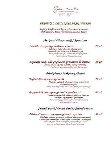FESTIVAL DEGLI ASPARAGI VERDI Szef kuchni Giancarlo Russo poleca dania sezonowe Chef Giancarlo Russo recommends seasonal dishes: Antipasti / Przystawki / Appetizers Insalata di asparagi verdi con arance 26 zł Sałatka ze świeżych zielonych szparagów i pomarańczy z miętą w occie balsamicznym Fresh green asparagus salad with orange segments, fresh mint and balsamic dressing Asparagi verdi alla griglia con prosciutto di Parma 29 zł Świeże zielone szparagi z grilla z szynką parmeńską Fresh green asparagus grilled with Parma ham Primi piatti / Makarony /Pastas Tagliatelle con asparagi verdi 29 zł Makaron tagliatelle domowej roboty ze świeżymi zielonymi szparagami Home-made tagliatelle served with fresh green asparagus Pappardelle con asparagi verdi e gamberetti 46 zł Makaron pappardelle domowej roboty ze świeżymi zielonymi szparagami i krewetkami Home-made pappardelle served with fresh green asparagus and prawns Secondi piatti / Drugie dania / Second courses Filetto di manzo con asparagi verdi e patate Polędwica wołowa w sosie ze świeżymi zielonymi szparagami z dodatkiem ziemniaków zasmażanych z czosnkiem i rozmarynem Fillet Mignon served with fresh green asparagus sauce and roasted potatoes with garlic and rosemary 69 zł Antipasti freddi / Przystawki zimne / Appetizers Grigliata mista di verdure 19 zł Grillowany zestaw warzyw z czosnkiem i oliwą z oliwek Grilled vegetables with garlic and olive oil Caprese con rucola 22 zł Mozzarella z pomidorami, rukolą, oliwą z oliwek i świeżą bazylią Mozzarella with ruccola , tomatoes and fresh basil - olive oil dressing Carpaccio di pesce spada 31 zł Carpaccio z miecznika z vinegret cytrynowym Swordfish carpaccio with lemon vinaigrette Carpaccio di polipo 29 zł Carpaccio z ośmiornicy z oliwą z oliwek i cytryną Octopus Carpaccio with olive oil and lemon Carpaccio di manzo 26 zł Carpaccio z polędwicy wołowej z rukolą i parmezanem Beef carpaccio with ruccola and parmesan Prosciutto e melone 27 zł Szynka parmeńska z melonem Parma ham with melon Vitello Tonnato Plastry pieczonej cielęciny w sosie z tuńczyka, anchois i kaparów Thinly sliced baked veal served with tuna sauce, anchovies and capers 28 zł Antipasti caldi / Przystawki ciepłe / Warm starters Focaccia 9 zł Podpłomyk White pizza Bruschetta 15 zł Grzanki chlebowe z pomidorami i mozzarellą Slices of bread with mozzarella cheese and tomatoes Calamari alla griglia 31 zł Grillowane kalmary na poduszce z sałat Grilled squids with fresh mix of lettuce Cozze alla Tarantina 28 zł Małże w sosie pomidorowym z peperoncino Mussels with pepperoncino and tomatoes sause Soute di vongole veraci 36 zł Małże „Paluarde” w sosie winnym „Paluarde” mussel with wine sauce Gamberoni alla griglia 45 zł Krewetki królewskie z grilla z bukietem sałat i pomidorami Grilled king prawns with fresh mix of lettuce and tomatoes Insalate / Sałatki / Salads Insalata di Giancarlo 23 zł Mieszanka sałat zielonych z carpaccio z wędzonej piersi kaczej z dressingiem malinowo-imbirowym Smoked duck carpaccio served with fresh mix of lettuce and raspberry-ginger dressing Insalata di arance, rucola e parmigiano Sałatka z pomarańczy, rukoli i parmezanu Oranges salad with ruccola and parmesan 21 zł Insalata mista 18 zł Mieszanka sałat z pomidorami, oliwą z oliwek i octem balsamicznym Mix leaves of lettuce with tomatos and balsamic-olive dressing Insalata di polipo, patate e sedano 45 zł Sałatka z ośmiornicy, ziemniaków i selera naciowego z oliwą z oliwek Octopus salad with potatoes, fennel and olive oil Zuppe / Zupy / Soups Stracciatella 14 zł Rosół z delikatnymi kluskami z jajka i parmezanu Broth soup with delicate parmesan and eggs noodles Crema del giorno 10 zł Zupa krem dnia Creamy soup of the Day Minestrone 14 zł Włoska zupa warzywna Italian vegetables soup Pasta fresca dello chef / Domowe makarony receptury szefa kuchni / Home-made pastas of Chef's recipes Giancarlotti - gnocchi alle ortiche con burro e salvia Zielone włoskie kopytka zagniatane z pokrzywą z masłem i szałwią Home-made nettle gnocchi with sage-butter sauce 25 zł Tagliatelle verdi al gorgonzola 28 zł Tagliatelle zagniatane ze szpinakiem z sosem na bazie sera gorgonzola Spinach tagliatelle with gorgonzola sauce Pappardelle con gamberetti e zucchine 33 zł Pappardelle z krewetkami i cukinią Pappardelle with prowns and zucchini Ravioli con ricotta e spinaci 25 zł Ravioli z serem ricotta i szpinakiem w sosie pomidorowym z bazylią Spinach and ricotta ravioli with basil-tomatoes sauce Ravioli con ricotta e asparagi 28 zł Ravioli z serem ricotta i szparagami w kremowym sosie szparagowym Asparagus and ricotta ravioli with creamy asparagus sauce Ravioli con ricotta e salmone 32 zł Ravioli z serem risotta i łososiem w sosie śmietanowo-pomidorowym Salmon ravioli with creamy tomatoes sauce Pasta secca / Makarony / Pastas Spaghetti aglio, olio e peperoncino 20 zł Spaghetti z oliwą, czosnkiem i ostrą papryką Spaghetti with olive oil, garlic and spicy paprika Spaghetti alle cozze 27 zł Spaghetti z małżami w sosie z białego wina i pomidorów cherry Spaghetti with mussels in wine and cherry tomatoes sauce Spaghetti alle vongole veraci 34 zł Spaghetti z małżami”Paluarde” w winnym sosie Spaghetti with clams „Paluarde” in home-made wine sauce Secondi piatti di pesce/ Ryby / Fish Orata all’acqua pazza 35 zł Dorada w delikatnym sosie pomidorowym Baked dorade with delicious tomatoes sauce Spigola alla griglia 45 zł Okoń morski z grilla z bukietem sałat Grilled sea bass with bouquet of lettuces Secondi piatti di carne/ Mięsa / Main courses Filetto di manzo con funghi porcini e patate 62 zł Polędwica wołowa w sosie podgrzybkowym z ziemniakami zasmażanymi z rozmarynem Beef fillet with forest mushrooms sauce and fried potatoes Filetto di manzo al pepe verde con patate 61 zł Polędwica wołowa w sosie na bazie zielonego pieprzu z ziemniakami zasmażanymi z rozmarynem Bee
