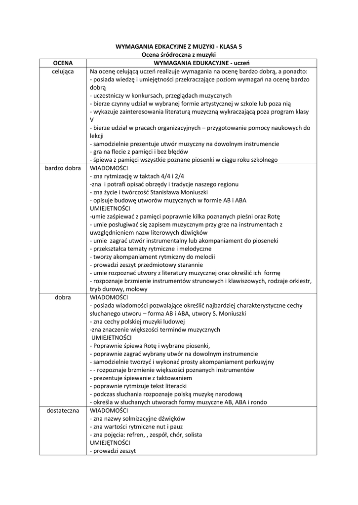OCENA celująca bardzo dobra dobra dostateczna WYMAGANIA EDKACYJNE Z MUZYKI - KLASA 5 Ocena śródroczna z muzyki WYMAGANIA EDUKACYJNE - uczeń Na ocenę celującą uczeń realizuje wymagania na ocenę bardzo dobrą, a ponadto: - posiada wiedzę i umiejętności przekraczające poziom wymagań na ocenę bardzo dobrą - uczestniczy w konkursach, przeglądach muzycznych - bierze czynny udział w wybranej formie artystycznej w szkole lub poza nią - wykazuje zainteresowania literaturą muzyczną wykraczającą poza program klasy V - bierze udział w pracach organizacyjnych – przygotowanie pomocy naukowych do lekcji - samodzielnie prezentuje utwór muzyczny na dowolnym instrumencie - gra na flecie z pamięci i bez błędów - śpiewa z pamięci wszystkie poznane piosenki w ciągu roku szkolnego WIADOMOŚCI - zna rytmizację w taktach 4/4 i 2/4 -zna i potrafi opisać obrzędy i tradycje naszego regionu - zna życie i twórczość Stanisława Moniuszki - opisuje budowę utworów muzycznych w formie AB i ABA UMIEJETNOŚCI -umie zaśpiewać z pamięci poprawnie kilka poznanych pieśni oraz Rotę - umie posługiwać się zapisem muzycznym przy grze na instrumentach z uwzględnieniem nazw literowych dźwięków - umie zagrać utwór instrumentalny lub akompaniament do pioseneki - przekształca tematy rytmiczne i melodyczne - tworzy akompaniament rytmiczny do melodii - prowadzi zeszyt przedmiotowy starannie - umie rozpoznać utwory z literatury muzycznej oraz określić ich formę - rozpoznaje brzmienie instrumentów strunowych i klawiszowych, rodzaje orkiestr, tryb durowy, molowy WIADOMOŚCI - posiada wiadomości pozwalające określić najbardziej charakterystyczne cechy słuchanego utworu – forma AB i ABA, utwory S. Moniuszki - zna cechy polskiej muzyki ludowej -zna znaczenie większości terminów muzycznych UMIEJETNOŚCI - Poprawnie śpiewa Rotę i wybrane piosenki, - poprawnie zagrać wybrany utwór na dowolnym instrumencie - samodzielnie tworzyć i wykonać prosty akompaniament perkusyjny - - rozpoznaje brzmienie większości poznanych instrumentów - prezentuje śpiewanie z taktowaniem - poprawnie rytmizuje tekst literacki - podczas słuchania rozpoznaje polską muzykę narodową - określa w słuchanych utworach formy muzyczne AB, ABA i rondo WIADOMOŚCI - zna nazwy solmizacyjne dźwięków - zna wartości rytmiczne nut i pauz - zna pojęcia: refren, , zespół, chór, solista UMIEJĘTNOŚCI - prowadzi zeszyt - bierze czynny udział w procesie lekcyjnym - umie zaśpiewać piosenki o średnim stopniu trudności - potrafi zagrać na flecie lub dzwonkach proste melodie - uzupełnia takty wartościami rytmicznymi i pauzami, potrafi taktować - wyklaskuje poznane rytmy - rozpoznaje słuchem muzykę solową, duet, orkiestrę, chór - dobiera do piosenki prosty akompaniament perkusyjny dopuszczająca WIADOMOŚCI - wymienia niektóre terminy muzyczne - potrafi wymienić przynajmniej jednego omawianego kompozytora UMIEJĘTNOŚCI -wykazuje pozytywny stosunek do przedmiotu - zadania wykonuje z pomocą nauczyciela - recytuje tekst piosenki - gra pojedyncze dźwięki na flecie lub dzwonkach - prowadzi zeszyt niesystematycznie - próbuje powtarzać najprostsze ćwiczenia rytmiczne - odróżnia muzykę solową od zespołowej niedostateczna Ocenę niedostateczna otrzymuje uczeń, który nie spełnia wymagań na ocenę dopuszczającą i mimo usilnych starań nauczyciela ma negatywny stosunek do przedmiotu. OCENA celująca bardzo dobra KLASA 5 Ocena roczna z muzyki WYMAGANIA EDUKACYJNE - uczeń Na ocenę celującą uczeń realizuje wymagania na ocenę bardzo dobrą, a ponadto: - posiada wiedzę i umiejętności przekraczające poziom wymagań na ocenę bardzo dobrą - uczestniczy w konkursach, przeglądach muzycznych - bierze czynny udział w wybranej formie artystycznej w szkole lub poza nią - wykazuje zainteresowania literaturą muzyczną wykraczającą poza program klasy V - bierze udział w pracach organizacyjnych – przygotowanie pomocy naukowych do lekcji - samodzielnie prezentuje utwór muzyczny na dowolnym instrumencie - gra na flecie z pamięci i bez błędów - śpiewa z pamięci wszystkie poznane piosenki w ciągu roku szkolnego WIADOMOŚCI - charakteryzuje muzykę programową i filmową - buduje gamę molową i durową - opisuje wybrane instrumenty strunowe i klawiszowe - zna wszystkie pojęcia muzyczne poznane w ciągu całego roku szkolnego UMIEJĘTNOŚCI -umie zaśpiewać z pamięci poprawnie kilka poznanych pieśni - umie posługiwać się zapisem muzycznym przy grze na instrumentach z uwzględnieniem nazw literowych dźwięków - umie zagrać zespole utwór instrumentalny oraz kilka akompaniamentów do piosenek - przekształca tematy rytmiczne i melodyczne - tworzy akompaniament rytmiczny do melodii - prowadzi zeszyt przedmiotowy starannie - umie rozpoznać utwory z literatury muzycznej oraz formy AB, ABA i rondo, - rozpoznaje brzmienie instrumentów strunowych i klawiszowych, rodzaje orkiestr, tryb durowy, molowy - potrafi samodzielnie odczytać wybraną melodię uwzględnieniem znaków chromatycznych dobra WIADOMOŚCI - rozumie znaczenie większości terminów muzycznych trójdźwięk, akord, zespoły instrumentalne, synkopa - rozpoznaje różne rodzaje śpiewu: chorał gregoriański, negro spirituals, jednogłosowy, chóralny, zespołowy i potrafi je scharakteryzować UMIEJĘTNOŚCI - Poprawnie śpiewa wybrane piosenki, - poprawnie zagrać wybrany utwór na dowolnym instrumencie - samodzielnie tworzyć i wykonać prosty akompaniament perkusyjny - posiadać wiadomości pozwalające określić najbardziej charakterystyczne cechy słuchanego utworu - rozpoznaje brzmienie większości poznanych instrumentów - prezentuje śpiewanie z taktowaniem - poprawnie rytmizuje tekst literacki dostateczna WIADOMOŚCI - zna nazwy solmizacyjne dźwięków - zna wartości rytmiczne nut i pauz - zna pojęcia: refren, trójdźwięk, zespół, chór, solista, orkiestra UMIEJĘTNOŚCI - prowadzi zeszyt 