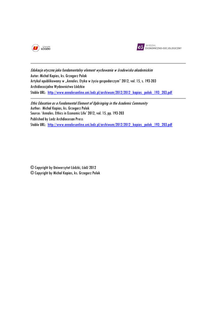 Edukacja etyczna jako fundamentalny element wychowania w środowisku akademickim Autor: Michał Kapias, ks. Grzegorz Polok Artykuł opublikowany w „Annales. Etyka w życiu gospodarczym” 2012, vol. 15, s. 193-203 Archidiecezjalne Wydawnictwo Łódzkie Stable URL: http://www.annalesonline.uni.lodz.pl/archiwum/2012/2012_kapias_polok_193_203.pdf Ethic Education as a Fundamental Element of Upbringing in the Academic Community Author: Michał Kapias, ks. Grzegorz Polok Source: ‘Annales. Ethics in Economic Life’ 2012, vol. 15, pp. 193-203 Published by Lodz Archdiocesan Press Stable URL: http://www.annalesonline.uni.lodz.pl/archiwum/2012/2012_kapias_polok_193_203.pdf © Copyright by Uniwersytet Łódzki, Łódź 2012 © Copyright by Michał Kapias, ks. Grzegorz Polok Michał Kapias ks. Grzegorz Polok Uniwersytet Ekonomiczny Katowice e-mail: [email protected] e-mail: [email protected] Edukacja etyczna jako fundamentalny element wychowania w środowisku akademickim 1. Wstęp Zachodzące w świecie procesy globalizacyjne od szeregu lat mają kolosalny wpływa na szereg sfer między innymi aktywności społeczno-gospodarczej człowieka. Działania przeprowadzane w tej przestrzeni sprawiają, iż występuje zasadnicze ułatwienie w przenoszeniu poszczególnych miejsc pracy w skali globalnej, co nie jest bez znaczenia przy minimalizowaniu kosztów działalności w kontekście lokalizacji miejsc zatrudnienia. Sytuacja ta jest w pewien sposób motywowana przemianami technologicznymi, które ostatnimi laty występują w sposób błyskawiczny. W efekcie trudno przewidzieć – nawet w niewielkich odległościach czasowych – skutków tak nagłych i radykalnych przemian nie tylko dla rynku handlowo-usługowego, ale także dla rynku pracy. Tendencje takie sprawiają, iż posiadane dotychczas wyższe wykształcenie przestało być gwarantem osiągnięcia sukcesu zawodowego, jak również możliwości utrzymania takiego samego zatrudnienia przez całe życie. Nawet wysoko wyspecjalizowani specjaliści mogą okresowo zostać bez pracy, gdyż posiadają zbyt wąskie kwalifikacje – zmieniają się bowiem technologie, usługi, wymogi rynku, co powoduje równocześnie powstanie nowych potrzeb, także na rynku pracy. Tak gwałtowne zmiany wymuszają także podjęcie innowacyjnych rozwiązań w zakresie edukacji – w szczególności na stopni wyższym. Okazuje się bowiem, iż studia wyższe nadal umożliwiają osiągnięcie kariery zawodowej, ale już nie gwarantują uzyskania zawodowych kwalifikacji, dzięki którym można by pracować zgodnie z wyedukowanym kierunkiem studiów. Celem edukacji akademickiej nie jest już przygotowanie do uprawiania konkretnego zawodu, ale raczej przedłożenie pewnej wiedzy oraz wykształcenie stosownych umiejętności przydatnych w procesie zmieniających się wymagań na rynku pracy. Taka edukacja ze swej istoty musi posiadać charakter ogólny, wieloaspektowy, albowiem przygotowuje do uczenia się przez całe życie. Podstawowym więc celem działania szkół wyższych staje się nie tylko rozwijanie badań, ale przede wszystkim kształcenie na różnych poziomach zaawansowania ludzi MICHAŁ KAPIAS, KS. GRZEGORZ POLOK 194 zdolnych do tworzenia i rozwijania potencjału gospodarczego regionów i państw 1. Z tego też względu uczelniom stawiane są szczególnie wysokie wymagania z uwagi na rolę, jaką pełnią w rozwoju społeczno-gospodarczym państwa. To przecież w środowisku akademickim dokonuje się proces dyfuzji wiedzy, jak i kształtowanie struktury wartości respektowanych w działaniu przez przyszłe elity2. Dlatego też powstałe zmiany powinny mieć na celu przygotowanie absolwentów do potrzeb rynku pracy, rozwój i podtrzymanie podstaw wiedzy zaawansowanej, kształtowanie aktywnych postaw obywatelskich, a także rozwój osobowy studentów – niestety kategoria ta umieszczona jest na samym końcu, co często prowadzi do całkowitego jej ignorowania i pomijania3. 2. Unia Europejska a edukacja akademicka Biorąc pod uwagę fakty wskazane we wstępie tego artykułu Unia Europejska tworzy pewną strategię, w której przekształcając swą gospodarkę opartą na wiedzy, uwypukla znaczenie wzrostu nakładów na edukację, jako czynnika zwiększającego innowacyjność gospodarki4. Ten kierunek działań jest konsekwencją konstatacji, iż proces uczenia się i przekazywania wiedzy, dzielenia się nią i tworzenia innowacji jest uwarunkowany współpracą i zaufaniem tworzącym się w środowisku regionalnym. Zachodzi więc konieczność wzmocnienia roli szkolnictwa wyższego. Zresztą tendencje takie można odnaleźć chociażby w unijnym dokumencie zatytułowanym: Biała Księga o Kształceniu i Doskonaleniu Zawodowym (White Paper on Education and Training. Teaching and Learning – Towards the Learning Society, 1995)5. W związku z pogłębiającym się bezrobociem powstają poważne problemy natury społeczno-gospodarczej a także politycznej6. Tendencja taka jest postrzegana jako marnotrawstwo kapitału ludzkiego, będące sporym obciążeniem budżetu każdego z państw. Aby temu zaradzić – wytyczne unijne sugerują – iż należy wzmocnić działania na rzecz edukacji i doskonalenia kwalifikacji zawodowych, dzięki czemu nastąpi łatwiejszy dostęp do zdobycia zatrudnienia. Przyjmuje się przy tym, że odpowiednie wykształcenie jest siłą napędową rozwoju i skutecznej konkurencji międzynarodowej. Wyedukowana jednostka ma być: autonomiczna, krytyczna, moralnie i społecznie odpowiedzialna, a zarazem otwarta na kulturę. W tym kontekście niknie idea człowieka wykreowanego jako utylitarne narzędzie wykorzystywane w gospodarce7. Stąd rodzą się wszelakie inwestycje 1 Zob. L. Moratis, J. Hoff, B. Reul, A Dual Challenge Facing Management Education: Simulation-based Learning and Learning about CSR, w: “The Journal of Management Development” 2006, Vol. 25, s. 213–231. 2 Zob. A. Sobczak, G. Debucquet, Ch. Havard, The Impact of Higher Educ