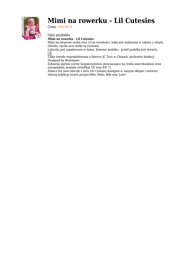 Mimi na rowerku - Lil Cutesies Cena: 104.00 zł Opis produktu Mimi na rowerku - Lil Cutesies Mimi ma brązowe oczka oraz 21cm wysokości, lalka jest wykonana w całości z winylu. Główka, rączki oraz nóżki są ruchome. Laleczka jest zapakowana w ładne, firmowe pudełko - przód pudełka jest otwarty. Lalka została wyprodukowana a fabryce JC Toys w Chinach, pochodziz kolekcji Designed by Berenguer. Zabawka spełnia normy bezpieczeństwa obowiązujące na rynku amerykańskim oraz europejskim, posiada certyfikat CE oraz EN 71. Zobacz też inne laleczki z serii Lili Cutesies dostępne w naszym sklepie i swtwórz własną kolekcję trzech przyjaciółek: Mimi, Bibi oraz Lulu!