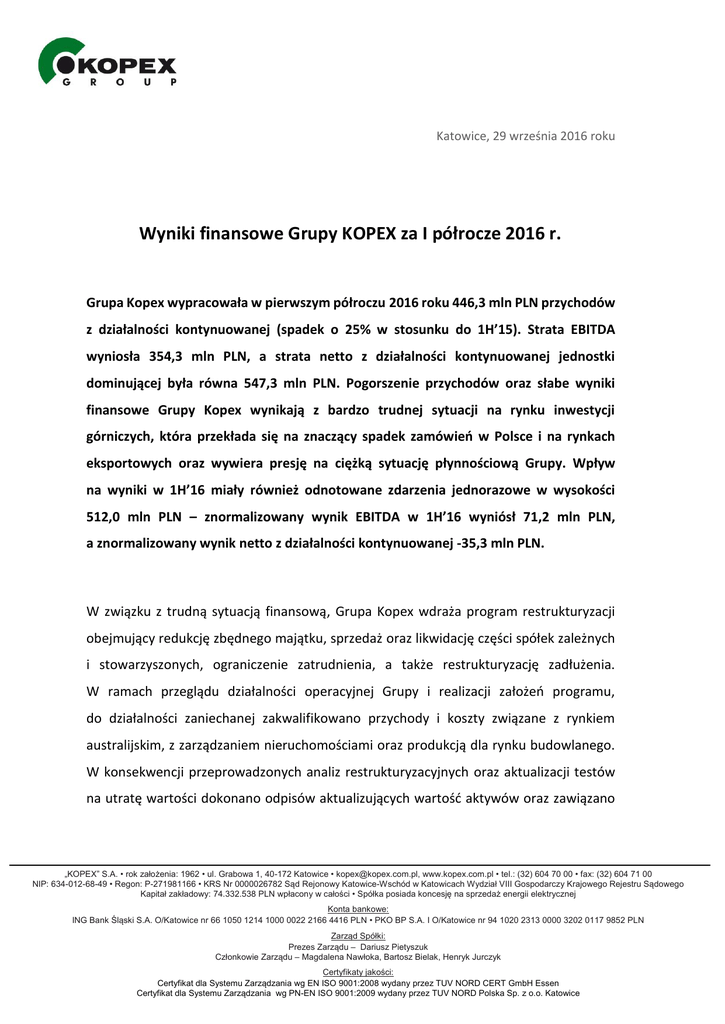 Katowice, 29 września 2016 roku Wyniki finansowe Grupy KOPEX za I półrocze 2016 r. Grupa Kopex wypracowała w pierwszym półroczu 2016 roku 446,3 mln PLN przychodów z działalności kontynuowanej (spadek o 25% w stosunku do 1H’15). Strata EBITDA wyniosła 354,3 mln PLN, a strata netto z działalności kontynuowanej jednostki dominującej była równa 547,3 mln PLN. Pogorszenie przychodów oraz słabe wyniki finansowe Grupy Kopex wynikają z bardzo trudnej sytuacji na rynku inwestycji górniczych, która przekłada się na znaczący spadek zamówień w Polsce i na rynkach eksportowych oraz wywiera presję na ciężką sytuację płynnościową Grupy. Wpływ na wyniki w 1H’16 miały również odnotowane zdarzenia jednorazowe w wysokości 512,0 mln PLN – znormalizowany wynik EBITDA w 1H’16 wyniósł 71,2 mln PLN, a znormalizowany wynik netto z działalności kontynuowanej -35,3 mln PLN. W związku z trudną sytuacją finansową, Grupa Kopex wdraża program restrukturyzacji obejmujący redukcję zbędnego majątku, sprzedaż oraz likwidację części spółek zależnych i stowarzyszonych, ograniczenie zatrudnienia, a także restrukturyzację zadłużenia. W ramach przeglądu działalności operacyjnej Grupy i realizacji założeń programu, do działalności zaniechanej zakwalifikowano przychody i koszty związane z rynkiem australijskim, z zarządzaniem nieruchomościami oraz produkcją dla rynku budowlanego. W konsekwencji przeprowadzonych analiz restrukturyzacyjnych oraz aktualizacji testów na utratę wartości dokonano odpisów aktualizujących wartość aktywów oraz zawiązano „KOPEX” S.A. • rok założenia: 1962 • ul. Grabowa 1, 40-172 Katowice • [email protected], www.kopex.com.pl • tel.: (32) 604 70 00 • fax: (32) 604 71 00 NIP: 634-012-68-49 • Regon: P-271981166 • KRS Nr 0000026782 Sąd Rejonowy Katowice-Wschód w Katowicach Wydział VIII Gospodarczy Krajowego Rejestru Sądowego Kapitał zakładowy: 74.332.538 PLN wpłacony w całości • Spółka posiada koncesję na sprzedaż energii elektrycznej Konta bankowe: ING Bank Śląski S.A. O/Katowice nr 66 1050 1214 1000 0022 2166 4416 PLN • PKO BP S.A. I O/Katowice nr 94 1020 2313 0000 3202 0117 9852 PLN Zarząd Spółki: Prezes Zarządu – Dariusz Pietyszuk Członkowie Zarządu – Magdalena Nawłoka, Bartosz Bielak, Henryk Jurczyk Certyfikaty jakości: Certyfikat dla Systemu Zarządzania wg EN ISO 9001:2008 wydany przez TUV NORD CERT GmbH Essen Certyfikat dla Systemu Zarządzania wg PN-EN ISO 9001:2009 wydany przez TUV NORD Polska Sp. z o.o. Katowice rezerwy na koszty restrukturyzacji, co negatywnie wpłynęło na wynik operacyjny Grupy Kopex w 1H’16 w wysokości 425,5 mln PLN. Dokonane odpisy dotyczyły przede wszystkim aktywów niefinansowych (329,9 mln PLN) oraz należności (88,8 mln PLN). Wpływ na wynik netto miały również ujęte odpisy na aktywa finansowe (24,7 mln PLN) i częściowe rozwiązanie aktywa na podatek dochodowy (61,8 mln PLN). Wartość ujętych w sprawozdaniu finansowym za 1H’16 odpisów aktualizacyjnych oraz rezerw nie przekroczyła wartości 535,0 mln PLN, wskazanej w raporcie bieżącym nr 46/2016. Działalność operacyjna Grupy Kopex znajduje się pod presją ograniczonej płynności i do czasu podpisania właściwej umowy restrukturyzacyjnej, Grupa będzie funkcjonowała w stanie niepewności co do swojej przyszłości. Znaczący wpływ na zmniejszenie sprzedaży oraz trudną sytuację Grupy miało ograniczenie przez banki finansujące limitów gwarancyjnych, co utrudnia pozyskiwanie nowych zleceń. Dodatkowo sytuacja na rynku, na którym działa Grupa jest bardzo trudna, a zatory płatnicze i trudności ze ściąganiem należności stały się już praktycznie normą. W pierwszym półroczu 2016 roku w porównaniu z 1H’15 spadła sprzedaż w głównych segmentach operacyjnych. Segment usług górniczych wypracował 116,9 mln PLN przychodów oraz znormalizowany wynik EBIT równy 9,0 mln PLN. Największe zrealizowane w pierwszym kwartale kontrakty obejmowały roboty podziemne dla KGHM, roboty szybowe dla JSW, Tauronu oraz PGG. Segment górnictwa podziemnego odnotował przychody w wysokości 205,7 mln PLN oraz znormalizowany wynik EBIT -33,3 mln PLN. Spadek sprzedaży w 1H’16 r/r wynika z niższych przychodów w kraju i w Rosji. W Polsce największy zrealizowany kontrakt dotyczył dostawy wybranych elementów kompleksu ścianowego dla kopalni Knurów – Szczygłowice. „KOPEX” S.A. • rok założenia: 1962 • ul. Grabowa 1, 40-172 Katowice • [email protected], www.kopex.com.pl • tel.: (32) 604 70 00 • fax: (32) 604 71 00 NIP: 634-012-68-49 • Regon: P-271981166 • KRS Nr 0000026782 Sąd Rejonowy Katowice-Wschód w Katowicach Wydział VIII Gospodarczy Krajowego Rejestru Sądowego Kapitał zakładowy: 74.332.538 PLN wpłacony w całości • Spółka posiada koncesję na sprzedaż energii elektrycznej Konta bankowe: ING Bank Śląski S.A. O/Katowice nr 66 1050 1214 1000 0022 2166 4416 PLN • PKO BP S.A. I O/Katowice nr 94 1020 2313 0000 3202 0117 9852 PLN Zarząd Spółki: Prezes Zarządu – Dariusz Pietyszuk Członkowie Zarządu – Magdalena Nawłoka, Bartosz Bielak, Henryk Jurczyk Certyfikaty jakości: Certyfikat dla Systemu Zarządzania wg EN ISO 9001:2008 wydany przez TUV NORD CERT GmbH Essen Certyfikat dla Systemu Zarządzania wg PN-EN ISO 9001:2009 wydany przez TUV NORD Polska Sp. z o.o. Katowice Segment urządzeń elektrycznych i elektronicznych utrzymał przychody na zbliżonym r/r poziomie 40,7 mln PLN oraz odnotował znormalizowany wynik EBIT w wysokości 3,7 mln PLN. Poprawa rentowności segmentu była spowodowana przede wszystkim wyższymi przychodami i wynikami na rynku RPA. Na koniec pierwszego półrocza 2016 backlog Grupy Kopex w core business zmniejszył się o 7% r/r i wynosił 1,01 mld PLN, z tego 819,1 mln PLN z rynku polskiego. Większość backlogu przypadała na segment usług górniczych - 592,1 mln PLN (-17% r/r), z kolei 