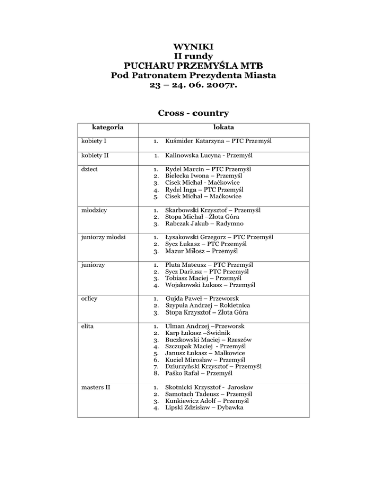 WYNIKI II rundy PUCHARU PRZEMYŚLA MTB Pod Patronatem Prezydenta Miasta 23 – 24. 06. 2007r. Cross - country kategoria lokata kobiety I 1. Kuśmider Katarzyna – PTC Przemyśl kobiety II 1. Kalinowska Lucyna - Przemyśl dzieci 1. 2. 3. 4. 5. młodzicy 1. Skarbowski Krzysztof – Przemyśl 2. Stopa Michał –Złota Góra 3. Rabczak Jakub – Radymno juniorzy młodsi 1. Łysakowski Grzegorz – PTC Przemyśl 2. Sycz Łukasz – PTC Przemyśl 3. Mazur Miłosz – Przemyśl juniorzy 1. 2. 3. 4. Pluta Mateusz – PTC Przemyśl Sycz Dariusz – PTC Przemyśl Tobiasz Maciej – Przemyśl Wojakowski Łukasz – Przemyśl orlicy 1. 2. 3. Gujda Paweł – Przeworsk Szypuła Andrzej – Rokietnica Stopa Krzysztof – Złota Góra elita 1. 2. 3. 4. 5. 6. 7. 8. Ulman Andrzej –Przeworsk Karp Łukasz –Świdnik Buczkowski Maciej – Rzeszów Szczupak Maciej - Przemyśl Janusz Łukasz – Małkowice Kuciel Mirosław – Przemyśl Dziurzyński Krzysztof – Przemyśl Paśko Rafał – Przemyśl masters II 1. 2. 3. 4. Skotnicki Krzysztof - Jarosław Samotach Tadeusz – Przemyśl Kunkiewicz Adolf – Przemyśl Lipski Zdzisław – Dybawka Rydel Marcin – PTC Przemyśl Bielecka Iwona – Przemyśl Cisek Michał - Maćkowice Rydel Inga – PTC Przemyśl Cisek Michał – Maćkowice UPHILL Kategoria Mężczyźni open Kobiety open Czas przejazdu 4,11 4,16 4,25 4,42 4,50 4,52 4,55 5,11 5,42 6,55 8,05 Lokata 1. 2. 3. 4. 5. 6. 7. 8. 9. 10. 11. 8,58 Pluta Mateusz – PTC Przemyśl Sycz Dariusz – PTC Przemyśl Mazur Miłosz - Przemyśl Szuban Bartosz– PTC Przemyśl Kosterkiewicz Marcin - Przemyśł Sycz Łukasz – PTC Przemyśl Łysakowski Grzegorz – PTC Przemyśl Szczupak Maciej - Przemyśl Gac Tomasz - – PTC Przemyśl Rydel Marcin – PTC Przemyśl Lipski Zdzisław - Dybawka 1. Kuśmider Katarzyna – PTC Przemyśl DOWNHILL Kategoria Hobby - hardtail Hobby - full Czas przejazdu 1;26;83 1;27;39 1;33;03 1;35;04 1;35;87 1;36;53 1;44;94 1;45;10 1;46;92 1;22;36 1;24;120 1;24;129 1;26;43 1;28;14 1;28;18 1;30;12 1;30;89 1;31;37 1;35;26 1;40;06 1;43;64 1;45;18 Lokata 1. 2. 3. 4. 5. 6. 7. 8. 9. 10. Grudz Jakub - Sanok Szymczycha Krystian - Jarosław Stefanowicz Jakub - Sanok Halerz Dariusz - Sanok Blecharczyk Łukasz - Sanok Bucia Łukasz - Gorliczyna Błoniarz Patryk - Zaczernie Gałuszka Bogusław - Rzeszów Krajewski Wojciech - Bircza Augustyniak Sylwester - Przemyśl 1. 2. 3. 4. 5. 6. 7. 8. 9. 10. 11. 12. 13. Radaczyński Michał – Rzeszów Pleśniak Daniel – Rzeszów Haduch Maciej - Sanok Śmiertka Przemysław – Warszawa Madej Łukasz –Rzeszów Bochenek Andrzej – Warszawa Jaworek Robert – Warszawa Młynarski Robert – Rzeszów Hryniszyn Waldemar – Przemyśl Waltoś Kondrat – Zaczernie Koroblewski Łukasz – Jarosław Malec Artur – Lublin Dudek Mateusz – Miłocin 1;46;60 14. Homa Damian – Jarosław Junior 1;26;93 1;28;07 1;34;15 1;40;04 2;31;40 1. 2. 3. 4. 5. Elita 1;19;18 1;24;40 1. Jodko Maciej –Rzeszów 2. Kardaś Sławomir - Zakopane Masters 1;24;35 1;27;97 1;29;52 1;35;51 1. 2. 3. 4. Waltoś Grzegorz – Rzeszów Burtan Mirosław – Zakopane Pluta Mateusz – Przemyśl Mazur Miłosz – Przemyśl Ścieranka Mateusz – Sanok Karpiel Jan – Zakopane Wijowski Michał – Rzeszów Ścieranka Wojciech – Sanok Gembalik Piotr - Przemyśl Wyniki pobrano ze strony www.przemysl24.pl