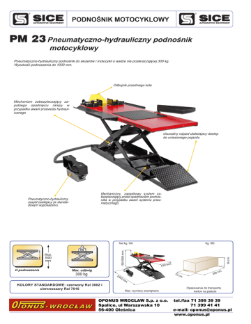 PODNOŚNIK MOTOCYKLOWY PM 23 Pneumatyczno-hydrauliczny podnośnik motocyklowy Pneumatyczno-hydrauliczny podnośnik do skuterów i motocykli o wadze nie przekraczającej 300 kg. Wysokość podnoszenia do 1000 mm. Odbojnik przedniego koła Mechanizm zabezpieczający zapobiega opadnięciu rampy w przypadku awarii przewodu hydraulicznego Usuwalny najazd ułatwiajacy dostep do uniesionego pojazdu Mechaniczny, zapadkowy system zabezpieczający przed opadnieciem podnosnika w przypadku awarii systemu pneumatycznego. Pneumatyczno-hydrauliczny zespół zasilajacy (w standardowym wyposazeniu. Max. 1000 mm 300 kg H podnoszenia Kg. 180 56 cm. 150/1000 mm. Net kg. 160 m 650 m Max. udźwig 300 kg 24 95 KOLORY STANDARDOWE: czerwony Ral 3002 i ciemnoszary Ral 7016 72 mm cm . . cm 206 . Max. wymiary zewnętrzne OPONUS WROCŁAW S.p. z o.o. Spalice, ul Warszawska 10 56-400 Oleśnica Opakowanie do transportu karton na palecie tel./fax 71 399 39 39 71 399 41 41 e-mail: [email protected] www.oponus.pl