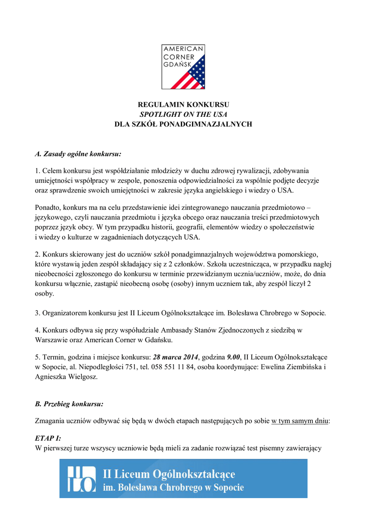 REGULAMIN KONKURSU SPOTLIGHT ON THE USA DLA SZKÓŁ PONADGIMNAZJALNYCH A. Zasady ogólne konkursu: 1. Celem konkursu jest współdziałanie młodzieży w duchu zdrowej rywalizacji, zdobywania umiejętności współpracy w zespole, ponoszenia odpowiedzialności za wspólnie podjęte decyzje oraz sprawdzenie swoich umiejętności w zakresie języka angielskiego i wiedzy o USA. Ponadto, konkurs ma na celu przedstawienie idei zintegrowanego nauczania przedmiotowo – językowego, czyli nauczania przedmiotu i języka obcego oraz nauczania treści przedmiotowych poprzez język obcy. W tym przypadku historii, geografii, elementów wiedzy o społeczeństwie i wiedzy o kulturze w zagadnieniach dotyczących USA. 2. Konkurs skierowany jest do uczniów szkół ponadgimnazjalnych województwa pomorskiego, które wystawią jeden zespół składający się z 2 członków. Szkoła uczestnicząca, w przypadku nagłej nieobecności zgłoszonego do konkursu w terminie przewidzianym ucznia/uczniów, może, do dnia konkursu włącznie, zastąpić nieobecną osobę (osoby) innym uczniem tak, aby zespół liczył 2 osoby. 3. Organizatorem konkursu jest II Liceum Ogólnokształcące im. Bolesława Chrobrego w Sopocie. 4. Konkurs odbywa się przy współudziale Ambasady Stanów Zjednoczonych z siedzibą w Warszawie oraz American Corner w Gdańsku. 5. Termin, godzina i miejsce konkursu: 28 marca 2014, godzina 9.00, II Liceum Ogólnokształcące w Sopocie, al. Niepodległości 751, tel. 058 551 11 84, osoba koordynujące: Ewelina Ziembińska i Agnieszka Wielgosz. B. Przebieg konkursu: Zmagania uczniów odbywać się będą w dwóch etapach następujących po sobie w tym samym dniu: ETAP I: W pierwszej turze wszyscy uczniowie będą mieli za zadanie rozwiązać test pisemny zawierający pytania z zakresu historii, geografii, państwa i społeczeństwa i kultury USA. Szczegółowy zakres materiału w Załączniku nr 1. ETAP II: 1. Do kolejnego etapu konkursu przechodzą wszyscy uczestnicy niezależnie od uzyskanej ilości punktów. Punkty uzyskane indywidualnie przez uczestników są sumowane dla poszczególnych zespołów. 2. Każdy zespół zostanie poproszony o zaprezentowanie przygotowanej wcześniej prezentacji pt. USA IN OUR EYES zawierającej ich skojarzenia na temat Stanów Zjednoczonych - jak postrzegają ten kraj- z podkreśleniem niepowtarzalnego charakteru tego państwa i jego wkładu w kulturę i dzieje całego świata. 3. Prezentacja powinna trwać ok. 10 min, ale nie dłużej niż 15. Oceniana będzie techniczna strona przygotowanego materiału, jego treść merytoryczna, sposób prezentacji oraz płynność i poprawność wypowiedzi. 4. Zakres merytoryczny prezentacji i obszary punktowane w kategorii treści: a) jakie aspekty z wiedzy o Stanach Zjednoczonych zostały dostrzeżone przez zespół i jak uzasadnili swoje wybory, b) czy prezentacja zawiera ciekawostki o Stanach Zjednoczonych czy tylko suche fakty, c) czy prezentacja jest zachętą, reklamą dla oglądających mającą na celu zachęcenie do zapoznania się z kulturą amerykańską. 5. Zespoły oceniać będzie niezależna komisja konkursu składająca się z 3 członków jury, przedstawiciela Ambasady, American Corner oraz Uniwersytetu Gdańskiego. Komisja ocenia wszystkie zespoły zgłoszone do konkursu i po zakończeniu obu etapów, ogłasza jego wyniki. Komisja ocenia pracę zespołu pod kątem: a) poprawnego rozwiązania testu - max 40 punktów, b) przedstawionej prezentacji - treść prezentacji max. 5 punktów, bogactwo językowe max. 5 punktów, sposób jej przedstawienia, kontakt z publicznością, płynność wypowiedzi i wymowa max. 5 punktów. Punkty za prezentację będą przyznawane również przez wszystkich uczestników konkursu - dla każdej prezentacji – max. 5 punktów. Wynik jaki może osiągnąć zespół to max. 60 punktów. Zwycięża drużyna, która uzyska największą liczbę punktów. 6. Poziom oczekiwanej wiedzy jest równoznaczny ze standardami poziomu rozszerzonego matury z języka angielskiego i w odpowiednim zakresie z wiadomości o Stanach Zjednoczonych w zakresie przedmiotów ujętych podstawą programową (historia, wiedza o społeczeństwie, geografia). 6. Każdy zespół może skorzystać z dostępnych na miejscu rzutników multimedialnych oraz komputerów. W przypadku wykorzystania prezentacji multimedialnej należy przygotować ją w programie MS Power Point i na wszelki wypadek posiadać więcej niż jedną sprawdzoną kopię, najlepiej na różnych nośnikach. Jeżeli zespół zechce korzystać z własnego sprzętu może sprzęt taki przywieść ze sobą. 7. W zgłoszeniu zespołu wysyłanym przez szkołę należy podać, jakie narzędzia dydaktyczne będzie wykorzystywał zespół i czy będą to środki własne (dostarczone przez drużynę). C. Uwagi organizacyjne: Zgłoszenia zespołów należy dokonywać drogą e-mailową na adres: [email protected] lub faksem (58) 550-30-68 do dnia 21-go marca 2014 roku włącznie, do godziny 15.00. W zgłoszeniu należy podać nazwę szkoły i nauczyciela/opiekuna zespołu oraz imiona i nazwiska uczniów startujących w konkursie. W razie konieczności zastępstwa nazwisko ucznia (uczniów) rezerwowego można podać w dniu konkursu, przed jego rozpoczęciem D. Nagrody: 1. Nagrody rzeczowe ufundowane przez Ambasadę Amerykańską otrzymają członkowie trzech pierwszych zespołów. 2.Wszyscy uczestnicy konkursu otrzymują dyplomy pamiątkowe. 3. Dla uczniów – uczestników konkursu i ich nauczycieli/opiekunów będzie przygotowany poczęstunek. Serdecznie zapraszamy! ZAŁĄCZNIK NR 1 Zakres materiału obowiązujący uczestników konkursu: 1. Historia: - najważniejsze wydarzenia w historii Stanów Zjednoczonych (od założenia pierwszych kolonii do czasów współczesnych); - słynne postacie historyczne (prezydenci, działacze polityczni, przedsiębiorcy, wynalazcy, etc.). 2. Państwo i społeczeństwo: - ustrój polityczny i prawny (podział władzy, part