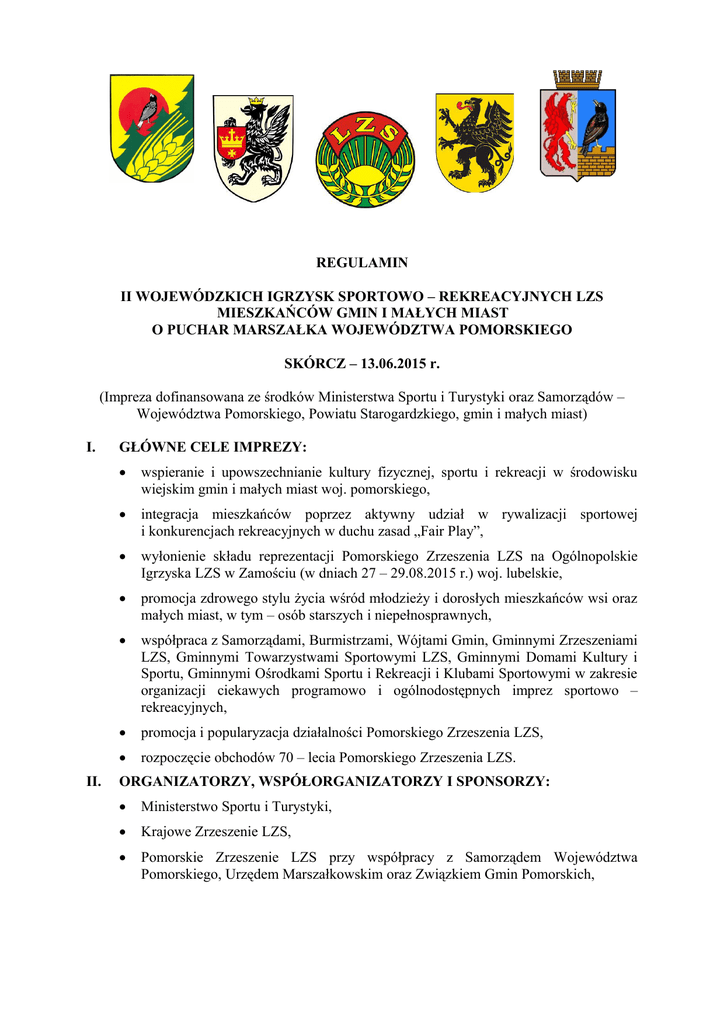 REGULAMIN II WOJEWÓDZKICH IGRZYSK SPORTOWO – REKREACYJNYCH LZS MIESZKAŃCÓW GMIN I MAŁYCH MIAST O PUCHAR MARSZAŁKA WOJEWÓDZTWA POMORSKIEGO SKÓRCZ – 13.06.2015 r. (Impreza dofinansowana ze środków Ministerstwa Sportu i Turystyki oraz Samorządów – Województwa Pomorskiego, Powiatu Starogardzkiego, gmin i małych miast) I. II. GŁÓWNE CELE IMPREZY: wspieranie i upowszechnianie kultury fizycznej, sportu i rekreacji w środowisku wiejskim gmin i małych miast woj. pomorskiego, integracja mieszkańców poprzez aktywny udział w rywalizacji sportowej i konkurencjach rekreacyjnych w duchu zasad „Fair Play”, wyłonienie składu reprezentacji Pomorskiego Zrzeszenia LZS na Ogólnopolskie Igrzyska LZS w Zamościu (w dniach 27 – 29.08.2015 r.) woj. lubelskie, promocja zdrowego stylu życia wśród młodzieży i dorosłych mieszkańców wsi oraz małych miast, w tym – osób starszych i niepełnosprawnych, współpraca z Samorządami, Burmistrzami, Wójtami Gmin, Gminnymi Zrzeszeniami LZS, Gminnymi Towarzystwami Sportowymi LZS, Gminnymi Domami Kultury i Sportu, Gminnymi Ośrodkami Sportu i Rekreacji i Klubami Sportowymi w zakresie organizacji ciekawych programowo i ogólnodostępnych imprez sportowo – rekreacyjnych, promocja i popularyzacja działalności Pomorskiego Zrzeszenia LZS, rozpoczęcie obchodów 70 – lecia Pomorskiego Zrzeszenia LZS. ORGANIZATORZY, WSPÓŁORGANIZATORZY I SPONSORZY: Ministerstwo Sportu i Turystyki, Krajowe Zrzeszenie LZS, Pomorskie Zrzeszenie LZS przy współpracy z Samorządem Województwa Pomorskiego, Urzędem Marszałkowskim oraz Związkiem Gmin Pomorskich, Powiatowe Zrzeszenie LZS przy współpracy z Starostą powiatu starogardzkiego oraz Wydziałem Kultury i Promocji, Burmistrz Miasta i Wójt Gminy Skórcz oraz Miejski Dom Kultury, Ludowy Lekkoatletyczny Klub Sportowy „Ziemi Kociewskiej” w Skórczu, Straż Pożarna w Skórczu, Zespół Szkół Ponadgimnazjalnych w Skórczu, Sponsorzy Igrzysk: Ministerstwo Sportu i Turystyki, Samorząd Województwa Pomorskiego, Związek Gmin Pomorskich, Starostwo Powiatowe, miasto Skórcz i gmina Skórcz, „Iglotex” w Skórczu, Bank Spółdzielczy O/ w Skórczu, Gminna Spółdzielnia „SCH” w Skórczu, Hurtownia Materiałów Budowlanych „Arkada” w Skórczu, „Szarmach” Skórcz, „Netto” Kopytkowo, KGW Pączewo, Masarnia „Herold” Zblewo, „Polpharma” Starogard Gdański i inni zgłaszający wolę sponsoringu Igrzysk. Wolontariusze (zespół środowiskowy). Gospodarzami imprezy organizowanej w obrębie infrastruktury sportowo – rekreacyjnej miasta oraz gminy Skórcz są: Przewodniczący Komitetu Organizacyjnego Igrzysk - Burmistrz miasta Janusz Kosecki Z-cy Przew. Komitetu Organizacyjnego Igrzysk - Wójt Gminy Skórcz Sławomir Czechowski, oraz Przewodnicząca RW PZ LZS Magdalena Kołodziejczak – Wójt Gminy Pruszcz Gdański. W składzie Komitetu są Wiesław Szczodrowski – Wiceprzewodniczący RW PZ LZS, Franciszek Kaszubowski – Sekretarz RW PZ LZS, Zygfryd Anhalt – trener lekkiej atletyki, Zasłużony Działacz LZS, Mirosław Osowski – Prezes LLKS „Ziemi Kociewskiej” Skórcz. III. TERMIN I MIEJSCE IMPREZY: Igrzyska rozegrane zostaną na obiektach sportowo – rekreacyjnych miasta Skórcza oraz gminy Skórcz wg załączonego programu, impreza odbędzie się w dniu 13 czerwca 2015 roku (sobota), z uroczystym otwarciem o godz. 1030, zapaleniem znicza – symbolu zmagań sportowych, przemarszem reprezentacji (przy orkiestrze dętej) wokół stadionu miejskiego i ustawienie reprezentacji na płycie boiska przed budynkiem zaplecza sportowego, centralnym obiektem rywalizacji będzie stadion przy ul. Leśnej w Skórczu. Turniej piłki nożnej odbędzie się we wsi Pączewo k. Skórcza, miejsca konkurencji zostaną oznaczone, a ich usytuowanie znajdzie się na specjalnym planie dostarczonym do gmin uczestniczących w imprezie – na 7 dni przed datą Igrzysk. IV. PATRONAT MEDIALNY: Patronat medialny: „Dziennik Bałtycki POLSKA THE TIMES” – Redakcja O/ Starogard Gdański, „Wiadomości Kociewskie” O/w Starogardzie Gdańskim, „Gazeta Kociewska” Starogard Gdański, „Nasz Powiat” Starogard Gdański, „Tygodnik Parafialny” Skórcz, „Radio Gdańsk”, Radio „Głos” Pelplina. 2 V. ZASADY UCZESTNICTWA: W Igrzyskach mają prawo uczestnictwa mieszkańcy gmin i miast woj. pomorskiego zgłoszeni na listach imiennych poszczególnych reprezentacji (w przypadku osób niepełnosprawnych – przez przedstawiciela ustawowego). Listę zgłoszeniową potwierdza Burmistrz / Wójt miasta / gminy i przesyła pocztą elektroniczną na adres: [email protected] do dnia 01.06.2015 r. a uzupełnienia (zmiany) winny być dokonane do dnia 08.06.2015 r. (w wyjątkowych przypadkach – w dniu imprezy wraz z oryginałami zgłoszeń, niezbędnymi przy rozliczeniu końcowym zadania). Uczestniczące gminy i miasta dokonują – do dnia 25.05.2015 r. wpłaty kwoty 500 zł z wyłącznym przeznaczeniem na koszty organizacji imprez na konto nr: 95 8342 0009 0002 6840 2000 0001 Bank Spółdzielczy Skórcz, z dopiskiem „Igrzyska – 2015”. W rywalizacji obowiązuje ubiór sportowy, obuwie zgodnie ze specyfiką dyscypliny sportu (patrz: konkurencje). Uwaga: w Igrzyskach mogą startować wyłącznie zawodnicy / zawodniczki rocznika 1997 i starsi/sze, u których nie ma przeciwwskazań lekarskich do udziału w konkurencji. Uczestnicy zobowiązani są do przestrzegania niniejszego regulaminu. Rozstrzygnięcia sędziowskie są ostateczne. Protest może zostać złożony najpóźniej do 20 minut od zakończenia danej konkurencji. Wniesienie protestu wiąże się z opłatą w wysokości 300 zł, zwracaną składającemu protest w przypadku korzystnego rozstrzygnięcia przez Komisję Odwoławczą. W przypadku nie uznania protestu kwota ta przechodzi na dobro organizatora i kosztów organizacyjnych imprezy. VI. DYSCYPLINY I KONKURENCJE SPORTOWE A. Gry zespołowe: (kategoria wiekowa dla wszystkich dysc