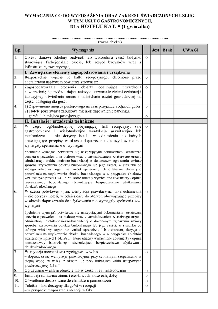 WYMAGANIA CO DO WYPOSAŻENIA ORAZ ZAKRESU ŚWIADCZONYCH USŁUG, W TYM USŁUG GASTRONOMICZNYCH, DLA HOTELU KAT. * (1 gwiazdka) .......................................................................................................... (nazwa obiektu) Lp. 1. Wymagania Jest Brak Obiekt stanowi odrębny budynek lub wydzieloną część budynku stanowiącą funkcjonalnie całość, lub zespół budynków wraz z infrastrukturą towarzyszącą o I. Zewnętrzne elementy zagospodarowania i urządzenia 2. 3. 4. Bezpośrednie wejście do hallu recepcyjnego, chronione przed nadmiernym napływem powietrza z zewnątrz Zagospodarowanie otoczenia obiektu obejmujące utwardzoną nawierzchnię dojazdów i dojść, należyte utrzymanie zieleni ozdobnej i izolacyjnej, oświetlenie terenu i oddzielenie części gospodarczej od części dostępnej dla gości 1) Zapewnienie miejsca postojowego na czas przyjazdu i odjazdu gości 2) Hotele poza zwartą zabudową miejską: zapewnienie parkingu, garażu lub miejsca postojowego o o o o II. Instalacje i urządzenia techniczne 5. W części ogólnodostępnej obejmującej hall recepcyjny, sale gastronomiczne i wielofunkcyjne wentylacja grawitacyjna lub mechaniczna – nie dotyczy hoteli, w odniesieniu do których obowiązujące przepisy w okresie dopuszczenia do użytkowania nie wymagały spełnienia ww. wymagań o Spełnienie wymagań potwierdza się następującymi dokumentami: ostateczną decyzją o pozwoleniu na budowę wraz z zaświadczeniem właściwego organu administracji architektoniczno-budowlanej o dokonanym zgłoszeniu zmiany sposobu użytkowania obiektu budowlanego lub jego części, w stosunku do którego właściwy organ nie wniósł sprzeciwu, lub ostateczną decyzją o pozwoleniu na użytkowanie obiektu budowlanego, a w przypadku obiektów wzniesionych przed 1.04.1995r., które utraciły wymienione dokumenty - opinią rzeczoznawcy budowlanego stwierdzającą bezpieczeństwo użytkowania obiektu budowlanego 6. W części pobytowej - j.m. wentylacja grawitacyjna lub mechaniczna – nie dotyczy hoteli, w odniesieniu do których obowiązujące przepisy w okresie dopuszczania do użytkowania nie wymagały spełnienia ww. wymagań o Spełnienie wymagań potwierdza się następującymi dokumentami: ostateczną decyzją o pozwoleniu na budowę wraz z zaświadczeniem właściwego organu administracji architektoniczno-budowlanej o dokonanym zgłoszeniu zmiany sposobu użytkowania obiektu budowlanego lub jego części, w stosunku do którego właściwy organ nie wniósł sprzeciwu, lub ostateczną decyzją o pozwoleniu na użytkowanie obiektu budowlanego, a w przypadku obiektów wzniesionych przed 1.04.1995r., które utraciły wymienione dokumenty - opinią rzeczoznawcy budowlanego stwierdzającą bezpieczeństwo użytkowania obiektu budowlanego 7. 8. 9. 10. 11. Wentylacja mechaniczna wyciągowa w w.h.s. – dopuszcza się wentylację grawitacyjną, przy centralnym zaopatrzeniu w ciepłą wodę, w w.h.s. z oknem lub przy kubaturze kabin ustępowych przekraczającej 6,5 m3 Ogrzewanie w całym obiekcie lub w części nieklimatyzowanej Instalacja sanitarna: zimna i ciepła woda przez całą dobę Oświetlenie dostosowane do charakteru pomieszczeń Telefon i faks dostępny dla gości w recepcji – w przypadku wyposażenia recepcji w faks 1 o o o o o UWAGI 12. 13. Instalacja umożliwiająca odbiór programów radiowych i telewizyjnych Dźwigi osobowe lub schody ruchome w obiektach powyżej 4 kondygnacji w części przeznaczonej dla gości o o III. Podstawowe elementy dotyczące funkcji, programu obsługowego i użytkowości obiektu 14. 15. Hall recepcyjny wielofunkcyjny: 1) w obiektach do 50 j.m. - o powierzchni minimum (w m2) 2) w obiektach powyżej 50 j.m. - o powierzchni dodatkowej (w m2) dla każdej j.m. powyżej 50 j.m. Zespól higieniczno-sanitarny przy części ogólnodostępnej Wyposażenie minimum: 1) umywalki z blatem lub półką 2) lustro nad każdą umywalką, z górnym lub bocznym oświetleniem 3) dozownik z płynnym mydłem 4) pojemnik na papier i odpady 5) suszarka do rąk lub ręczniki jednorazowego użytku 6) wieszaki ścienne, również w kabinach WC 7) WC 8) pisuar w WC męskim, gdy są WC oddzielne dla kobiet i mężczyzn 10 0,1 o o o o o o o o IV. Część mieszkalna 16. Powierzchnia mieszkalna pokoju w m2 (nie obejmuje wyodrębnionych w.h.s., przedpokojów, aneksów barowych, loggii itp.): 1) pokój 1-osobowy 2) pokój 2-osobowy 3) pokój 3-osobowy 4) pokój 4-osobowy 5) pokój większy niż 4-osobowy-powierzchnia pokoju 4-osobowego plus dodatkowo w m² na każdą następną osobę o 8 10 14 16 4 W obiektach, które powstały w oparciu o przepisy obowiązujące do dnia wejścia w życie rozporządzenia Ministra Gospodarki Przestrzennej i Budownictwa z dnia 14.12.1994r. w sprawie warunków technicznych, jakim powinny odpowiadać budynki i ich usytuowanie (Dz. U. z 1999r. Nr 15, poz. 140 z późn. zm.), dopuszcza się odstępstwo do 10% powierzchni mieszkalnej pokoju, zrekompensowane powierzchnią pozostałych części j.m. i funkcjonalnością umeblowania 17. 18. 19. 1.Wyposażenie jednostki mieszkalnej w meble i elementy uzupełniające Zestaw wyposażenia meblowego (dopuszcza się meble wielofunkcyjne, z wyjątkiem łóżek): 1) łóżko jednoosobowe o wymiarach co najmniej 90 x 200 cm 2) łóżko dwuosobowe o wymiarach co najmniej 140 x 200 cm 3) nocny stolik lub półka przy każdym miejscu do spania 4) szafa lub wnęka garderobiana, co najmniej 3 wieszaki na osobę 5) biurko lub stół 6) krzesło lub inny mebel do siedzenia (1 miejsce na osobę) 7) lustro 8) wieszak ścienny lub stojący na odzież wierzchnią Oświetlenie i gniazdka elektryczne: 1) lampka nocna przy każdym miejscu do spania umożliwiająca czytanie w pozycji leżącej 2) lampa oświetlająca miejsce do pracy (stół lub biurko) 3) oświetlenie ogólne 4) dostęp do co najmniej jednego wolnego gniazdka elektrycznego Wyposażenie uzupełniające każdej j.m.: 1) wykładzin