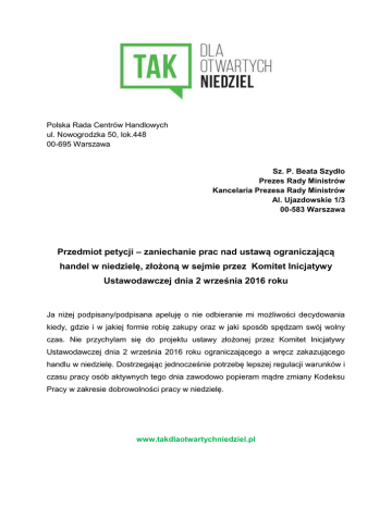 Polska Rada Centrów Handlowych ul. Nowogrodzka 50, lok.448 00-695 Warszawa Sz. P. Beata Szydło Prezes Rady Ministrów Kancelaria Prezesa Rady Ministrów Al. Ujazdowskie 1/3 00-583 Warszawa Przedmiot petycji – zaniechanie prac nad ustawą ograniczającą handel w niedzielę, złożoną w sejmie przez Komitet Inicjatywy Ustawodawczej dnia 2 września 2016 roku Ja niżej podpisany/podpisana apeluję o nie odbieranie mi możliwości decydowania kiedy, gdzie i w jakiej formie robię zakupy oraz w jaki sposób spędzam swój wolny czas. Nie przychylam się do projektu ustawy złożonej przez Komitet Inicjatywy Ustawodawczej dnia 2 września 2016 roku ograniczającego a wręcz zakazującego handlu w niedzielę. Dostrzegając jednocześnie potrzebę lepszej regulacji warunków i czasu pracy osób aktywnych tego dnia zawodowo popieram mądre zmiany Kodeksu Pracy w zakresie dobrowolności pracy w niedzielę. www.takdlaotwartychniedziel.pl Lp. Imię i nazwisko Adres Kod miejscowość ulica numer domu www.takdlaotwartychniedziel.pl Podpis