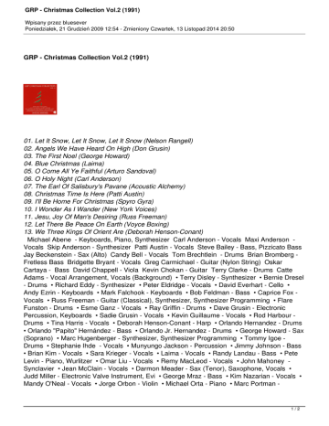 GRP - Christmas Collection Vol.2 (1991) Wpisany przez bluesever Poniedziałek, 21 Grudzień 2009 12:54 - Zmieniony Czwartek, 13 Listopad 2014 20:50 GRP - Christmas Collection Vol.2 (1991) 01. Let It Snow, Let It Snow, Let It Snow (Nelson Rangell) 02. Angels We Have Heard On High (Don Grusin) 03. The First Noel (George Howard) 04. Blue Christmas (Laima) 05. O Come All Ye Faithful (Arturo Sandoval) 06. O Holy Night (Carl Anderson) 07. The Earl Of Salisbury's Pavane (Acoustic Alchemy) 08. Christmas Time Is Here (Patti Austin) 09. I'll Be Home For Christmas (Spyro Gyra) 10. I Wonder As I Wander (New York Voices) 11. Jesu, Joy Of Man's Desiring (Russ Freeman) 12. Let There Be Peace On Earth (Voyce Boxing) 13. We Three Kings Of Orient Are (Deborah Henson-Conant) Michael Abene - Keyboards, Piano, Synthesizer Carl Anderson - Vocals Maxi Anderson Vocals Skip Anderson - Synthesizer Patti Austin - Vocals Steve Bailey - Bass, Pizzicato Bass Jay Beckenstein - Sax (Alto) Candy Bell - Vocals Tom Brechtlein - Drums Brian Bromberg Fretless Bass Bridgette Bryant - Vocals Greg Carmichael - Guitar (Nylon String) Oskar Cartaya - Bass David Chappell - Viola Kevin Chokan - Guitar Terry Clarke - Drums Catte Adams - Vocal Arrangement, Vocals (Background) • Terry Disley - Synthesizer • Bernie Dresel - Drums • Richard Eddy - Synthesizer • Peter Eldridge - Vocals • David Everhart - Cello • Andy Ezrin - Keyboards • Mark Falchook - Keyboards • Bob Feldman - Bass • Caprice Fox Vocals • Russ Freeman - Guitar (Classical), Synthesizer, Synthesizer Programming • Flare Funston - Drums • Esme Ganz - Vocals • Ray Griffin - Drums • Dave Grusin - Electronic Percussion, Keyboards • Sadie Grusin - Vocals • Kevin Guillaume - Vocals • Rod Harbour Drums • Tina Harris - Vocals • Deborah Henson-Conant - Harp • Orlando Hernandez - Drums • Orlando "Papito" Hernández - Bass • Orlando Jr. Hernandez - Drums • George Howard - Sax (Soprano) • Marc Hugenberger - Synthesizer, Synthesizer Programming • Tommy Igoe Drums • Stephanie Ihde - Vocals • Munyungo Jackson - Percussion • Jimmy Johnson - Bass • Brian Kim - Vocals • Sara Krieger - Vocals • Laima - Vocals • Randy Landau - Bass • Pete Levin - Piano, Wurlitzer • Omar Liu - Vocals • Remy MacLeod - Vocals • John Mahoney Synclavier • Jean McClain - Vocals • Darmon Meader - Sax (Tenor), Saxophone, Vocals • Judd Miller - Electronic Valve Instrument, Evi • George Mraz - Bass • Kim Nazarian - Vocals • Mandy O'Neal - Vocals • Jorge Orbon - Violin • Michael Orta - Piano • Marc Portman - 1/2 GRP - Christmas Collection Vol.2 (1991) Wpisany przez bluesever Poniedziałek, 21 Grudzień 2009 12:54 - Zmieniony Czwartek, 13 Listopad 2014 20:50 Keyboards • Alexander Prilutchi - Violin • Nelson Rangell - Piccolo • Dave Ratajczak - Drums • Steve Reid - Percussion • Joel Rosenblatt - Drums • Dave Samuels - Mallet Synthesizer, Synthesizer, Vibraphone • Arturo Sandoval - Piccolo Trumpet, Trumpet • Tom Schuman Piano • Daryl Smith - Keyboards • Dwayne Smith - Bass (Electric) • Leslie Smith - Vocals • Larry Steelman - Keyboards, Piano • Anjani Thomas - Vocals • Katherine Upton - Vocals • Nick Webb - Guitar (Steel) • Andre Woodert - Vocals • Sasha Zatolokin - Vocals If you loved the first one, you'll love this too. ---David A. Milberg, Rovi download: uploaded io m yandex 4shared mediafire mega solidfiles zalivalka cloudmailru filecloud oboo back 2/2