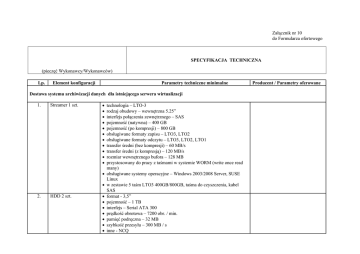 Załącznik nr 10 do Formularza ofertowego SPECYFIKACJA TECHNICZNA (pieczęć Wykonawcy/Wykonawców) Lp. Element konfiguracji Parametry techniczne minimalne Dostawa systemu archiwizacji danych dla istniejącego serwera wirtualizacji 1. Streamer 1 szt. • • • • • • • • • • • • • 2. HDD 2 szt. • • • • • • • technologia – LTO-3 rodzaj obudowy – wewnętrzna 5.25” interfejs połączenia zewnętrznego – SAS pojemność (natywna) – 400 GB pojemność (po kompresji) – 800 GB obsługiwane formaty zapisu – LTO3, LTO2 obsługiwane formaty odczytu – LTO3, LTO2, LTO1 transfer średni (bez kompresji) – 60 MB/s transfer średni (z kompresją) – 120 MB/s rozmiar wewnętrznego bufora – 128 MB przystosowany do pracy z taśmami w systemie WORM (write once read many) obsługiwane systemy operacyjne – Windows 2003/2008 Server, SUSE Linux w zestawie 5 taśm LTO3 400GB/800GB, taśma do czyszczenia, kabel SAS format - 3,5” pojemność – 1 TB interfejs – Serial ATA 300 prędkość obrotowa – 7200 obr. / min. pamięć podręczna – 32 MB szybkość przesyłu – 300 MB / s inne - NCQ Producent / Parametry oferowane 3. Inne elementy wymagane do budowy systemu backup 4. Wymagania dotyczące zasad backup • • • • • • • • • • • 5. Wymagane prace instalacyjne • • • • • • • • • kontroler FC PCI-X 4 GB/s kontroler SAS PCI-X kabel FC LC – LC kabel SAS wykonywanie kopii za pomocą oprogramowania VMware Consolidated Backup wykonywanie kopii bezpieczeństwa na istniejącym serwerze przeznaczonym do archiwizacji brak obciążenia na serwerach ESX podczas wykonywania kopii na serwer archiwizacyjny archiwizacja w postaci obrazów maszyn wirtualnych wykorzystywanie technologii "Snapshot" podczas wykonywania kopii dla zminimalizowania przestojów serwerów produkcyjnych minimalizacja obciążenia sieci poprzez wykonywanie kopii przez sieć SAN możliwość integracji VMware Consolidated Backup z oprogramowaniem innych producentów przenoszenie kopii z dysku serwera na taśmę streamera instalacja karty Fibre Channel w serwerze archiwizacyjnym instalacja dysków twardych w serwerze archiwizacyjnym instalacja napędu taśmowego w serwerze archiwizacyjnym. konfiguracja zonningu w switchu Fibre Channel dla zapewnienia dostępu do sieci SAN dla serwera archiwizacji konfiguracja macierzy dyskowej dla zapewnienia dostępu do dysków logicznych macierzy dla serwera archiwizacji instalacja oprogramowania VMware Consolidated Backup na serwerze archiwizacyjnym konfiguracja skryptów do wykonywania kopii maszyn wirtualnych na dysk serwera poprzez sieć SAN konfiguracja istniejącego oprogramowania do archiwizacji dla przenoszenia kopii z dysków na taśmę ………………………………………… Podpis osoby (osób) uprawnionej(ych) do reprezentowania Wykonawcy