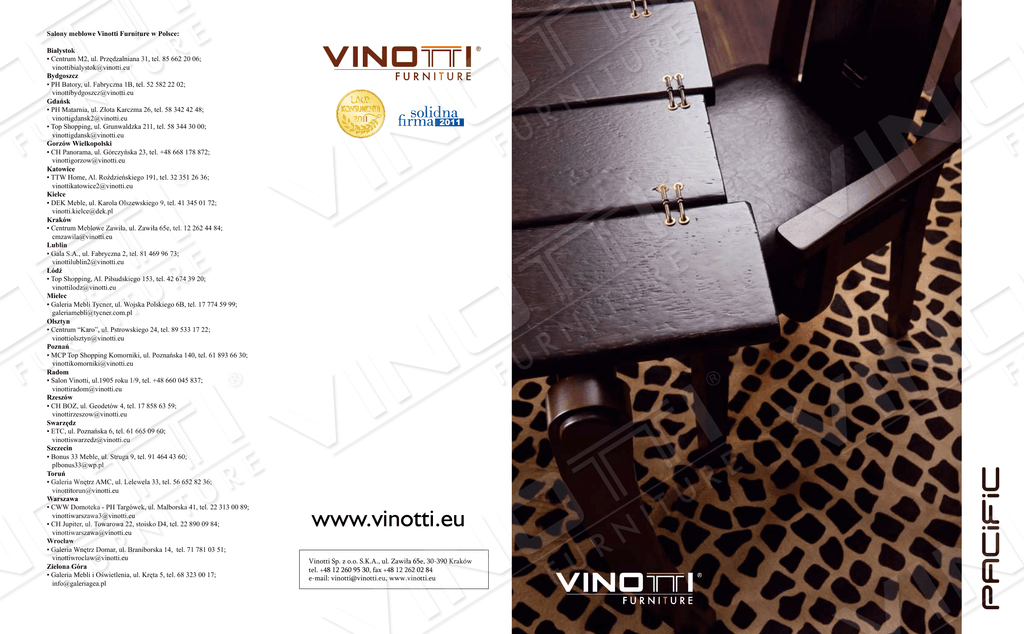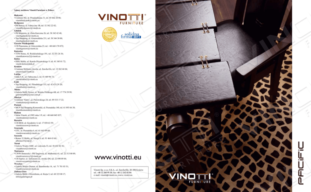 Białystok ▪ Centrum M2, ul. Przędzalniana 31, tel. 85 662 20 06; [email protected] Bydgoszcz ▪ PH Batory, ul. Fabryczna 1B, tel. 52 582 22 02; [email protected] Gdańsk ▪ PH Matarnia, ul. Złota Karczma 26, tel. 58 342 42 48; [email protected] ▪ Top Shopping, ul. Grunwaldzka 211, tel. 58 344 30 00; [email protected] Gorzów Wielkopolski ▪ CH Panorama, ul. Górczyńska 23, tel. +48 668 178 872; [email protected] Katowice ▪ TTW Home, Al. Roździeńskiego 191, tel. 32 351 26 36; [email protected] Kielce ▪ DEK Meble, ul. Karola Olszewskiego 9, tel. 41 345 01 72; [email protected] Kraków ▪ Centrum Meblowe Zawiła, ul. Zawiła 65e, tel. 12 262 44 84; [email protected] Lublin ▪ Gala S.A., ul. Fabryczna 2, tel. 81 469 96 73; [email protected] Łódź ▪ Top Shopping, Al. Piłsudskiego 153, tel. 42 674 39 20; [email protected] Mielec ▪ Galeria Mebli Tycner, ul. Wojska Polskiego 6B, tel. 17 774 59 99; [email protected] Olsztyn ▪ Centrum “Karo”, ul. Pstrowskiego 24, tel. 89 533 17 22; [email protected] Poznań ▪ MCP Top Shopping Komorniki, ul. Poznańska 140, tel. 61 893 66 30; [email protected] Radom ▪ Salon Vinotti, ul.1905 roku 1/9, tel. +48 660 045 837; [email protected] Rzeszów ▪ CH BOZ, ul. Geodetów 4, tel. 17 858 63 59; [email protected] Swarzędz ▪ ETC, ul. Poznańska 6, tel. 61 665 09 60; [email protected] Szczecin ▪ Bonus 33 Meble, ul. Struga 9, tel. 91 464 43 60; [email protected] Toruń ▪ Galeria Wnętrz AMC, ul. Lelewela 33, tel. 56 652 82 36; [email protected] Warszawa ▪ CWW Domoteka - PH Targówek, ul. Malborska 41, tel. 22 313 00 89; [email protected] ▪ CH Jupiter, ul. Towarowa 22, stoisko D4, tel. 22 890 09 84; [email protected] Wrocław ▪ Galeria Wnętrz Domar, ul. Braniborska 14, tel. 71 781 03 51; [email protected] Zielona Góra ▪ Galeria Mebli i Oświetlenia, ul. Kręta 5, tel. 68 323 00 17; [email protected] www.vinotti.eu Vinotti Sp. z o.o. S.K.A., ul. Zawiła 65e, 30-390 Kraków tel. +48 12 260 95 30, fax +48 12 262 02 84 e-mail: [email protected], www.vinotti.eu pacific Salony meblowe Vinotti Furniture w Polsce: 2-3 4-5 6-7 8-9 10-11 12-13 14-15 16-17 18-19 20-21 22-23 pacific pacific Nr 18 lustro / mirror s/w 1620mm; g/d 35mm; w/h 1120mm Nr 14 ława / coffee table d/l 1370; s/w 835; w/h 420mm Nr 15 stolik boczny / side table d/l 700; s/w 485; w/h 610mm Nr 9 stół obiadowy / dining table d/l 2280; s/w 1100; w/h 770mm Nr 17 komoda 6-szufl. / 6 drawer chest s/w 1800; g/d 480; w/h 900mm Nr 13 stolik TV / TV cabinet s/w 2000; g/d 580; w/h 510mm Nr 16 fotel / armchair s/w 640mm; g/d 850mm; w/h 1050mm Nr 10 stół obiadowy / dining table d/l 1500; s/w 900; w/h 760mm Nr 11 krzesło z podł. / chair with arm s/w 620; g/d 570; w/h 1010mm Nr 12 krzesło / chair s/w 470; g/d 570; w/h 1010mm Nr 21 bufet 4-drzw. / 4 door buffet s/w 1620; g/d 440; w/h 1200mm Nr 22 regał / wall rack s/w 1370; g/d 380; w/h 1800mm Nr 25 ścianka działowa / hall divider s/w 1695; g/d 300; w/h 1950mm 24-25 pacific pacific Nr 3 stolik nocny / night stand s/w 700; g/d 410; w/h 430mm Nr 1 łóżko 160 / bed 160 d/l 2150; s/w 1780; w/h 1000mm Nr 30 kwietnik / flower stand s/w 250; g/d 250; w/h 780mm Nr 29 kwietnik / flower stand s/w 200; g/d 200; w/h 580mm Nr 28 kwietnik / flower stand s/w 300; g/d 300; w/h 360mm Nr 2 łóżko 180 / bed 180 d/l 2150; s/w 1980; w/h 1000mm Nr 20 krzesło barowe / bar chair s/w 420mm; g/d 490mm; w/h 830mm Nr 5 lustro do toaletki/ dressing mirror s/w 1200mm; g/d 25mm; w/h 1120mm Nr 24 lustro / mirror 730; g/d 20mm Nr 7 szafa 2-drzw. / 2 door wardrobe Nr 4 toaletka / dresser d/l 1670; s/w 440; w/h 910mm Nr 19 lada barowa / bar counter d/l 2300; s/w 830; w/h 2000mm Nr 7 / Nr 8 szafa 2-drzw. / 2 door wardrobe s/w 870; g/d 570; w/h 2000mm Nr 6 taboret do toaletki / dressing table stool s/w 690; g/d 350; w/h 540mm Nr 8 szafa 2-drzw. z półkami / 2 door wardrobe with shelves Nr 23 konsola / console table d/l 1370; s/w 490; w/h 910mm www.vinotti.eu s/w - szerokość / width g/d - głębokość / depth w/h - wysokość / height d/l - długość / length Właścicielem znaku towarowego Vinotti Furniture jest firma Vinotti Sp. z o.o. S.K.A. Firma Vinotti zastrzega sobie prawo do błędów edytorskich. Zdjęcia produktów mogą nieznacznie odbiegać od rzeczywistości. Podane wymiary są wartościami zewnętrznymi. Niniejszy katalog nie stanowi oferty w rozumieniu prawnym i jest publikowany jedynie w celach informacyjnych. Vinotti Furniture is registered trademark owned by Vinotti Sp. z o.o. S.K.A. Vinotti company reserves the right to publishing mistakes. Photos does not reflect precisely appearance of furniture. All dimensions written in catalogue are external. This catalogue is not making the offer in the legal understanding and is being published exclusively for information purposes. styl. Aneta Kosiba, fot. Marcin Urban, graf. Robert Tomczyk v.2/2010
