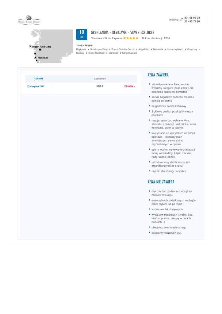 Infolinia 10 GRENLANDIA - REYKJAVIK - SILVER EXPLORER DNI Silversea - Silver Explorer 801 08 08 03 22 492 77 90 | Rok modernizacji: 2008 TRASA REJSU: Reykjavik Hvalsey TERMIN 22 sierpień 2017 Skoldungen Fjord Nuuk (Godthab) Prince Christian Sound Maniitsoq Nanortalik Uunartoq Island Qaqortoq CENA ZAWIERA Apartament 5985 € Aappillatoq Kangerlussuaq ZAMÓW > zakwaterowanie w 2-os. kabinie wybranej kategorii (cena zależy od położenia kabiny na pokładzie) serwis bagażowy podczas wejścia i zejścia ze statku 24-godzinny serwis kabinowy 3 główne posiłki, przekąski między posiłkami napoje: open bar: wybrane wina, alkohole, szampan, soft drinks, woda mineralna, barek w kabinie korzystanie ze wszystkich urządzeń sportowo – rekreacyjnych znajdujących się na statku (wymienionych w opisie) sporty wodne: nurkowanie z maską i rurką, windsurfing, kajaki morskie, narty wodne, banan udział we wszystkich imprezach organizowanych na statku napiwki dla obsługi na statku. CENA NIE ZAWIERA dojazdu do/z portów rozpoczęcia i zakończenia rejsu ewentualnych dodatkowych noclegów przed rejsem lub po rejsie wycieczek fakultatywnych wydatków osobistych (fryzjer, Spa, telefon, pralnia, zakupy w barach i butikach...) ubezpieczenia turystycznego kosztu wymaganych wiz.