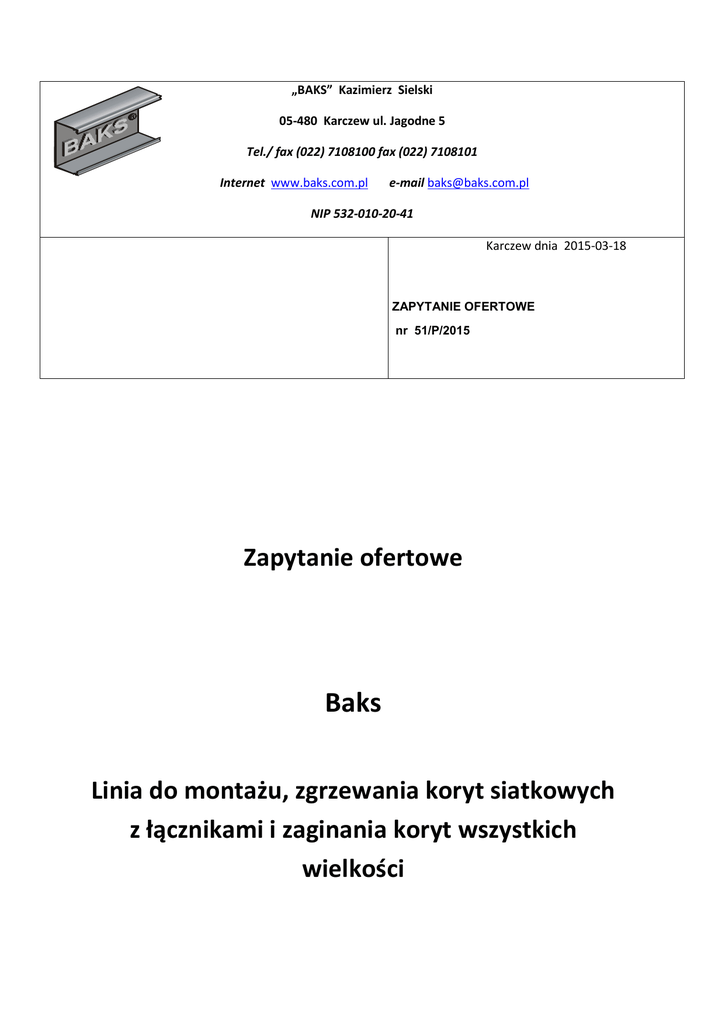 „BAKS” Kazimierz Sielski 05-480 Karczew ul. Jagodne 5 Tel./ fax (022) 7108100 fax (022) 7108101 Internet www.baks.com.pl e-mail [email protected] NIP 532-010-20-41 Karczew dnia 2015-03-18 ZAPYTANIE OFERTOWE nr 51/P/2015 Zapytanie ofertowe Baks Linia do montażu, zgrzewania koryt siatkowych z łącznikami i zaginania koryt wszystkich wielkości Zapytanie ofertowe dotyczy dostawy kompletnej linii do układania na formatkach z siatki drucianej łączników KLIK, zgrzewania łączników z siatką, zaginania formatki w kształt koryta, znakowania, pakowania i układania gotowych koryt siatkowych KLIK na palecie. Linia powinna składać się z: 1. 2. 3. 4. 5. Maszyny do układania formatek z łącznikami i zgrzewania obu elementów Maszyny do zaginania formatki w kształt koryta Maszyny do naklejania etykiet na gotowy produkt Maszyny do układania i pakowania gotowych wyrobów Urządzenia do transportu detali pomiędzy wszystkimi Linia przeznaczona do produkcji koryt siatkowych w systemie KLIK o następujących wymiarach: Długość elementów: 2 i 3m Wysokość : H35, 60, 110mm Szerokość: 35-600mm Grubości drutu: 3,5 – 6,0mm Rodzaj materiału: drut stal czarna, stal szlachetna 304 i 316 Sterowanie zaawansowane umożliwiające kontrole wszystkich pracujących części maszyny, proszę o przedstawienie wszystkich opcji sterowania. Wydajność: minimum 3 szt. produkowanych detali na minutę Sterowanie - ekran dotykowy TFT z kontrolą bezpieczeństwa i z kolorowym ekranem dotykowym wizualizacji, narzędzie do zarządzania danymi, systemy liczenia, transfer danych poprzez Profibus, Oferta powinna obejmować: Transport / instalacja / uruchomienie Warunki handlowe Termin dostawy: zakładamy, że pełny rozruch linii w BAKS powinien nastąpić najpóźniej w listopadzie 2015, dostawa urządzeń do BAKS do 10 lipca 2015 Warunki płatności: do uzgodnienia Gwarancja: 24 miesiące Wymagane oświadczenie, że urządzenie jest zgodne z wszystkimi przepisami bezpieczeństwa i obowiązującymi normami produktowymi UE. Oferty należy składać do dnia 31 marca 2015 r. do godz. 15.00 w formie elektronicznej na adres [email protected] oraz [email protected] , osobiście lub za pośrednictwem poczty/ kuriera w siedzibie BAKS przy ul. Jagodne 5, 05-480 Karczew. Oferty powinny mieć termin ważności co najmniej 60 dni. Szczegółowe informacje techniczne można uzyskać pod numerem telefonu 22 710 81 22. Cena w ofercie powinna zawierać wszystkie koszty związane z realizacją projektu. Prosimy o załączenie listy referencyjnej. Przy wyborze oferty pod uwagę będą brane następujące kryteria wyboru: 1. Jakość oferowanych rozwiązań – 50% 2. Serwis, gwarancja – 25% 3. Cena – 25% Zapytanie ofertowe zamieszczono również na stronie internetowej (www.baks.com.pl) oraz w siedzibie Zamawiającego – w Karczewie przy ul. Jagodne 5. Sporządził: Tomasz Włodarczyk Mariusz Trzaskowski tel. 501 28 18 17