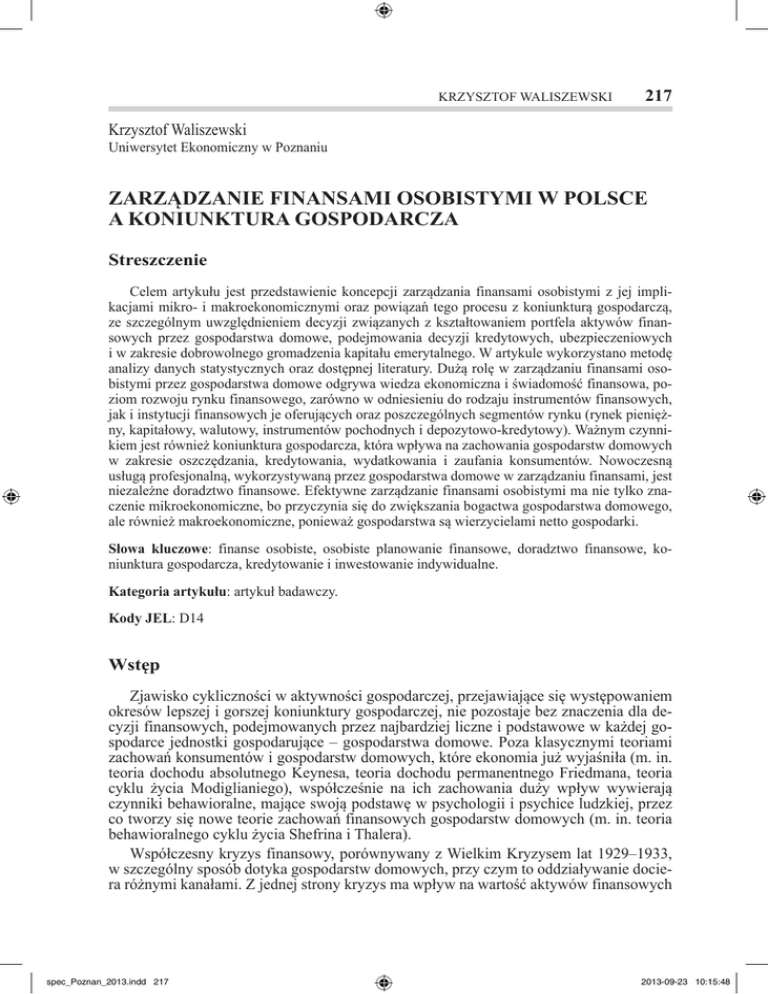 KRZYSZTOF WALISZEWSKI 217 Krzysztof Waliszewski Uniwersytet Ekonomiczny w Poznaniu ZARZĄDZANIE FINANSAMI OSOBISTYMI W POLSCE A KONIUNKTURA GOSPODARCZA Streszczenie Celem artykułu jest przedstawienie koncepcji zarządzania finansami osobistymi z jej implikacjami mikro- i makroekonomicznymi oraz powiązań tego procesu z koniunkturą gospodarczą, ze szczególnym uwzględnieniem decyzji związanych z kształtowaniem portfela aktywów finansowych przez gospodarstwa domowe, podejmowania decyzji kredytowych, ubezpieczeniowych i w zakresie dobrowolnego gromadzenia kapitału emerytalnego. W artykule wykorzystano metodę analizy danych statystycznych oraz dostępnej literatury. Dużą rolę w zarządzaniu finansami osobistymi przez gospodarstwa domowe odgrywa wiedza ekonomiczna i świadomość finansowa, poziom rozwoju rynku finansowego, zarówno w odniesieniu do rodzaju instrumentów finansowych, jak i instytucji finansowych je oferujących oraz poszczególnych segmentów rynku (rynek pieniężny, kapitałowy, walutowy, instrumentów pochodnych i depozytowo-kredytowy). Ważnym czynnikiem jest również koniunktura gospodarcza, która wpływa na zachowania gospodarstw domowych w zakresie oszczędzania, kredytowania, wydatkowania i zaufania konsumentów. Nowoczesną usługą profesjonalną, wykorzystywaną przez gospodarstwa domowe w zarządzaniu finansami, jest niezależne doradztwo finansowe. Efektywne zarządzanie finansami osobistymi ma nie tylko znaczenie mikroekonomiczne, bo przyczynia się do zwiększania bogactwa gospodarstwa domowego, ale również makroekonomiczne, ponieważ gospodarstwa są wierzycielami netto gospodarki. Słowa kluczowe: finanse osobiste, osobiste planowanie finansowe, doradztwo finansowe, koniunktura gospodarcza, kredytowanie i inwestowanie indywidualne. Kategoria artykułu: artykuł badawczy. Kody JEL: D14 Wstęp Zjawisko cykliczności w aktywności gospodarczej, przejawiające się występowaniem okresów lepszej i gorszej koniunktury gospodarczej, nie pozostaje bez znaczenia dla decyzji finansowych, podejmowanych przez najbardziej liczne i podstawowe w każdej gospodarce jednostki gospodarujące – gospodarstwa domowe. Poza klasycznymi teoriami zachowań konsumentów i gospodarstw domowych, które ekonomia już wyjaśniła (m. in. teoria dochodu absolutnego Keynesa, teoria dochodu permanentnego Friedmana, teoria cyklu życia Modiglianiego), współcześnie na ich zachowania duży wpływ wywierają czynniki behawioralne, mające swoją podstawę w psychologii i psychice ludzkiej, przez co tworzy się nowe teorie zachowań finansowych gospodarstw domowych (m. in. teoria behawioralnego cyklu życia Shefrina i Thalera). Współczesny kryzys finansowy, porównywany z Wielkim Kryzysem lat 1929–1933, w szczególny sposób dotyka gospodarstw domowych, przy czym to oddziaływanie dociera różnymi kanałami. Z jednej strony kryzys ma wpływ na wartość aktywów finansowych spec_Poznan_2013.indd 217 2013-09-23 10:15:48 218 ZARZĄDZANIE FINANSAMI OSOBISTYMI W POLSCE... gospodarstw, szczególnie tych ulokowanych na giełdzie i w funduszach inwestycyjnych oraz na kwestie kredytowania (zmiana kursów walutowych, wzrost restrykcyjności banków, zalecenia nadzoru finansowego), a z drugiej dotyczy sfery realnej i dochodów ludności (wzrost bezrobocia). Koncepcja zarządzania finansami osobistymi Finanse osobiste, nazywane niekiedy zamiennie finansami gospodarstw domowych, mimo różnicy znaczeniowej to subdyscyplina nauk finansowych, wyróżniona według kryterium podmiotowego. Do niedawna dyscyplina ta była traktowana – zarówno w dydaktyce studiów ekonomicznych, jak i w piśmiennictwie ekonomicznym – pobocznie. Podejście zmienia się, a finansom gospodarstw domowych poświęca się badania naukowe i pozycje książkowe, tworzy kierunki studiów poświęcone zarządzaniu finansami osobistymi. Powstają też nowe nurty finansów osobistych takie jak finanse behawioralne czy nanofinanse (finanse codzienności). Osobiste planowanie finansowe (personal finance planning) obejmuje proces składający się z wielu czynności, mających na celu optymalizację finansów konsumenckich. Celem jest zaspokojenie potrzeb gospodarstwa domowego i poszczególnych jego członków, niezależność finansowa lub pomnażanie bogactwa. Proces rozpoczyna się od diagnozy sytuacji, czyli określenia zasobów, potrzeb i celów gospodarstwa oraz skonstruowania planu finansowego. Następnie poszukuje się różnych metod osiągnięcia celów, analizując je pod kątem kosztów i korzyści, w tym również ryzyka. Po dokonaniu wyboru odpowiedniego rozwiązania następuje realizacja planu finansowego przez zakup odpowiednich instrumentów finansowych. Kolejnym etapem jest porównanie wyników z założeniami i wyjaśnianie powstałych odchyleń. Narzędziami zarządzania finansami osobistymi są: osobisty bilans, osobisty rachunek zysków i strat oraz osobisty cash flow. Coraz częściej osobiste planowanie finansowe jest wspomagane przez programy komputerowe. Wzrost roli i konieczności zarządzania finansami osobistymi wynika z wielu czynników: wzrost dobrobytu społeczeństw, rosnące zaawansowanie produktów finansowych, brak czasu, specjalizacja zawodów finansowych1, niewydolność państwowych systemów emerytalnych i konieczność dobrowolnego oszczędzania na starość, wzrost wiedzy ekonomicznej i świadomości finansowej obywateli. Zarządzanie finansami może być wykonywane przez gospodarstwo domowe samodzielnie, ale wymaga odpowiednich kompetencji i wiedzy z zakresu ekonomii, finansów, umiejętności porównania aktualnych ofert rynkowych i wskazania różnic między nimi, a przez to jest procesem czasochłonnym. Na rynkach finansowych, w związku z coraz większą konkurencją i mnogością instrumentów finansowych, od lat 70. XX w. pojawiają się podmioty, które profesjonalnie zajmują się wspomaganiem decyzji konsumentów w zakresie finansów, we wszystkich wskazanych p